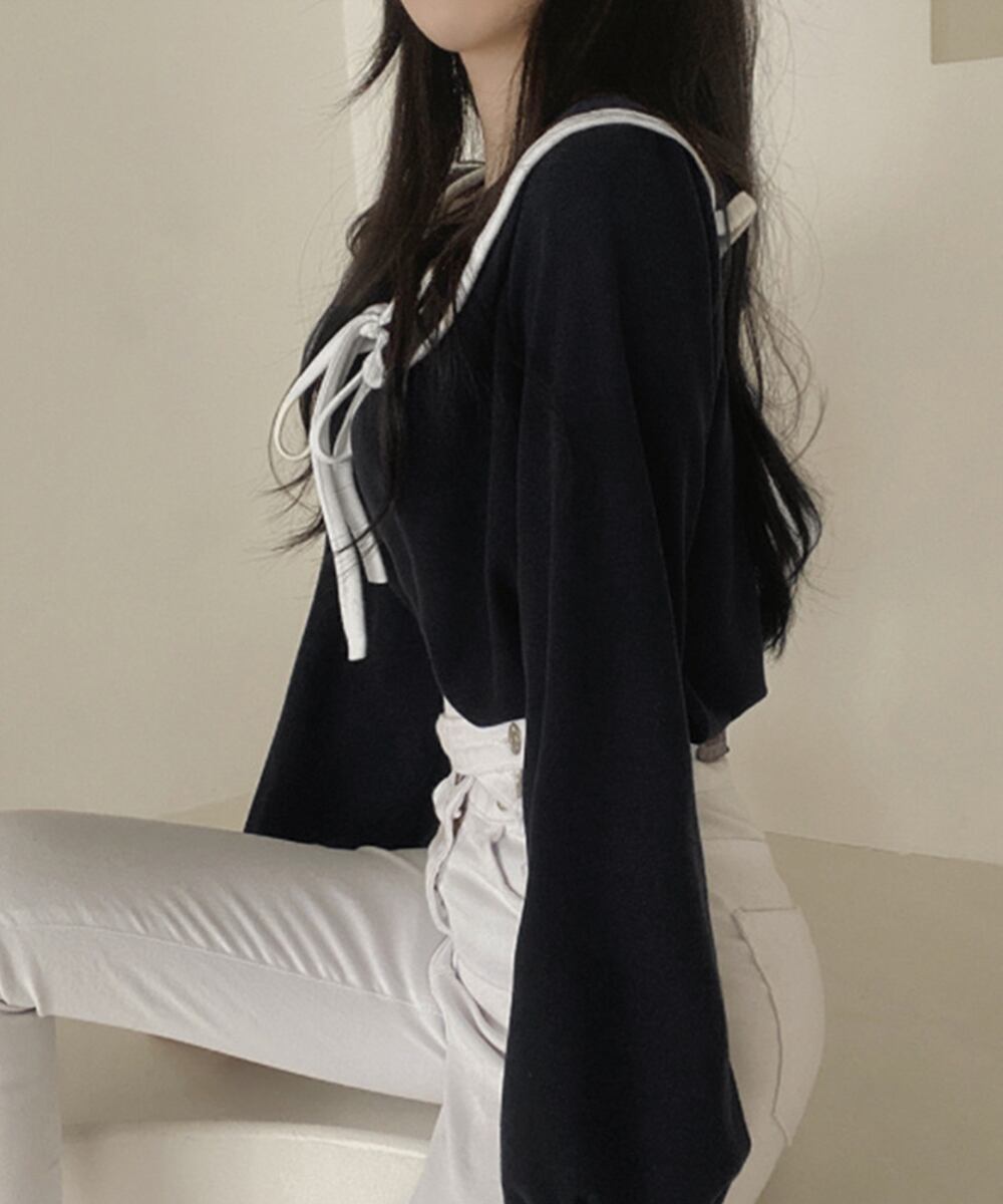 顔まわりを華やかに見せる大きめの襟と、きゅっと結んだリボンがフェミニンな印象に。