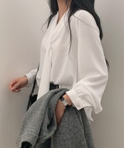 無駄のないシンプルなタイネックブラウス。