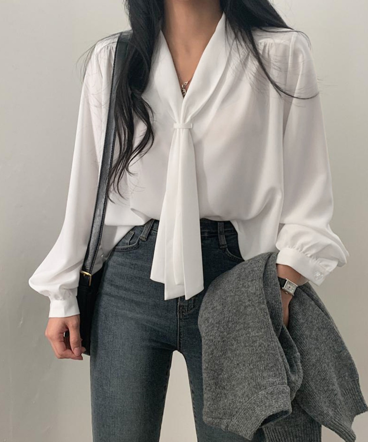 ロングタイはリボン結びでも、タイ風に束ねてもOK。気分やシーンに合わせてアレンジできる。