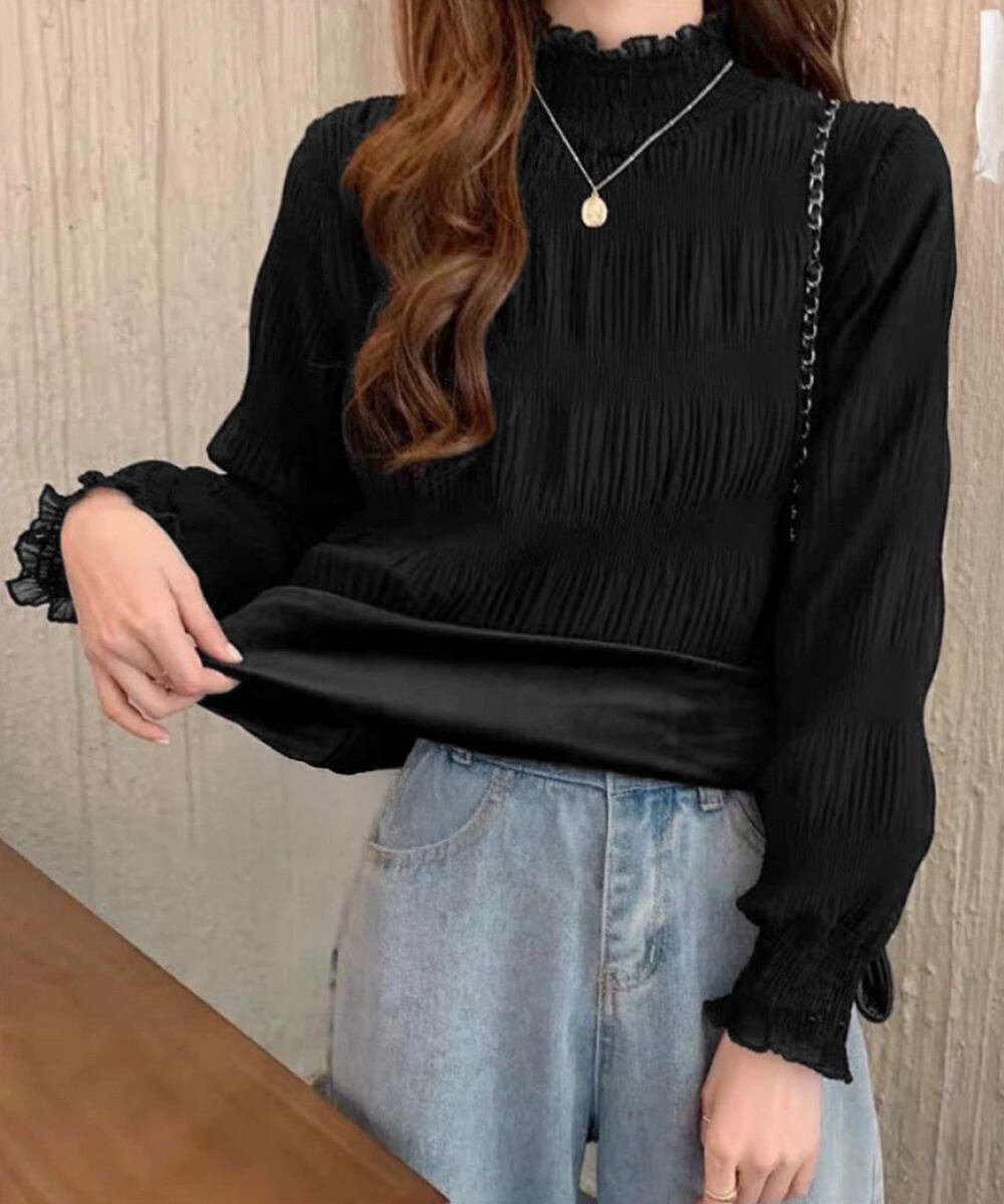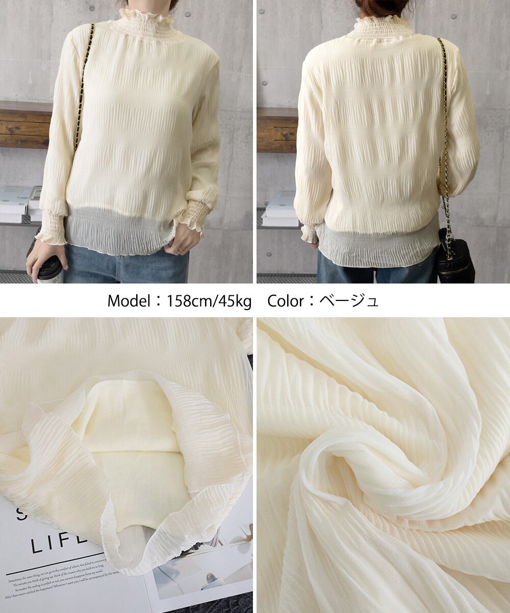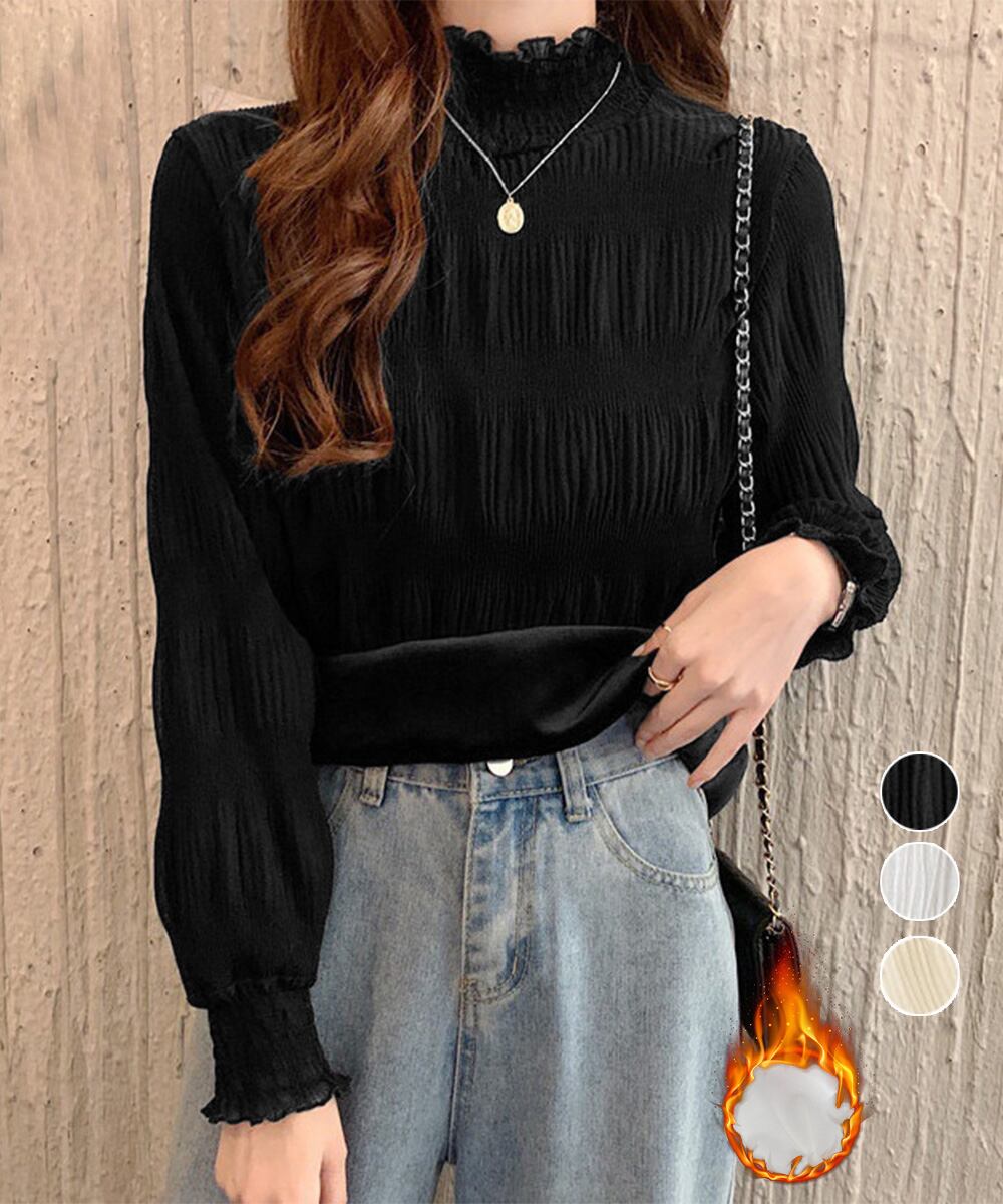 レディース 暖かいメロウフリルトップス ハイネックギャザーブラウス きれいめカジュアル 大人可愛い重ね着インナーあったか