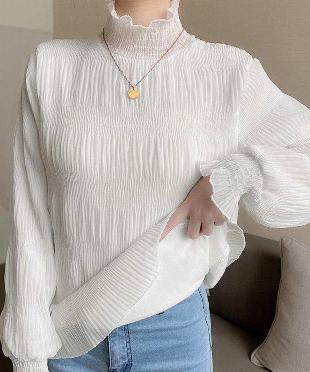 メロウフリルが首元と袖口を飾り、フェミニンな雰囲気を引き立てるハイネックブラウス。