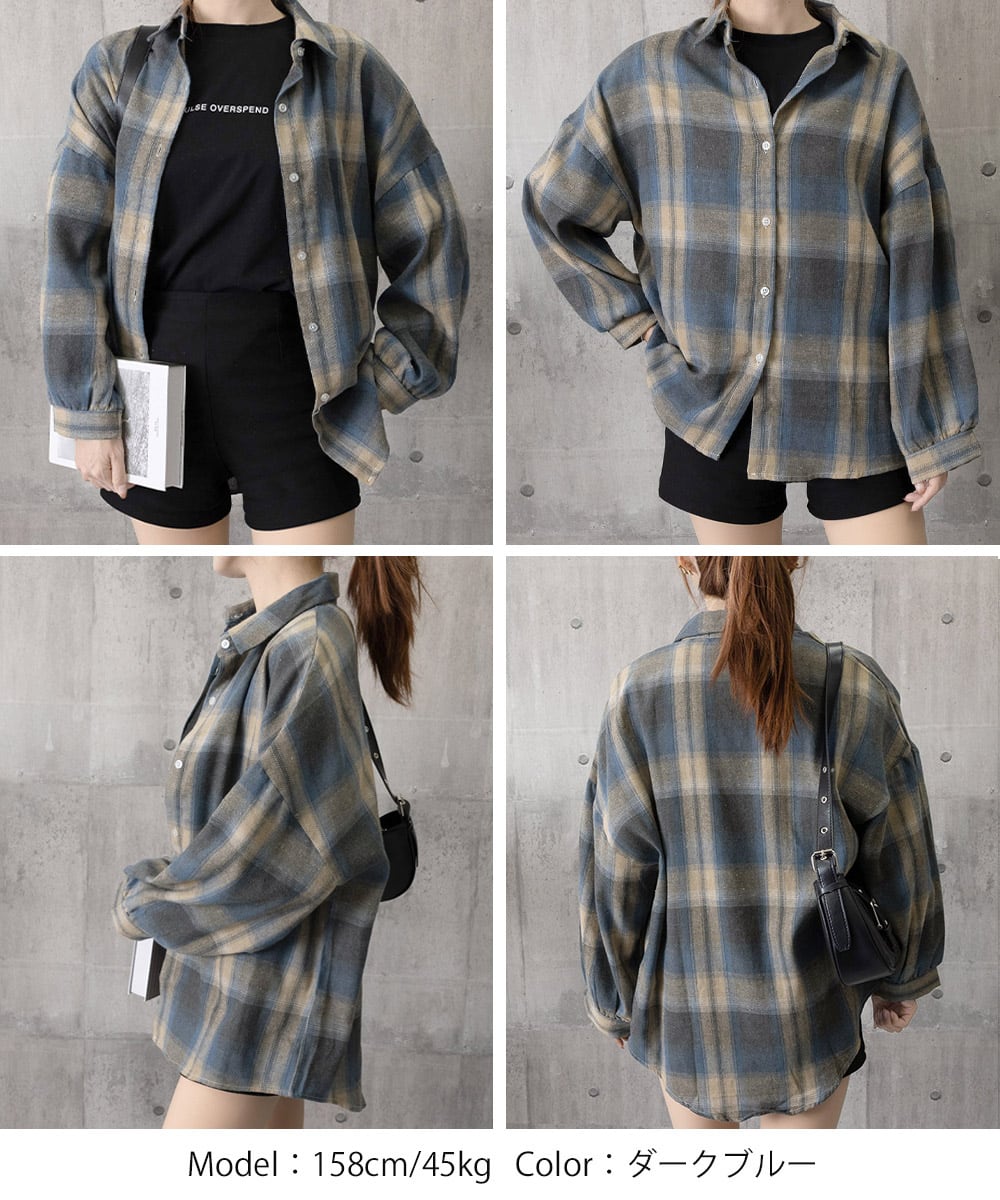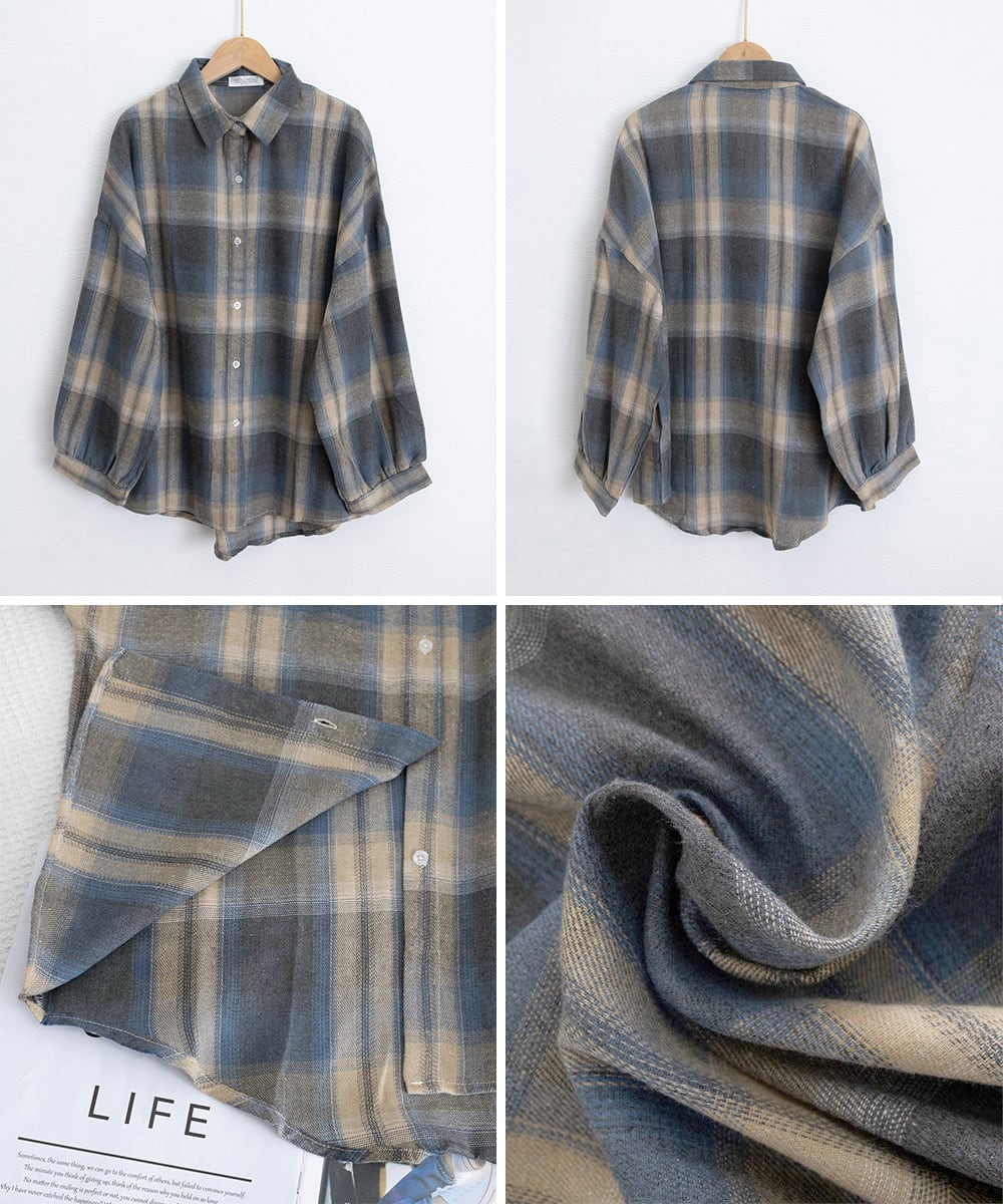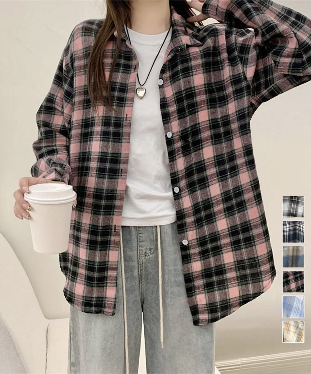 韓国風レトロデザインのオーバーサイズチェックシャツ。