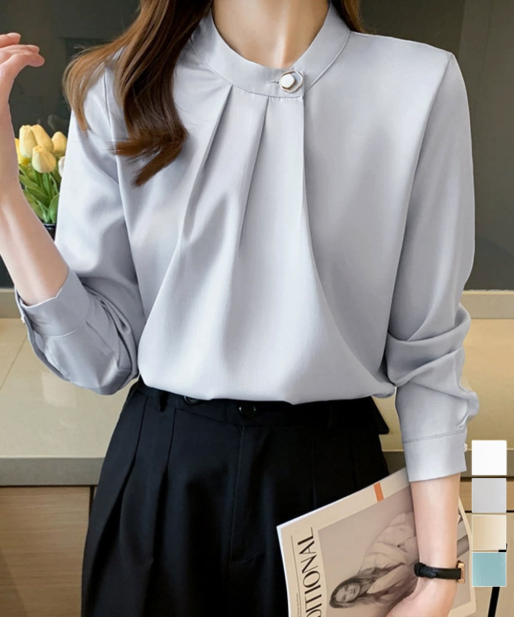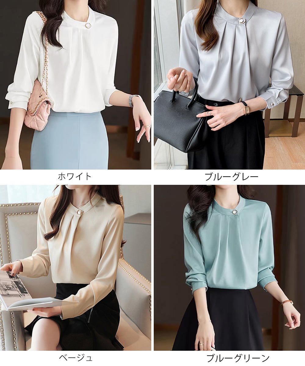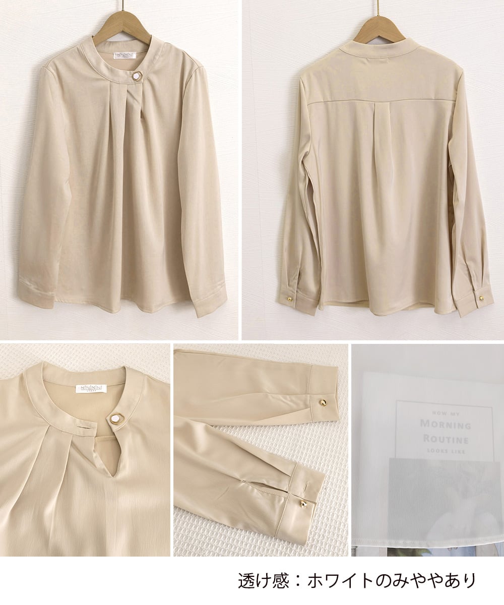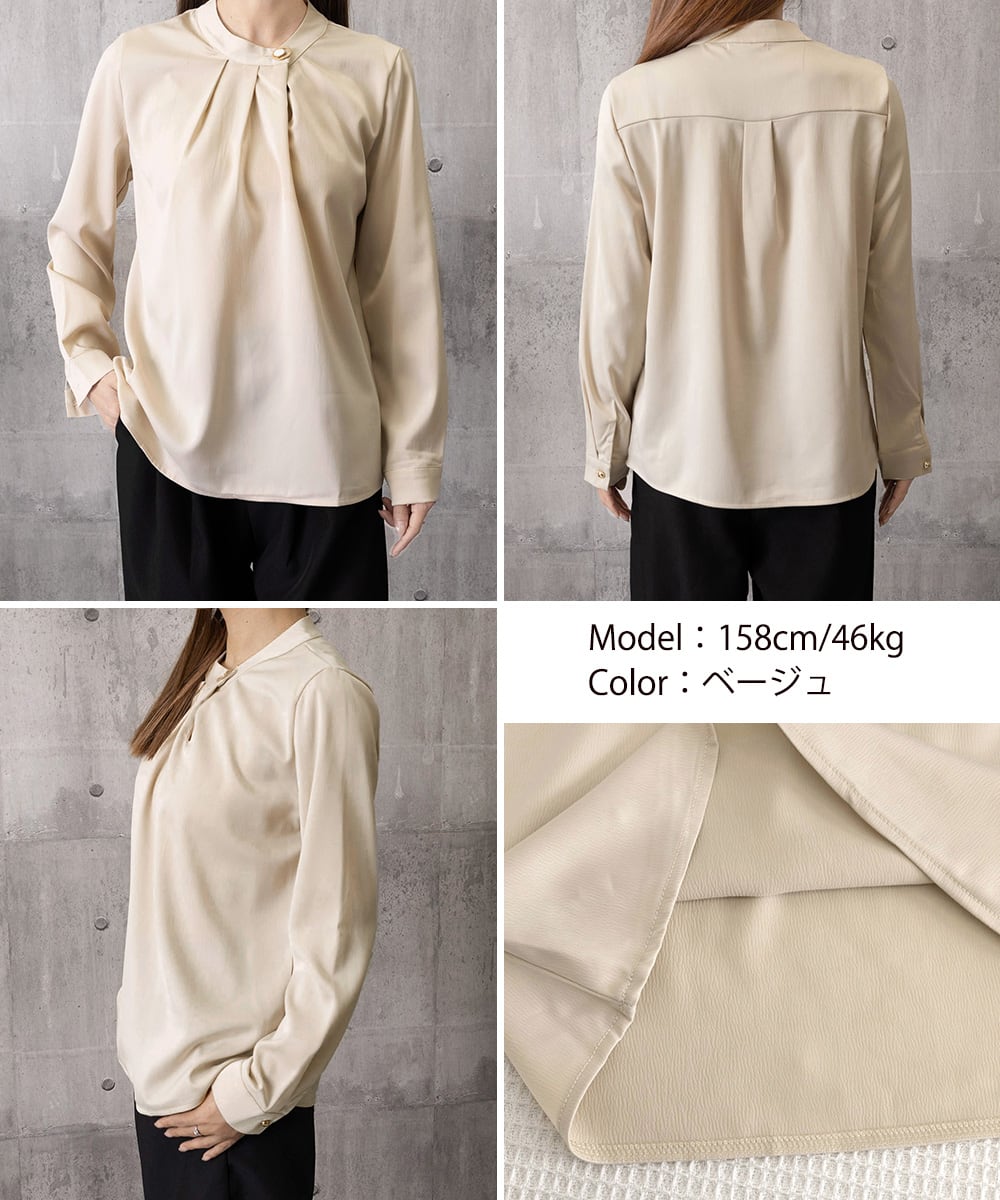 上品な立ち襟デザインが特徴の、きれいめシルク風ブラウス。