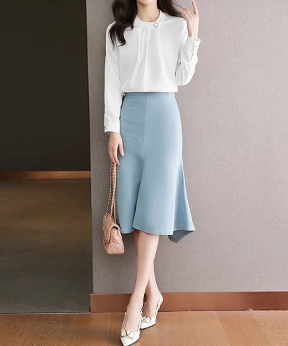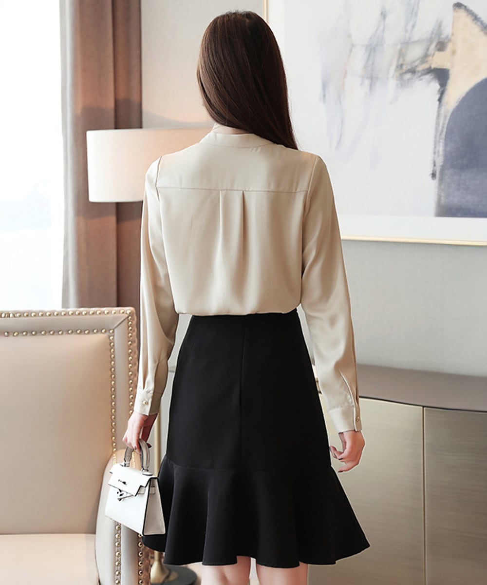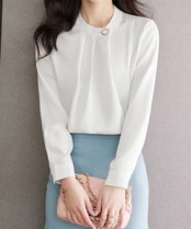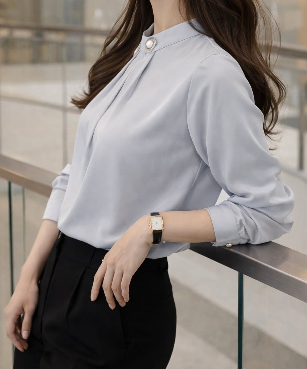 上品な立ち襟デザインが特徴の、きれいめシルク風ブラウス。