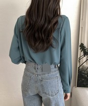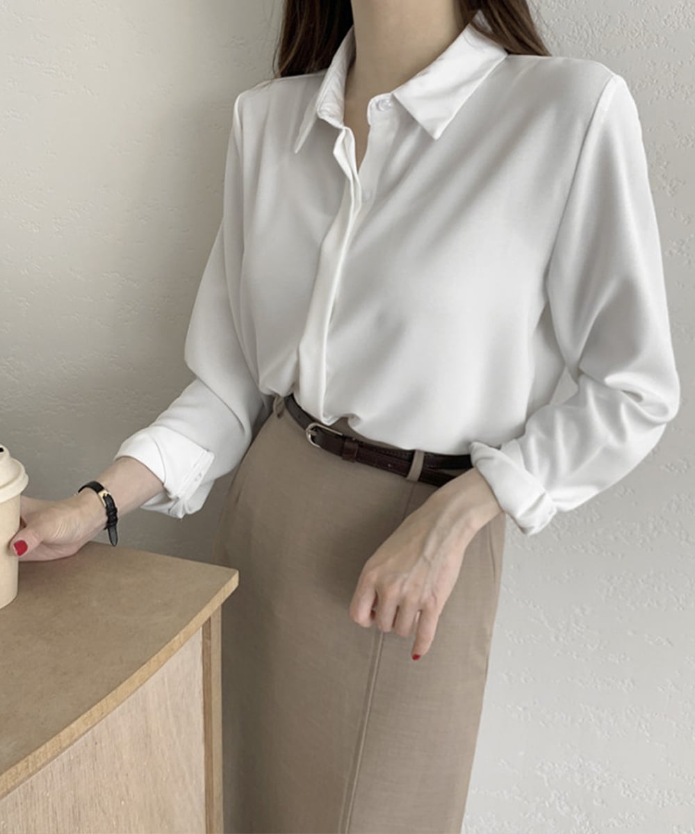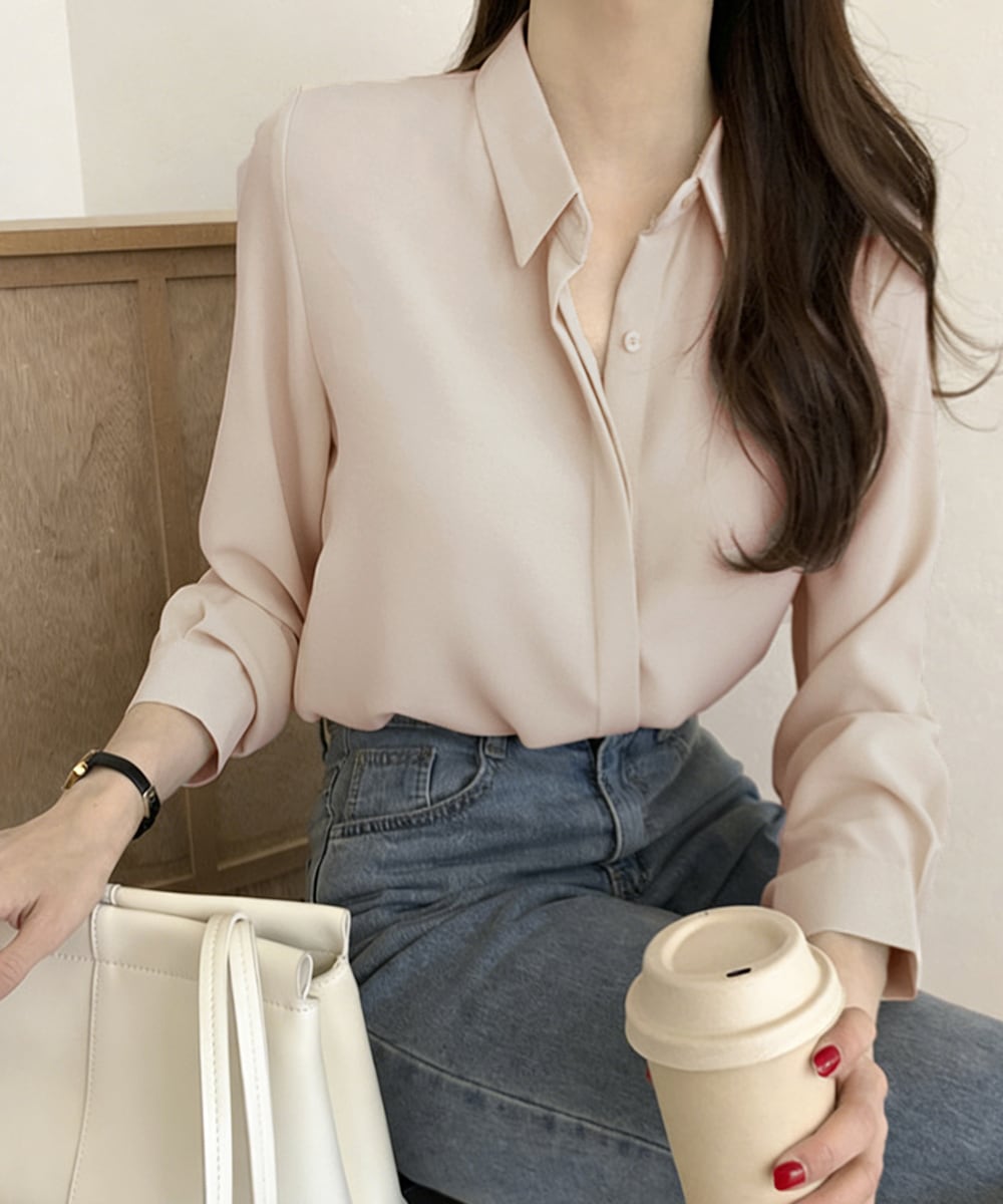 前立てのボタンが隠れたデザインのゆったりシルエットのブラウス。