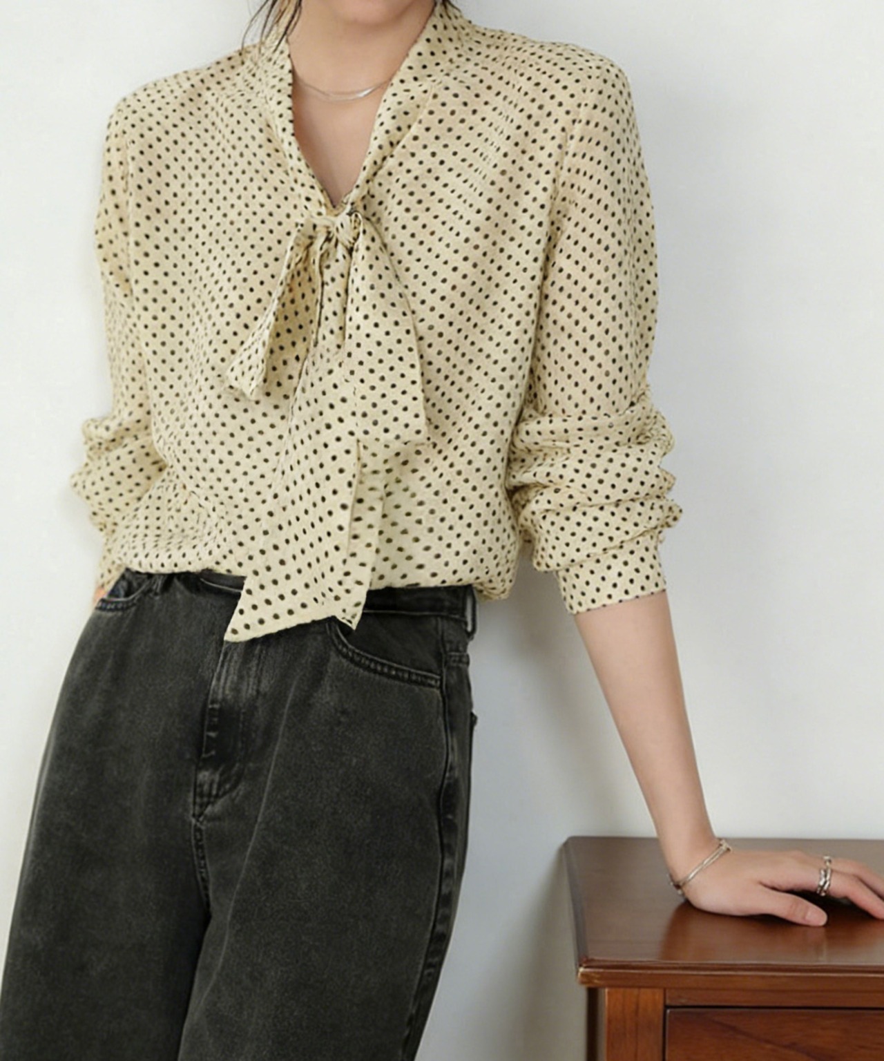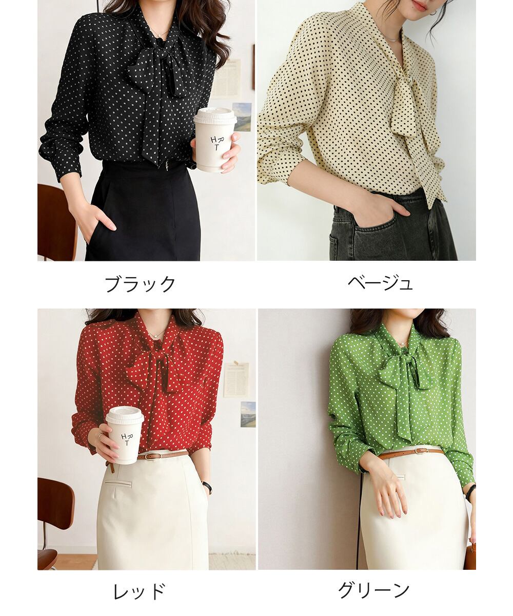 水玉柄が目を惹く、今期新作のレディース長袖リボンタイブラウス。