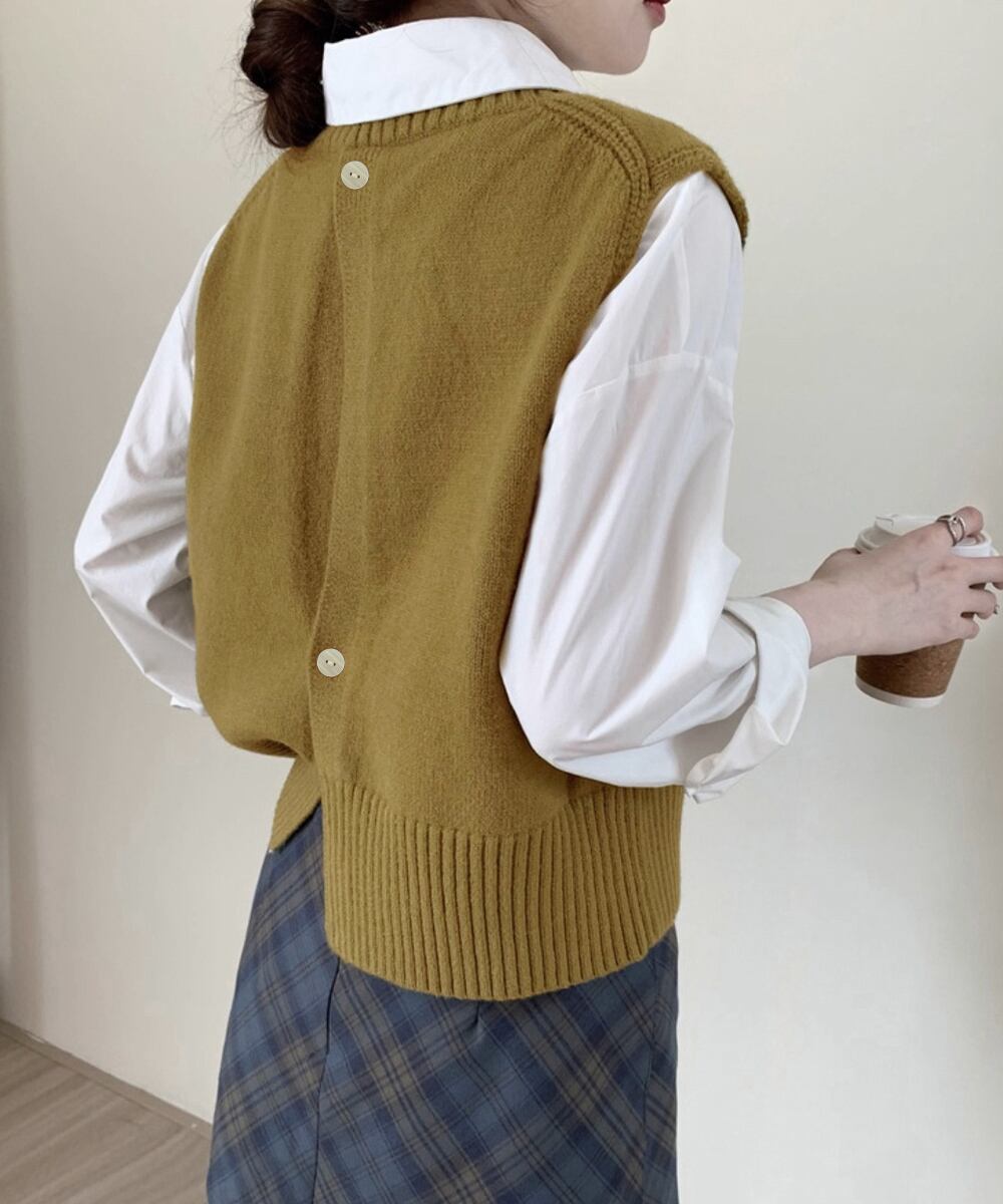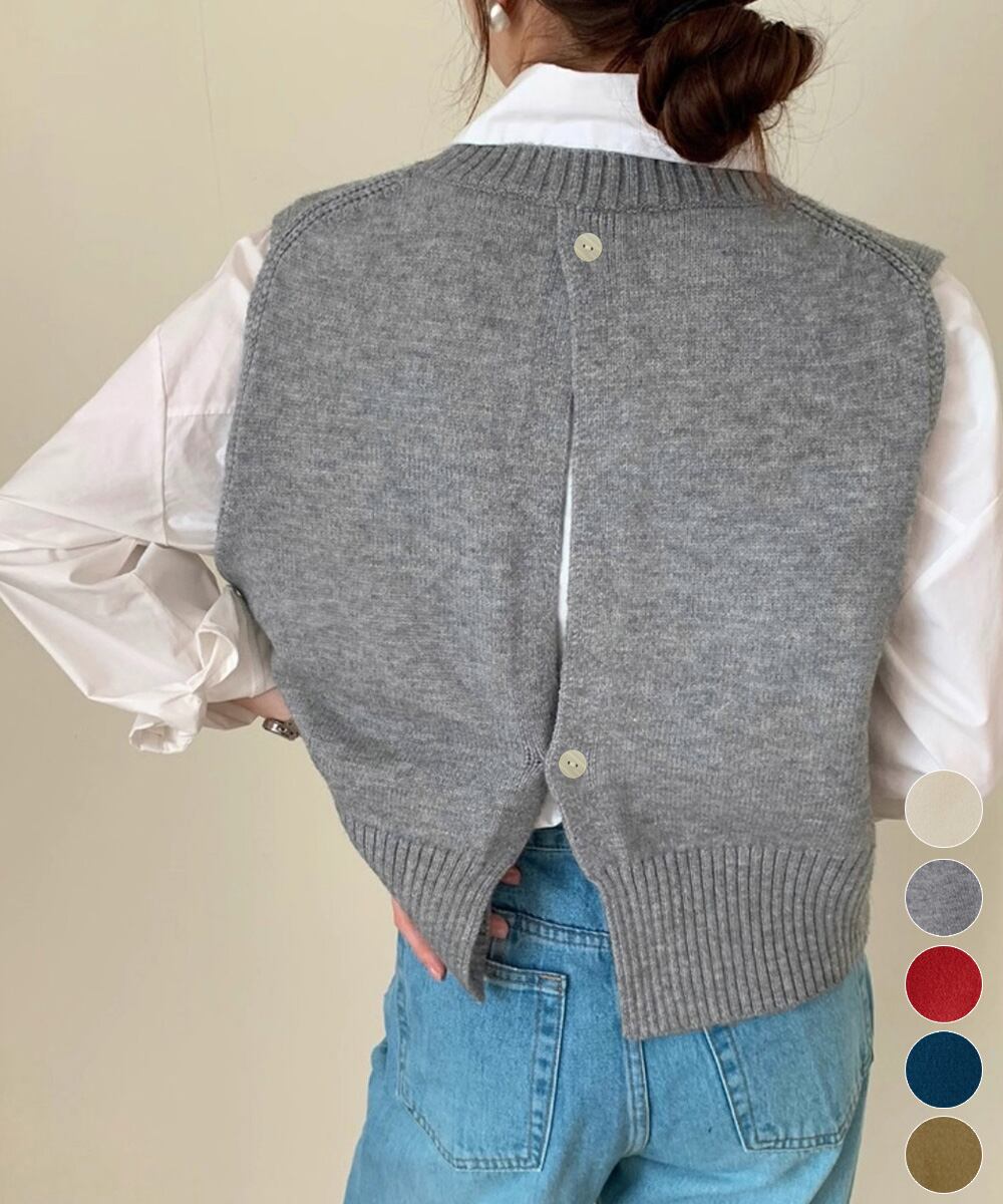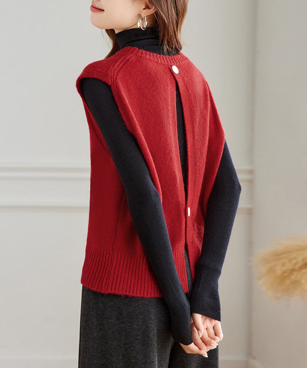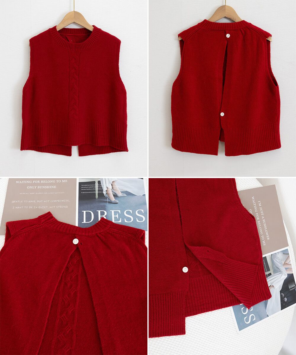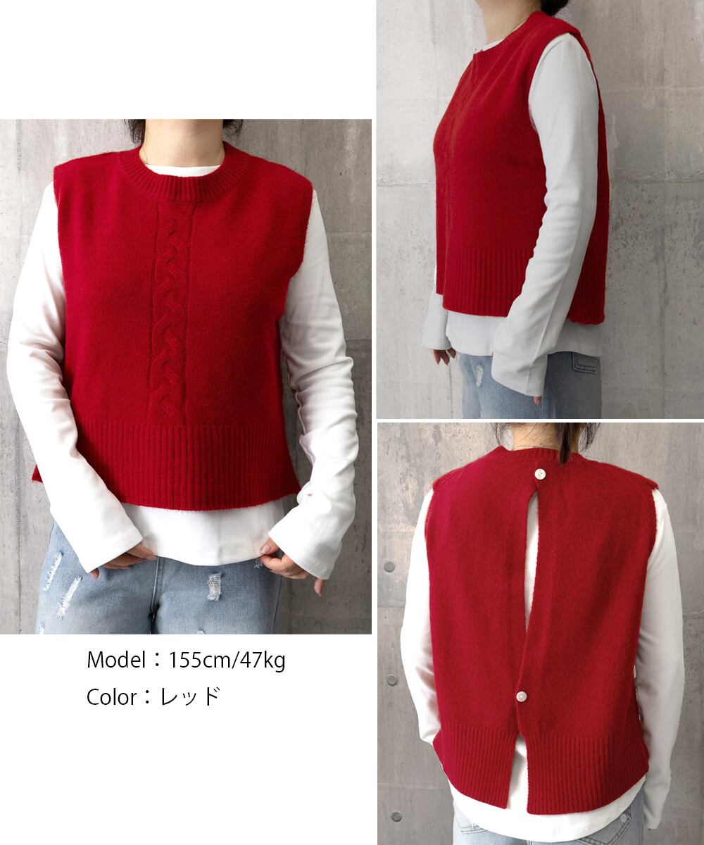 ケーブル編み ニットベスト バックボタン