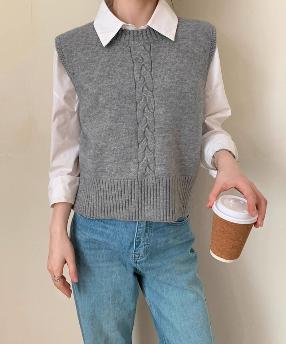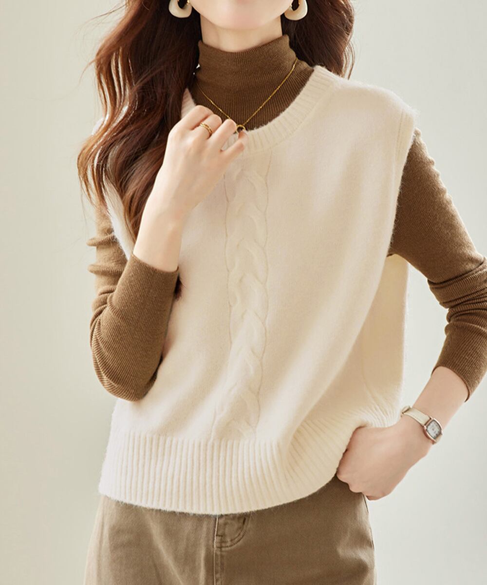 クラシカルな雰囲気漂うケーブル編みのニットベスト。