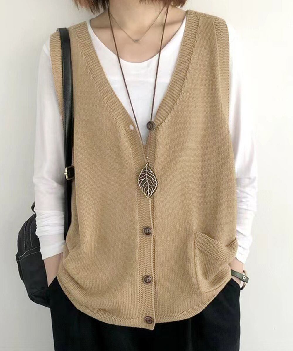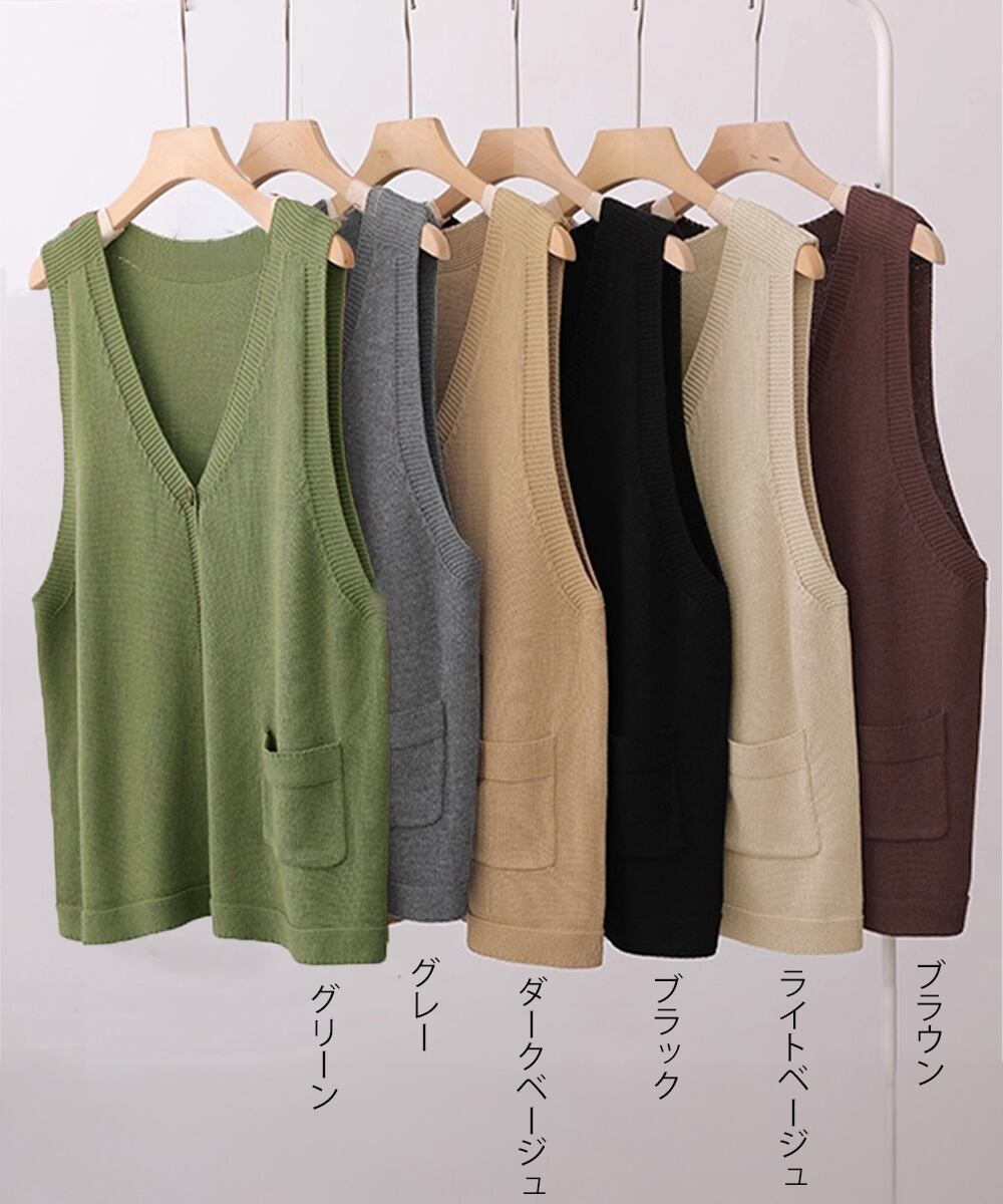 ポケット付きニットジレ Vネック ノースリーブニットトップス カジュアル レトロ ニットタンク 体型カバー春秋服 韓国風