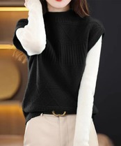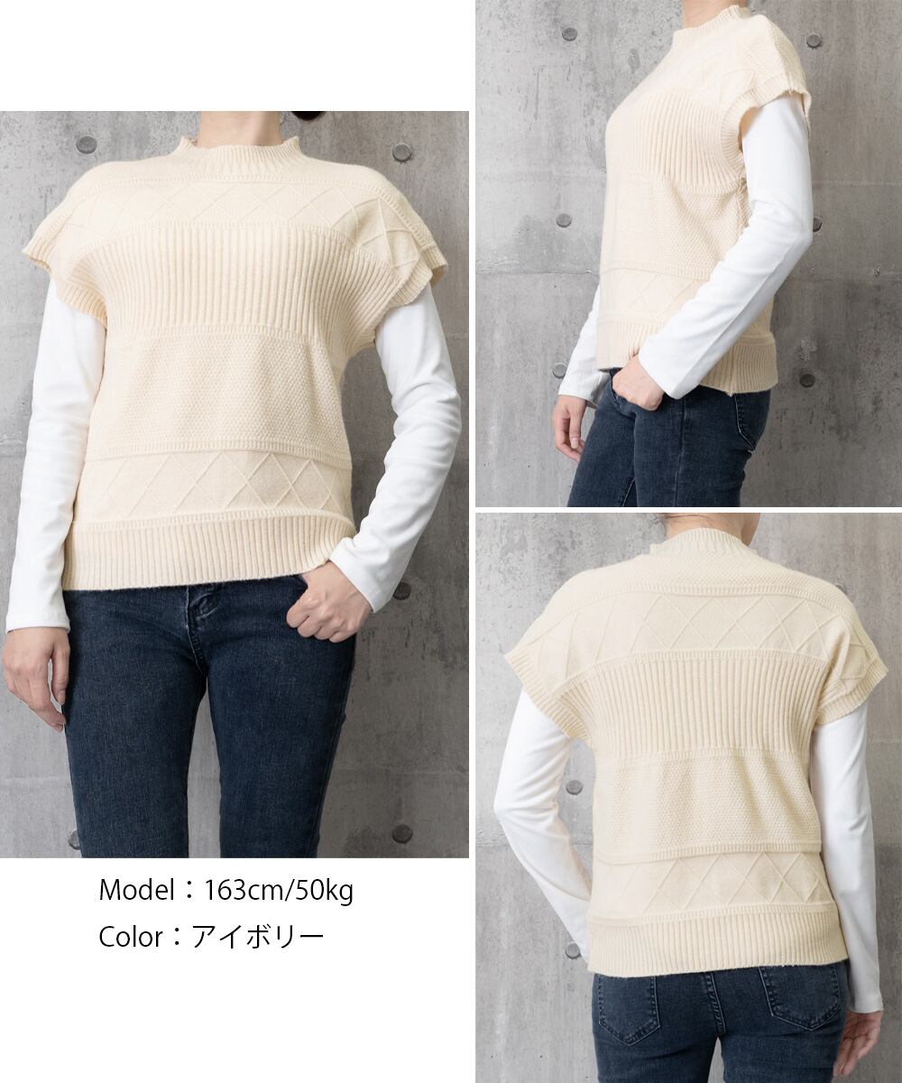 幾何学模様が目を惹くプチハイネックのニットベスト。