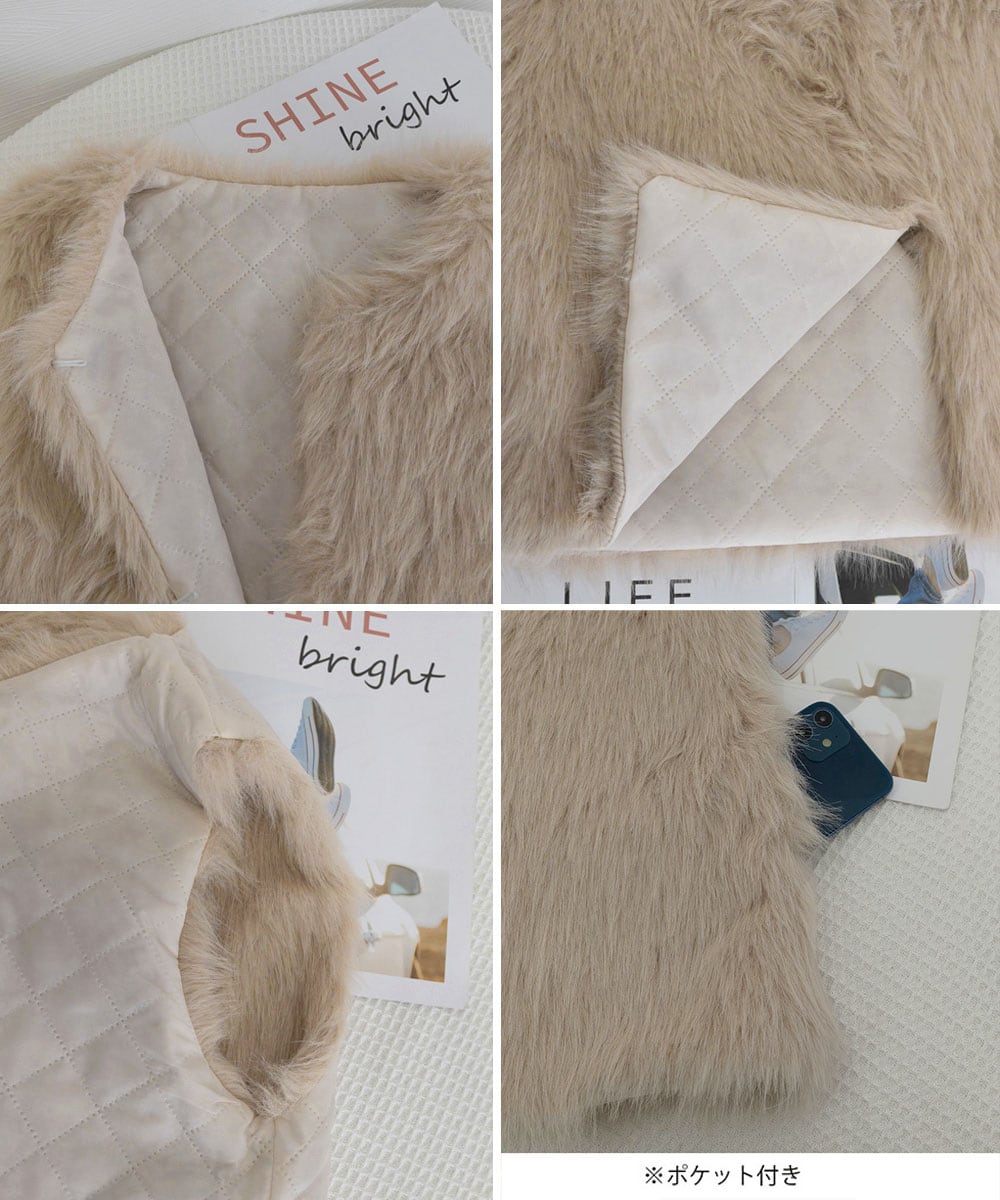 エコファーボリュームベスト 大人可愛いトレンドファージャケットノースリーブ 高見え ノーカラーアウター秋冬 ポケット付き