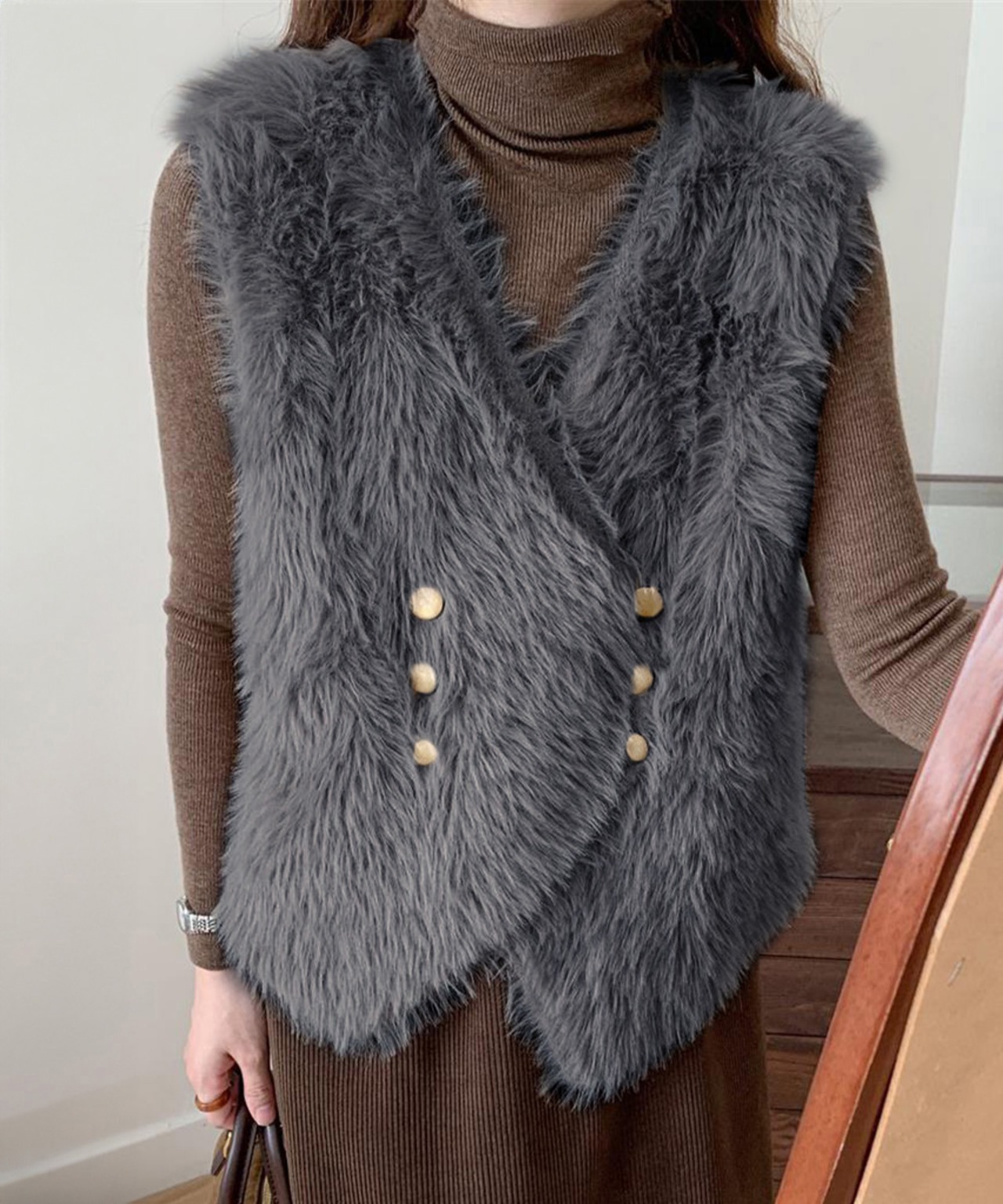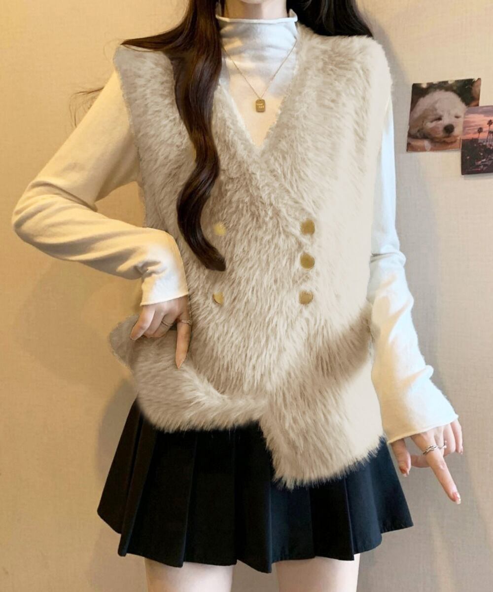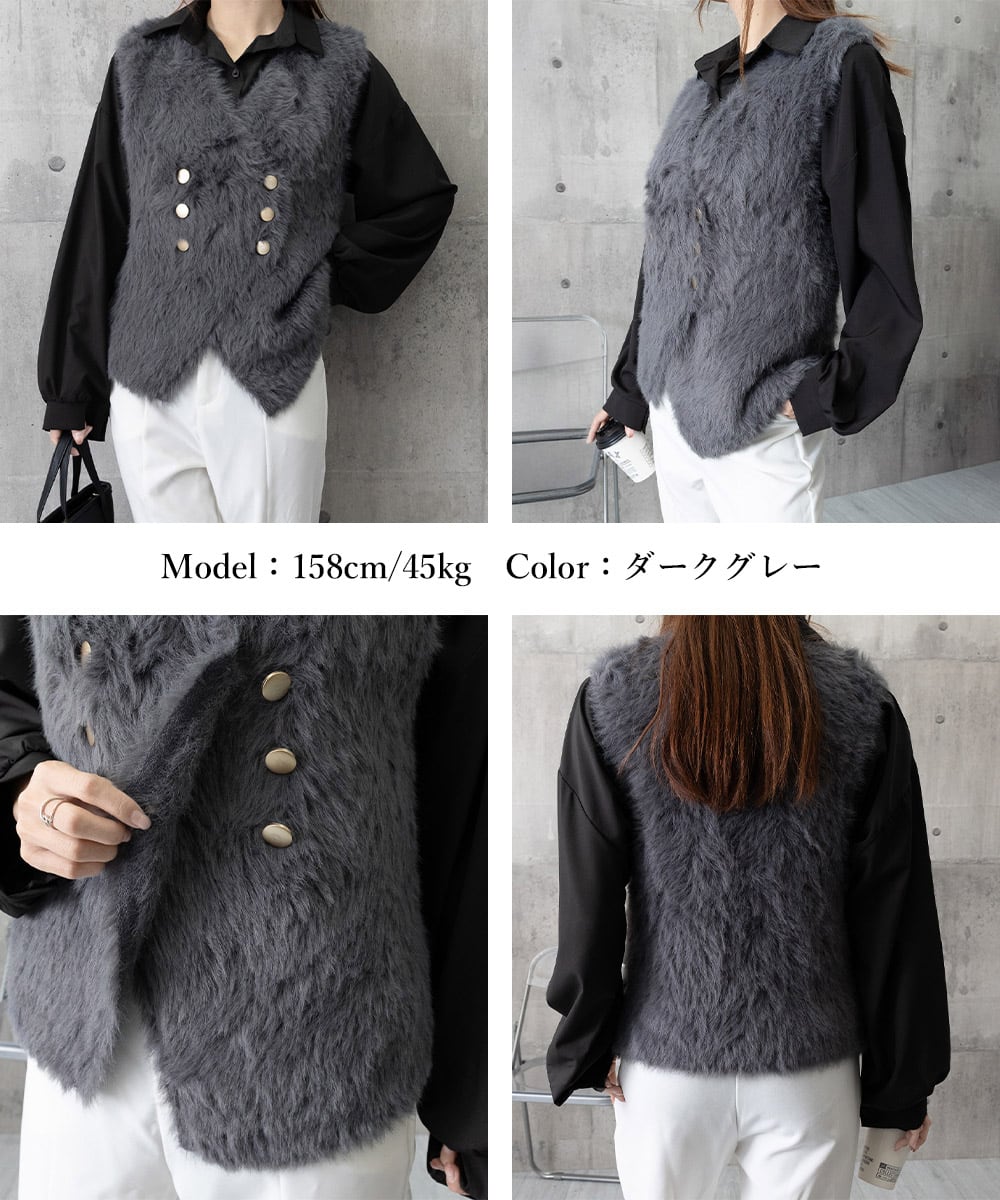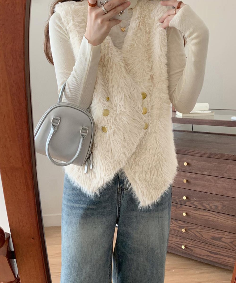 ふわふわのフェイクファー素材を使用したVネックのダブルボタンベスト。