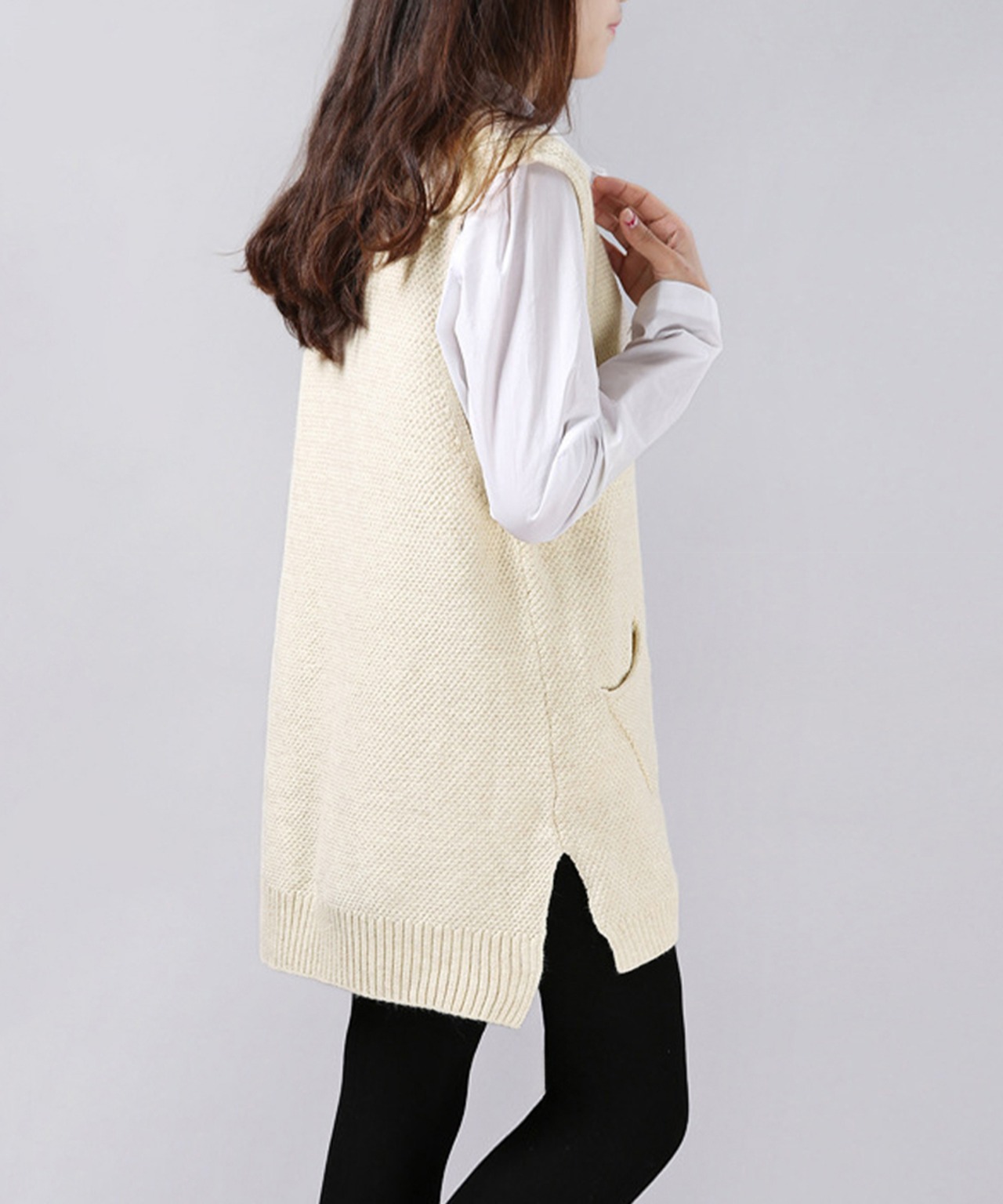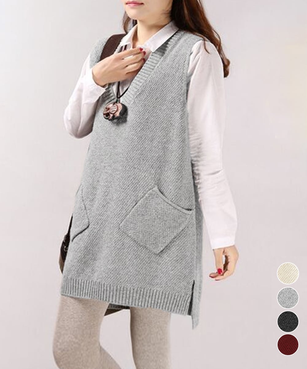 レディース サイドスリット ニットチョッキ ポケット付き ロングニットベスト 重ね着 無地ベスト カジュアル ニットジレ