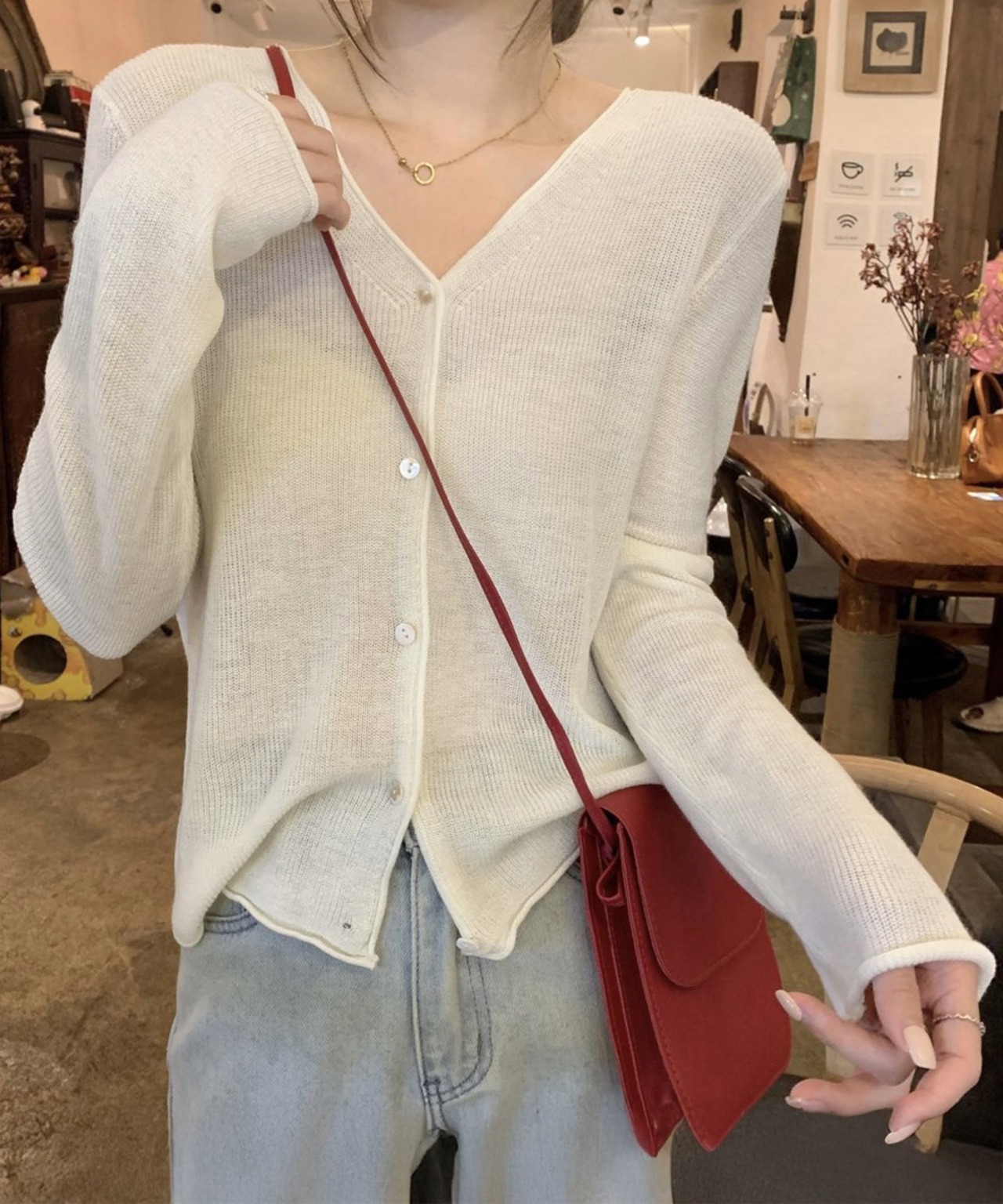 Vネックがデコルテをきれいに魅せ、大人らしい雰囲気に。