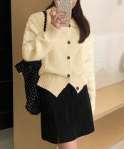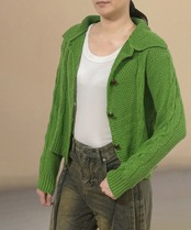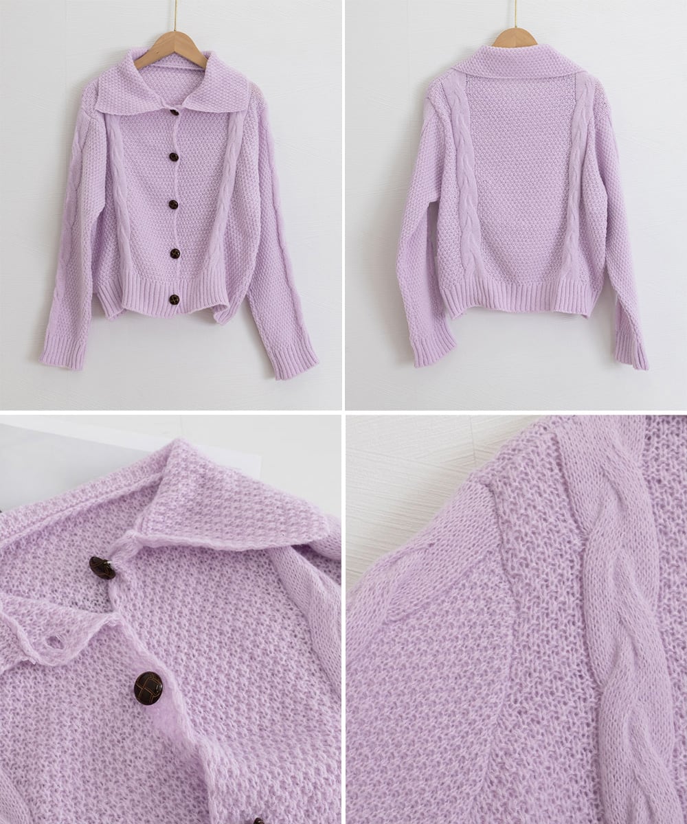 ざっくりとしたケーブル編みと立体感のあるビッグカラーが華やかさを添えるショート丈ニットカーディガン。