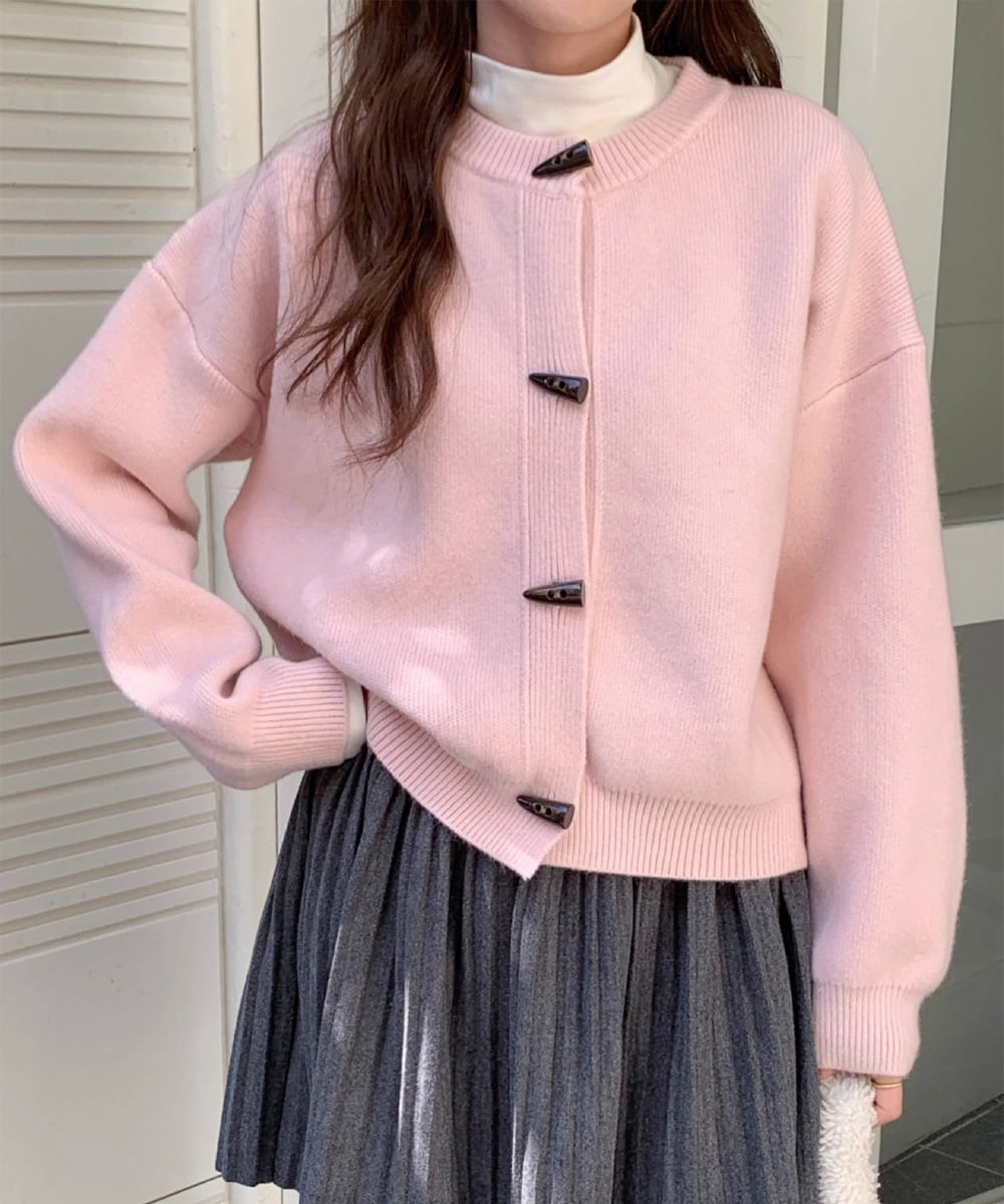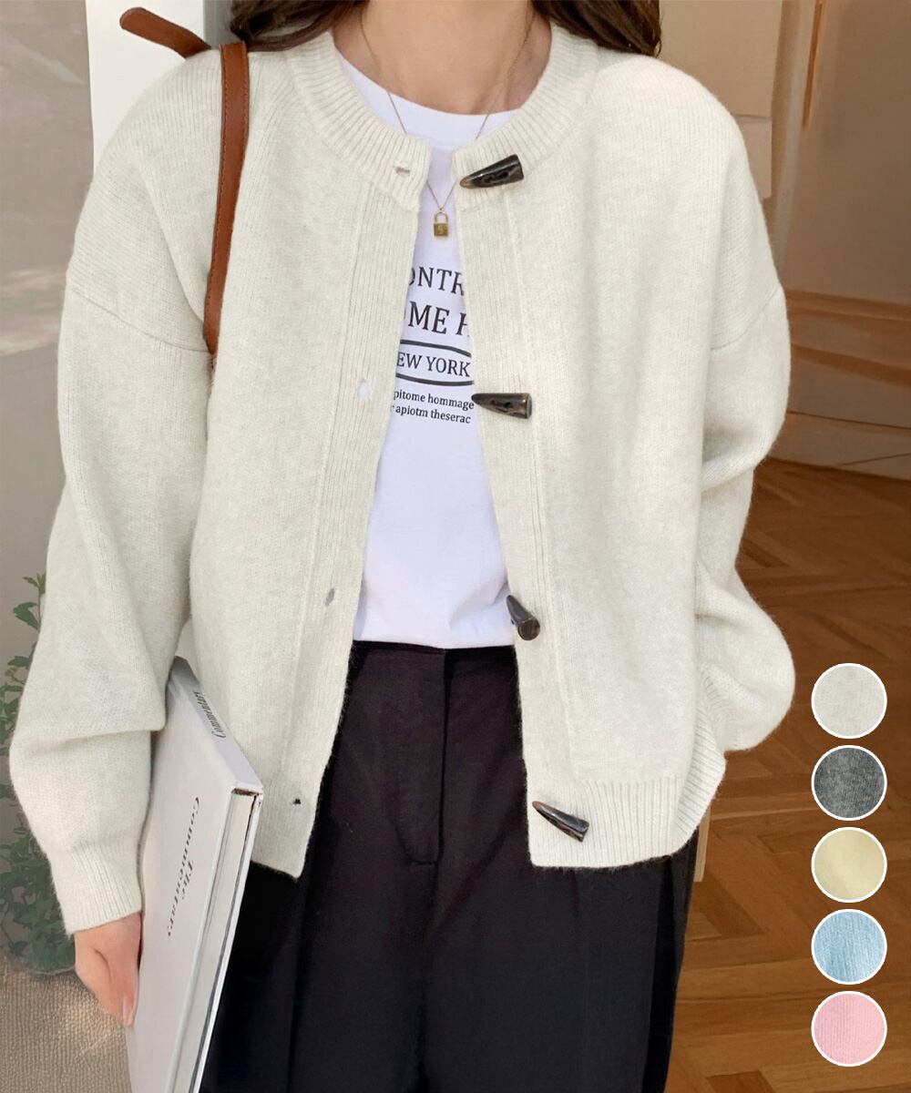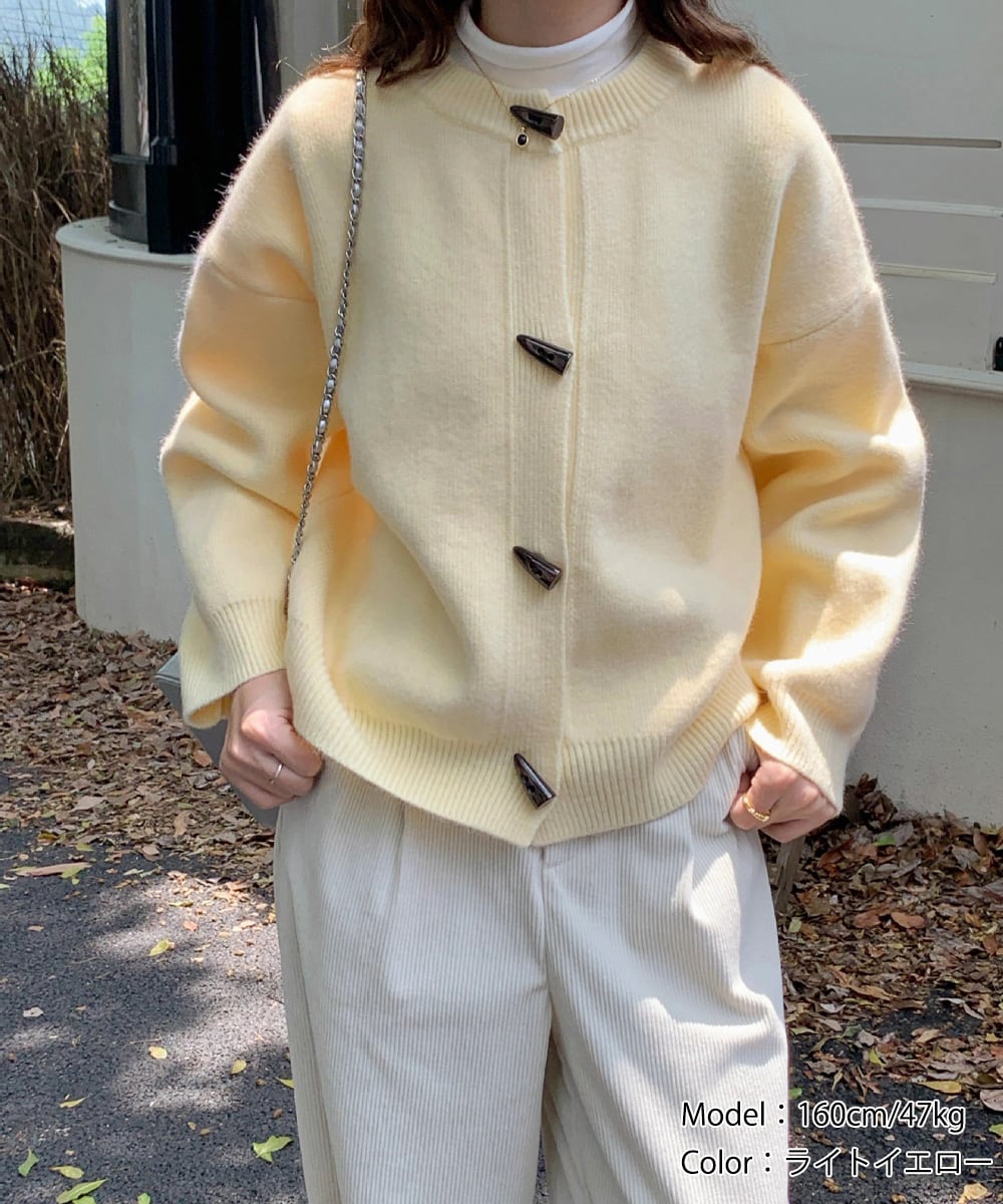 秋冬に映えるヴィンテージライクな牛角型トグルボタン付きニットカーディガン。