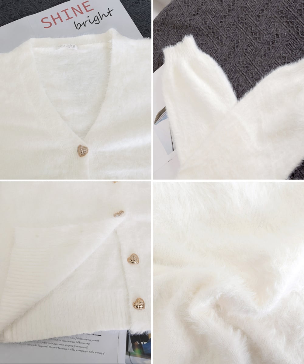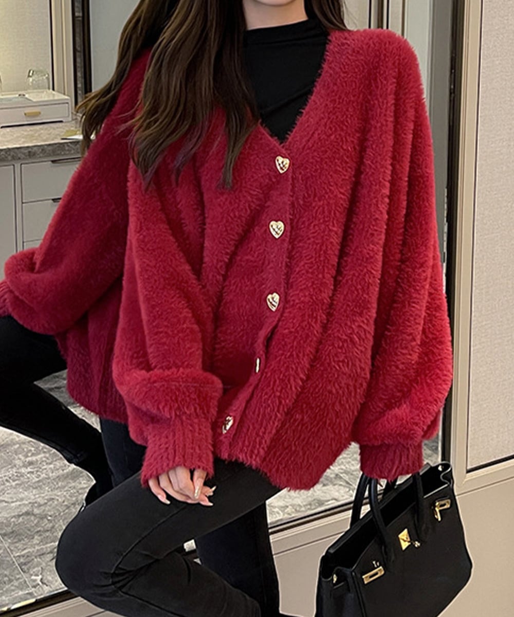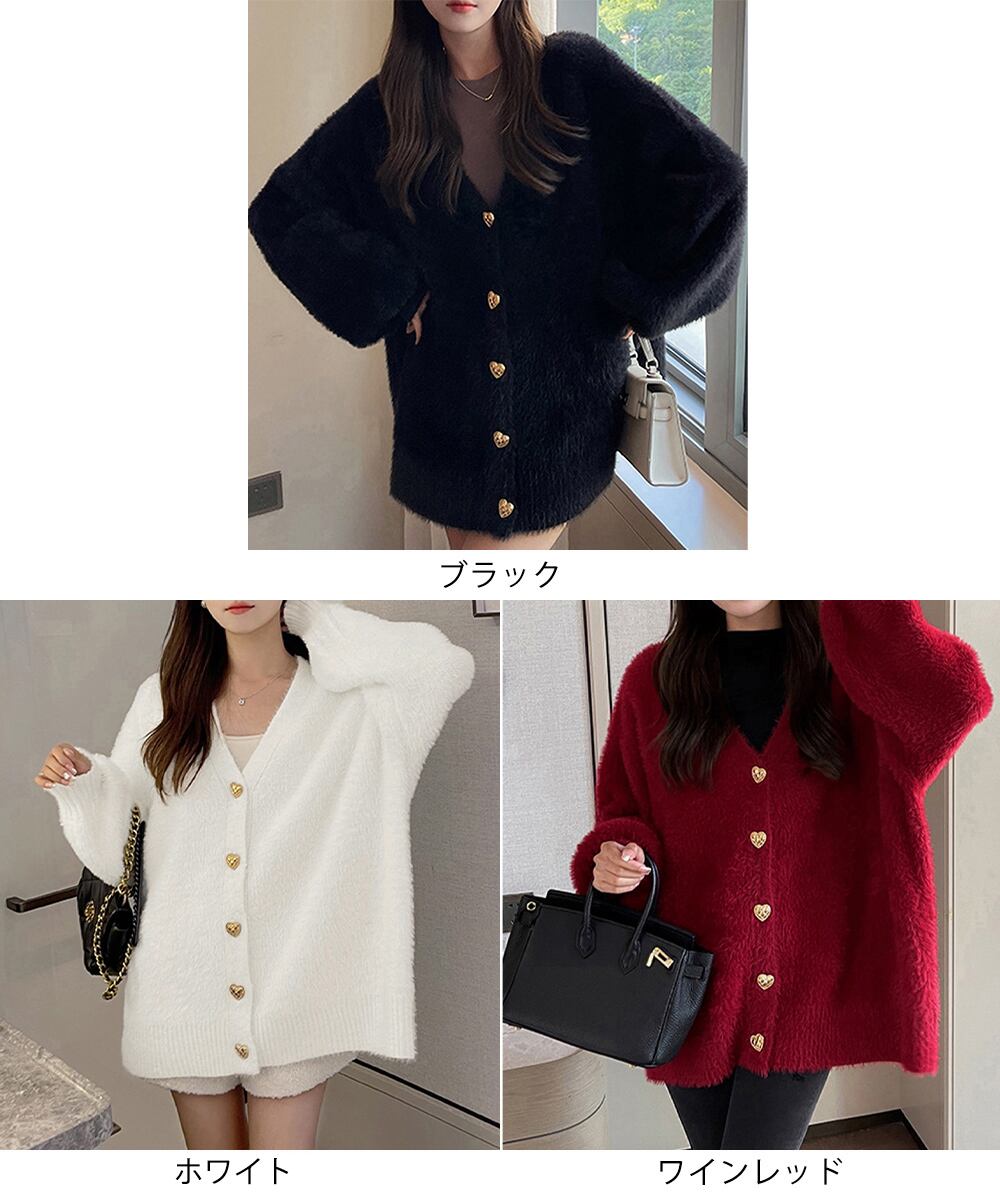 レディース ハートボタン秋冬ニット ミンクタッチカーディガン Vネックモヘヤセーター ゆったりニットトップス 大人可愛い