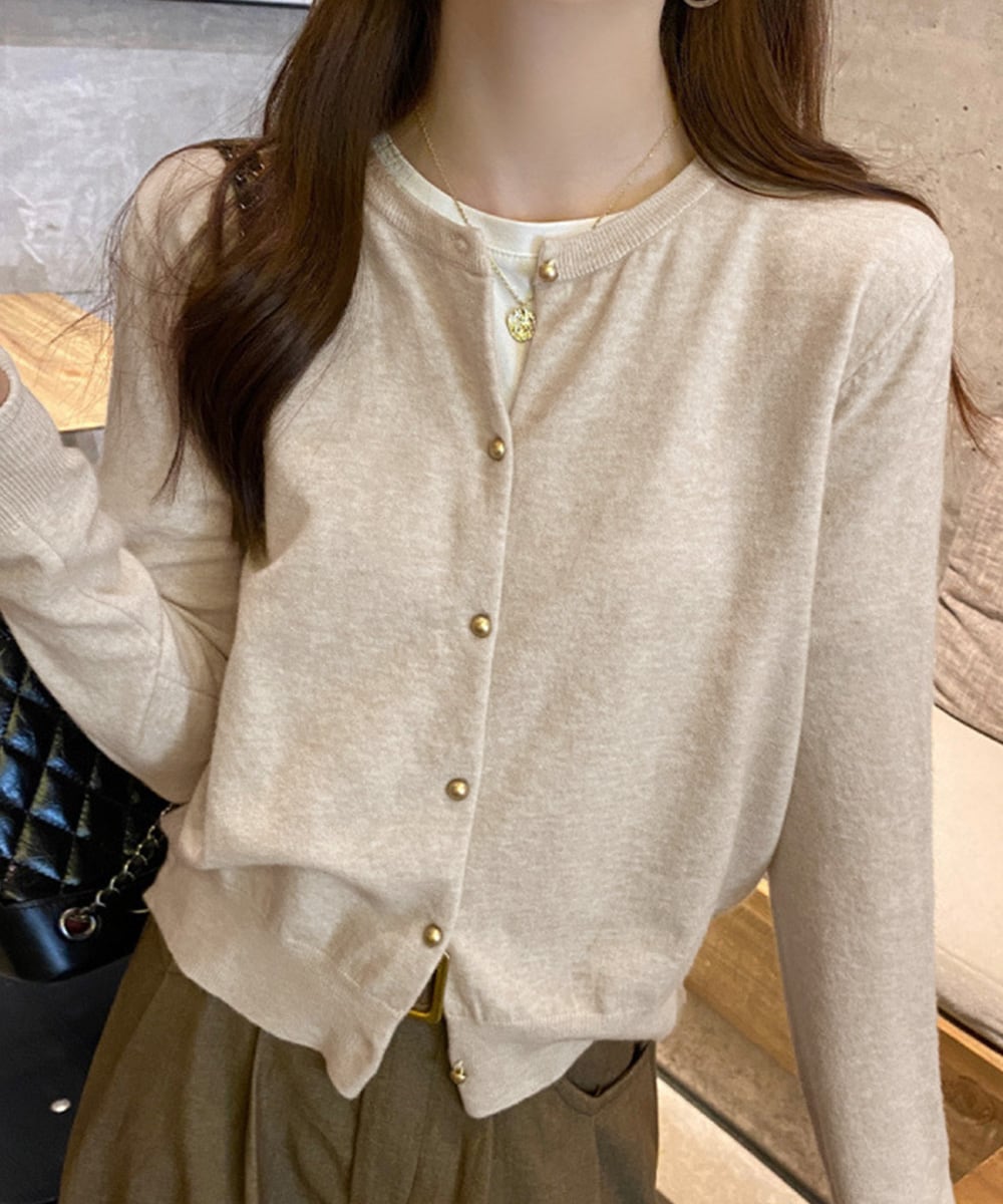 レディース シンプル ベーシック定番ニット ゴールドボタン羽織り コンパクトニットトップス長袖クルーネックニットセーター