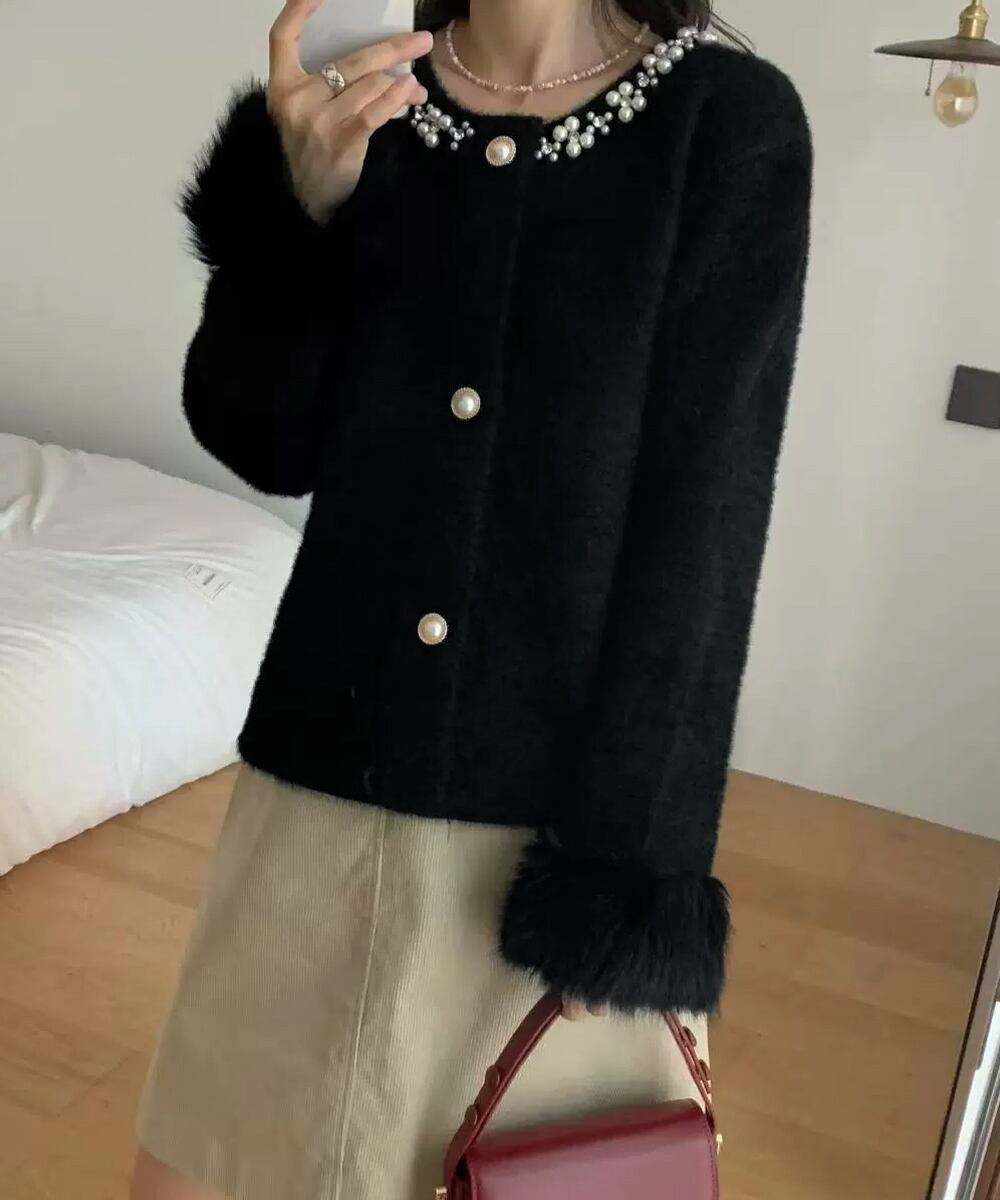 ふわふわファーニットアウター レディースきれいめシャギーニット高級感 パール付きエレガントトップス おしゃれ 上品秋冬服