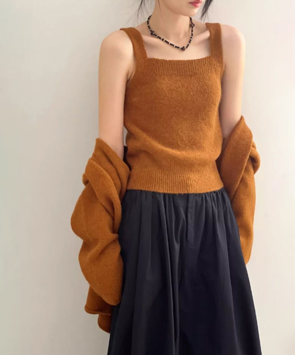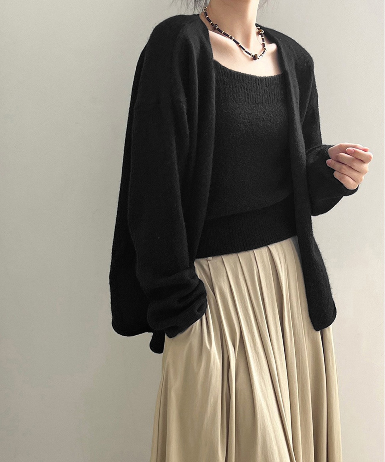 ベーシックなカーディガンとキャミソールの2点セットで、ひとつで重ね着コーデが完成。