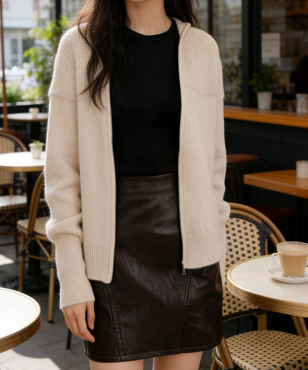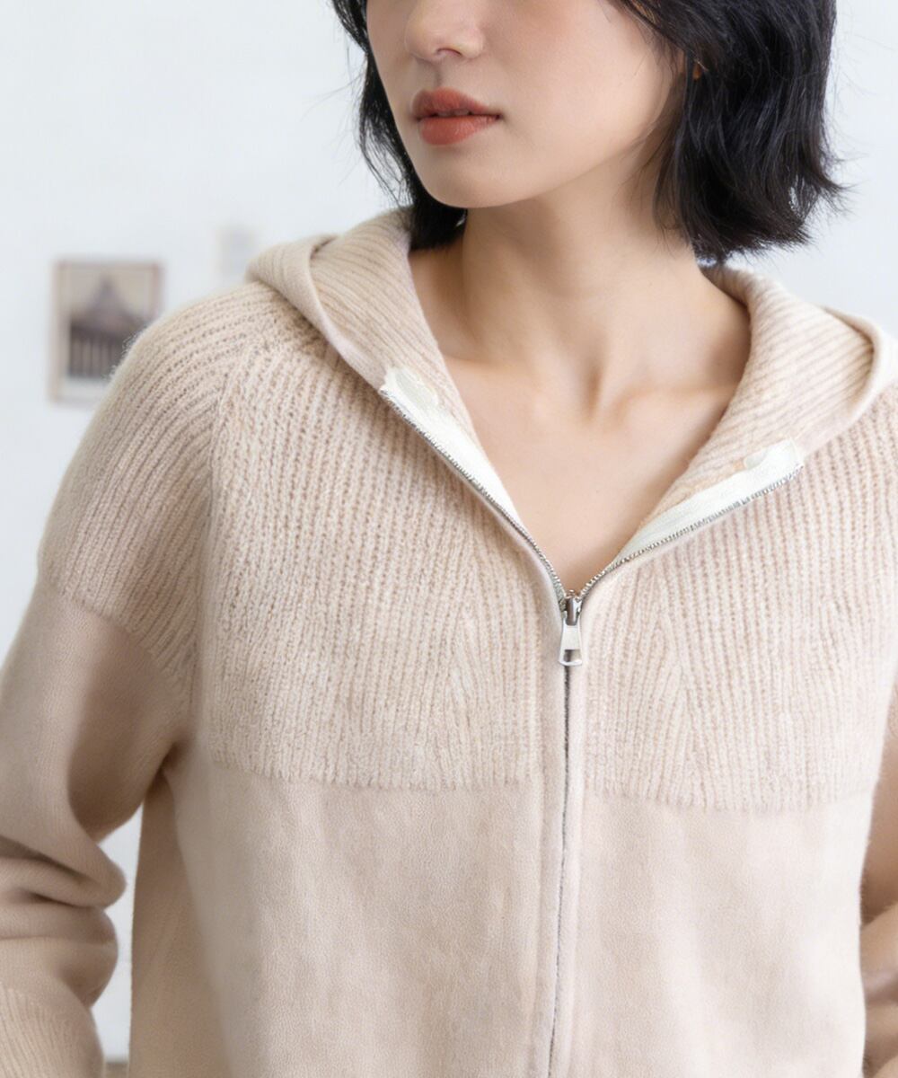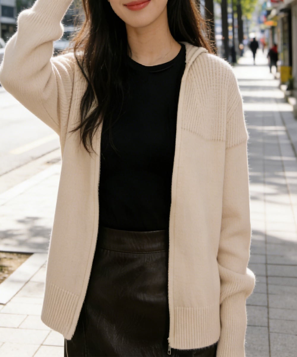 フード付きデザインがポイントのジップアップニットパーカー。