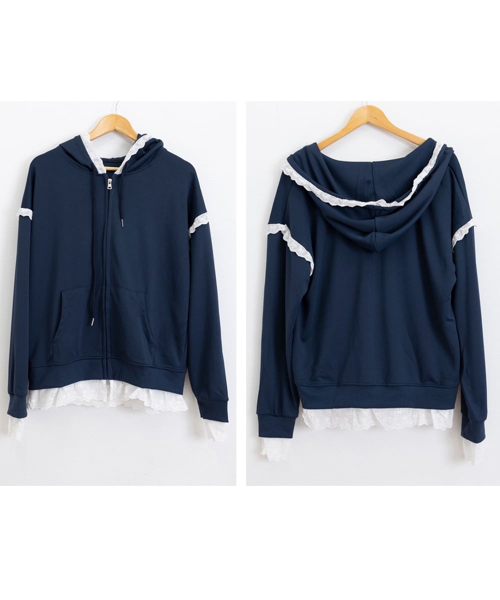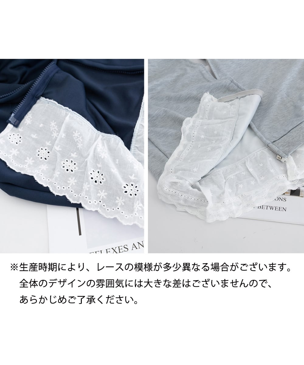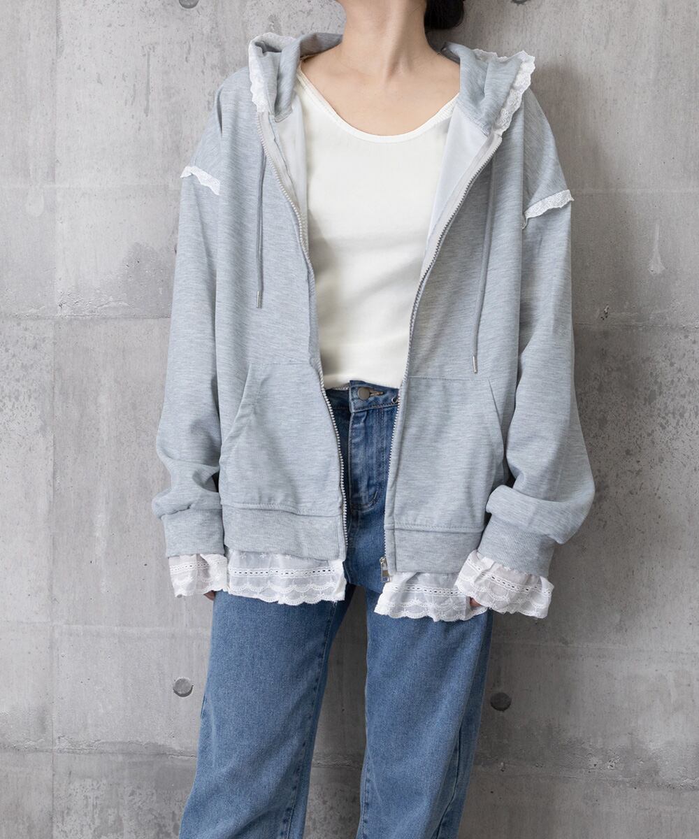 ジップアップパーカー 裾レース スウェットパーカー 薄手 フード付き 羽織り 大人可愛い ゆったりトップス カジュアル服