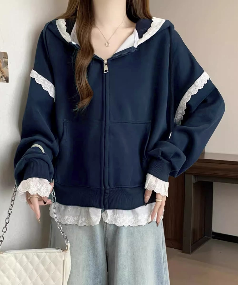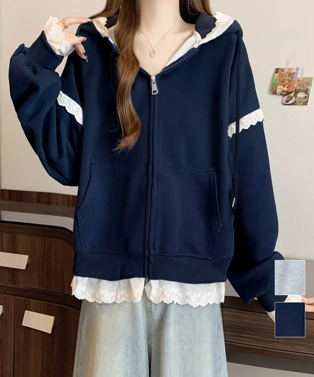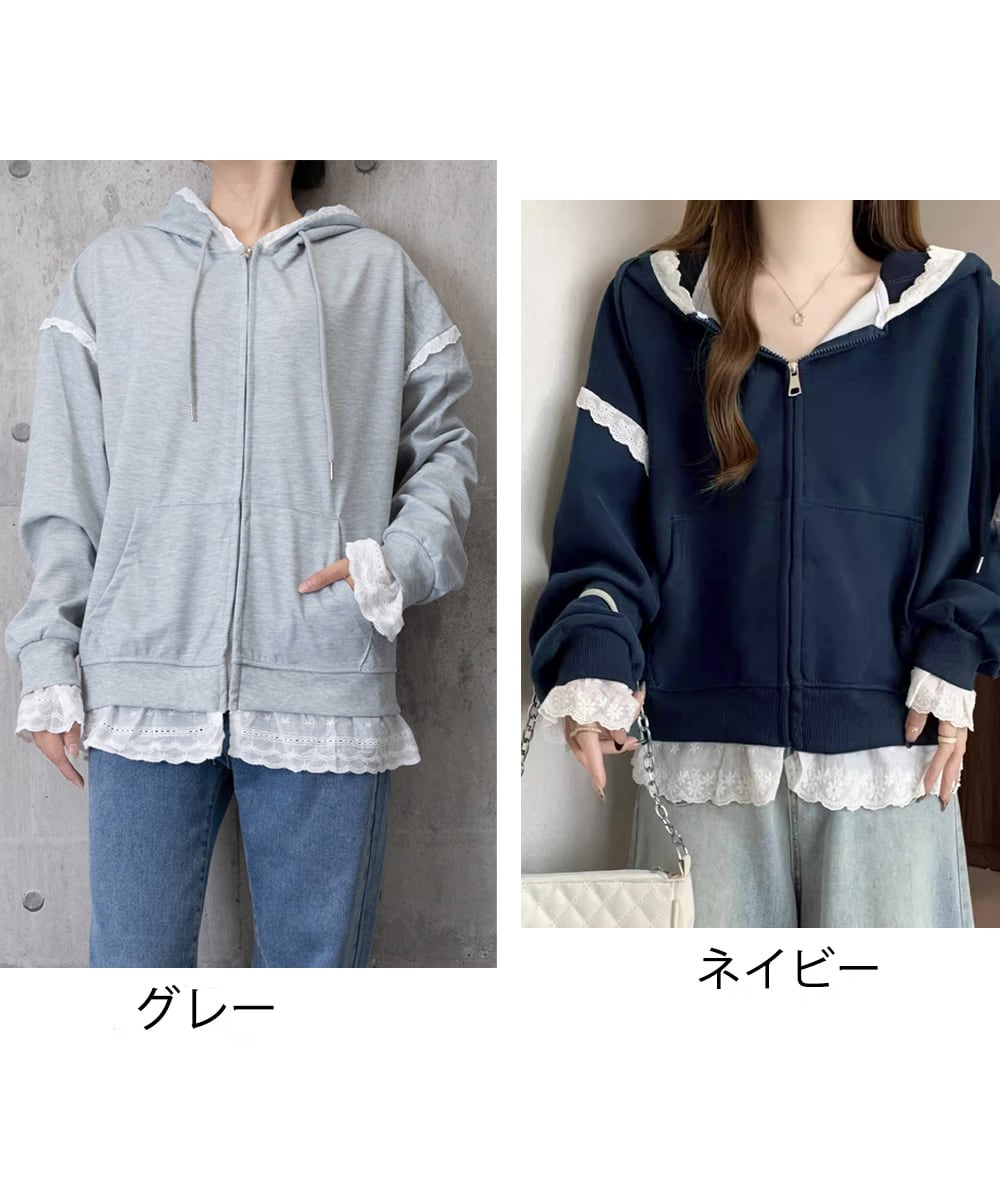 パーカー レース切り替え 韓国風 ZIP
