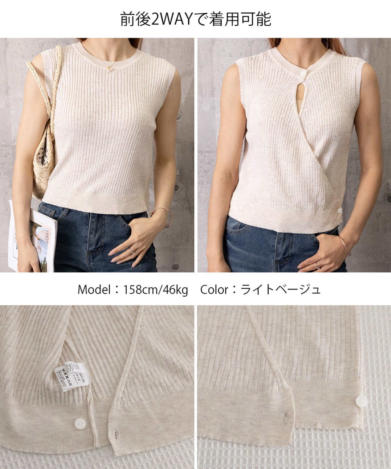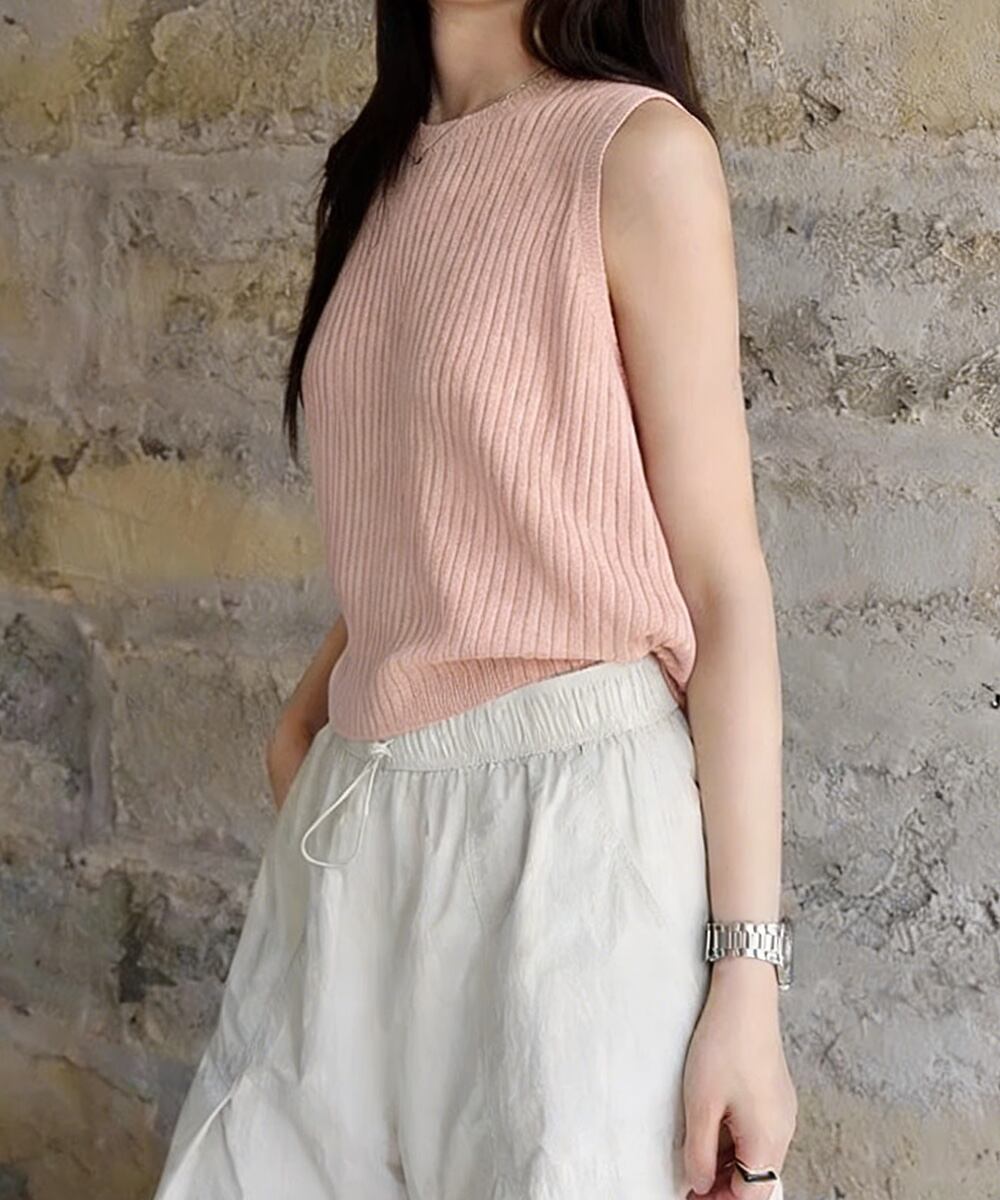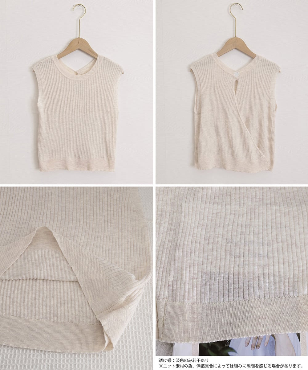 前後2WAYリブニット ノースリーブトップス レディース ラウンドネックプルオーバー バックオープンニットソー きれいめ