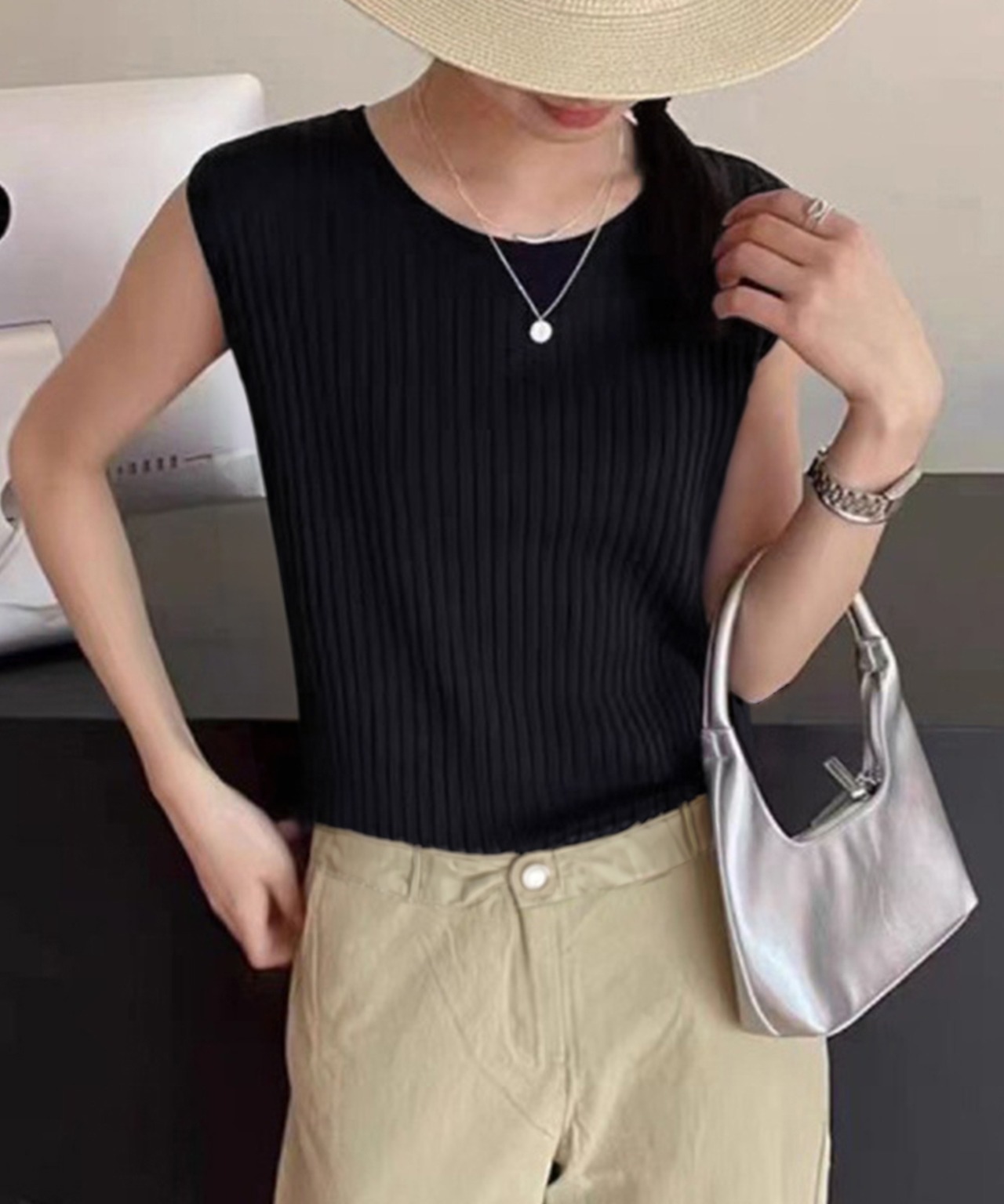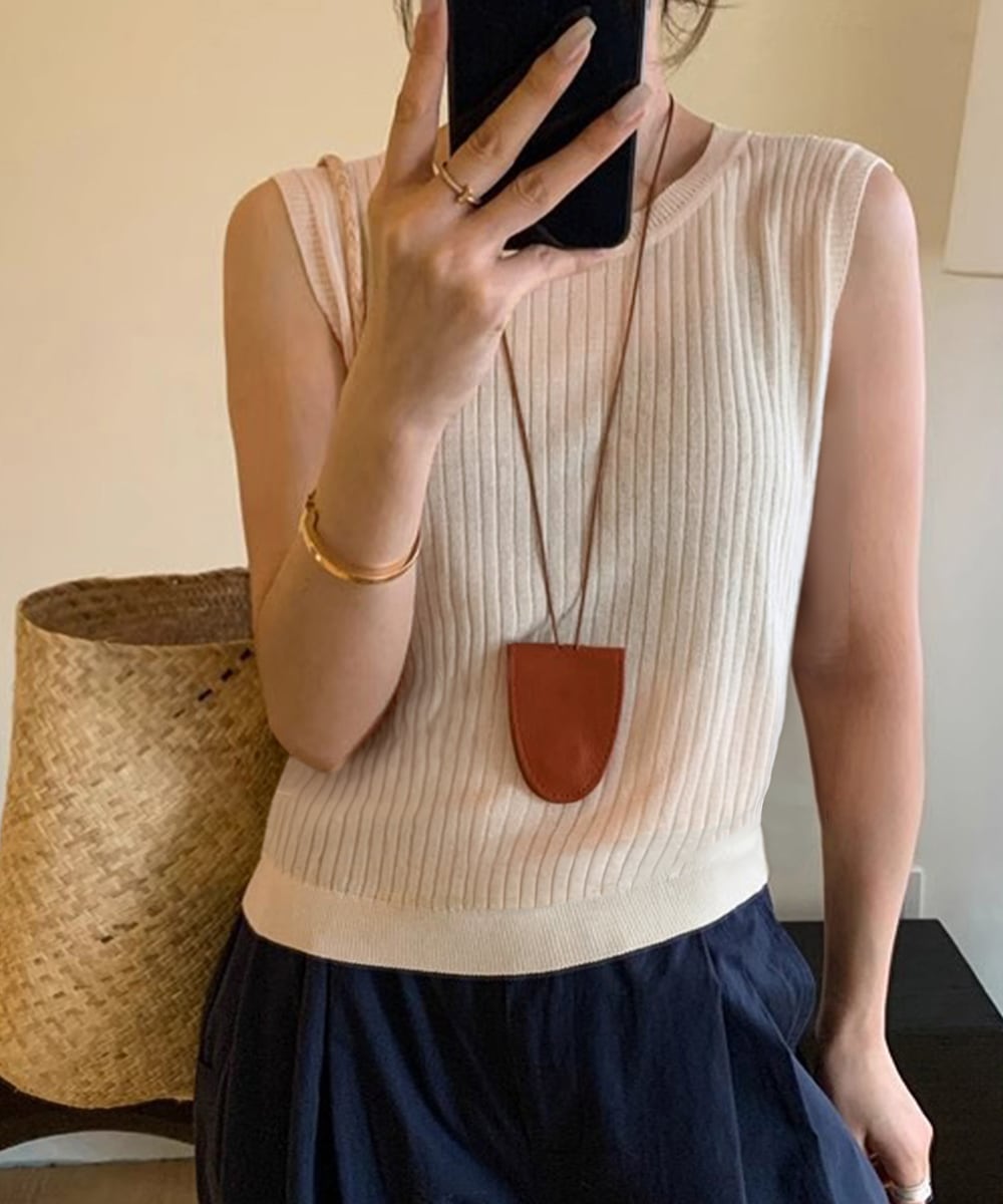バックオープンデザインがさりげなく色気を引き立てる、リブニットタンクトップ。