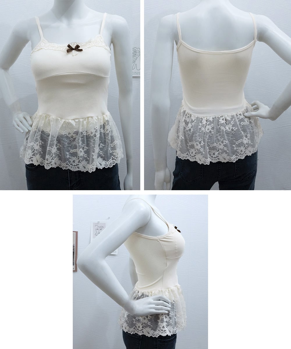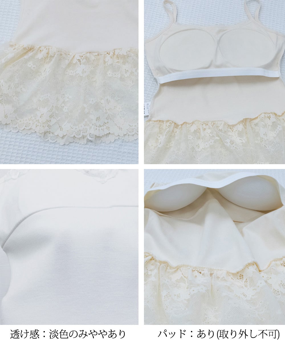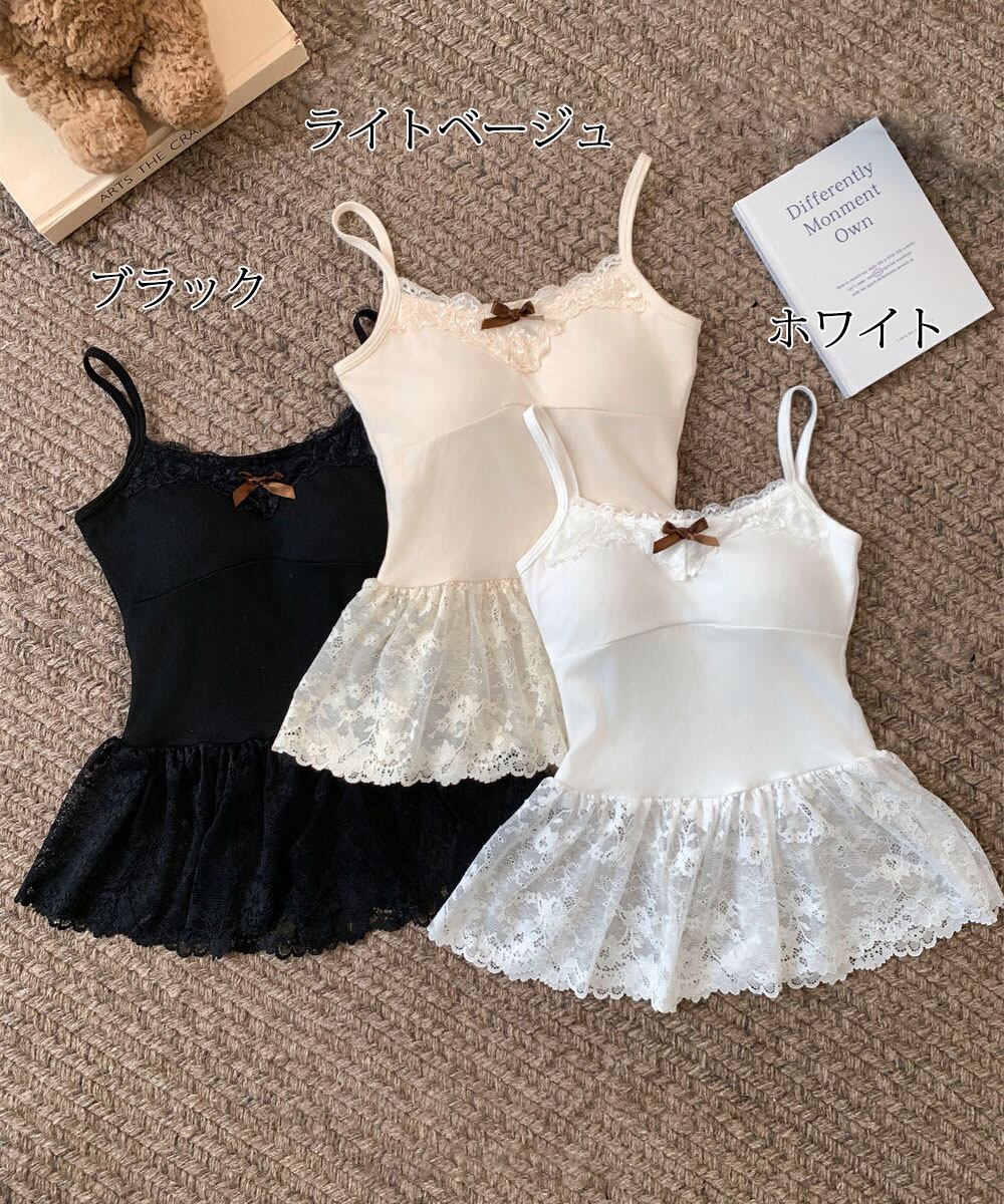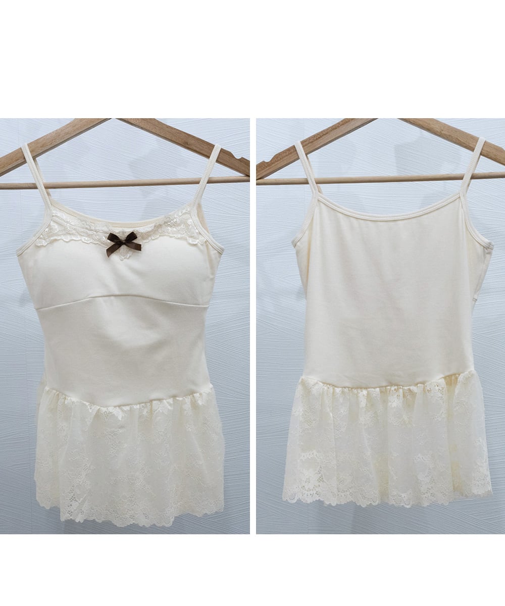 チビリボンと裾レースのディテールがガーリーな印象のパッド付きキャミソール。