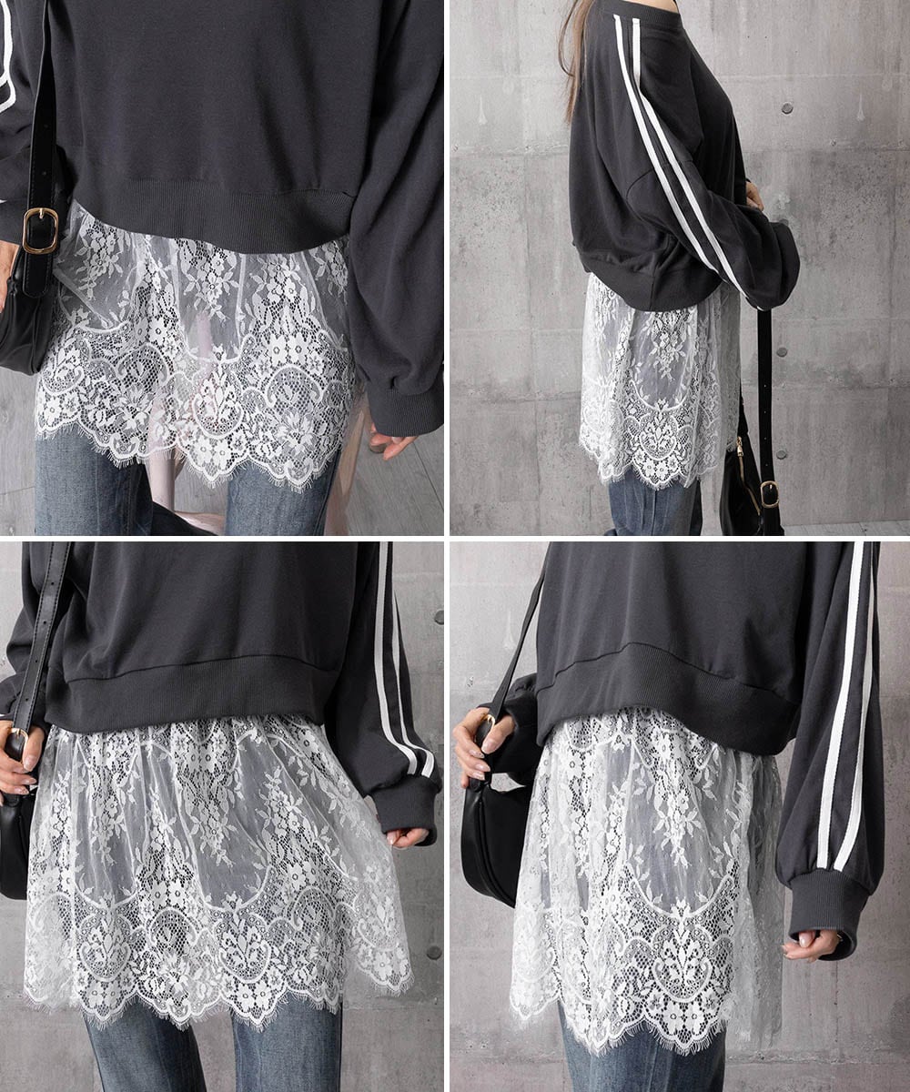 ニットやスウェットの裾からレースを覗かせて、旬な重ね着コーデに。