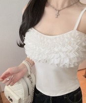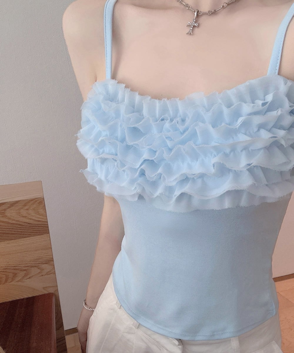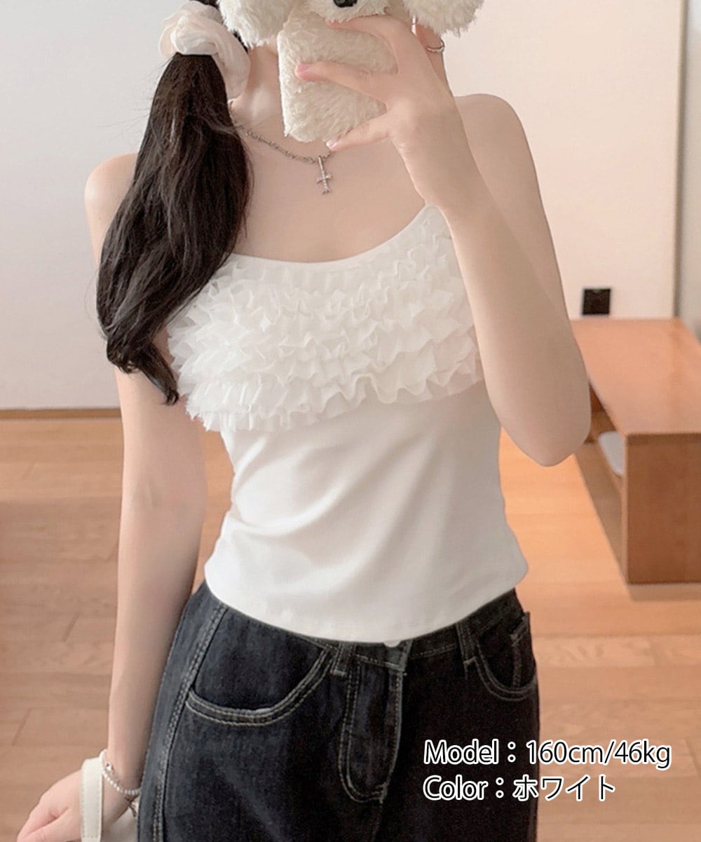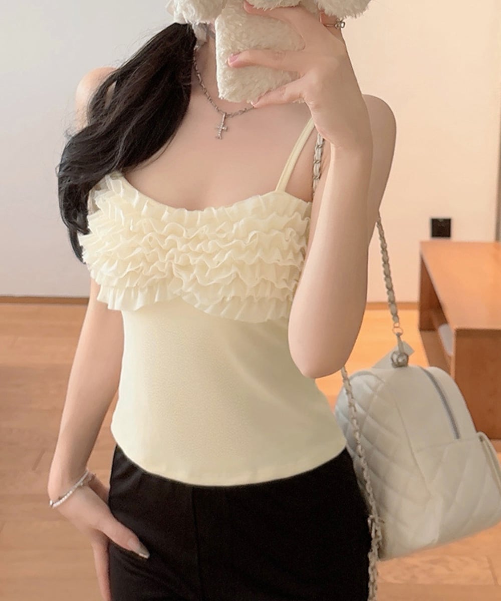 胸元のボリュームフリルが目を引く、トレンド感溢れるキャミソール。