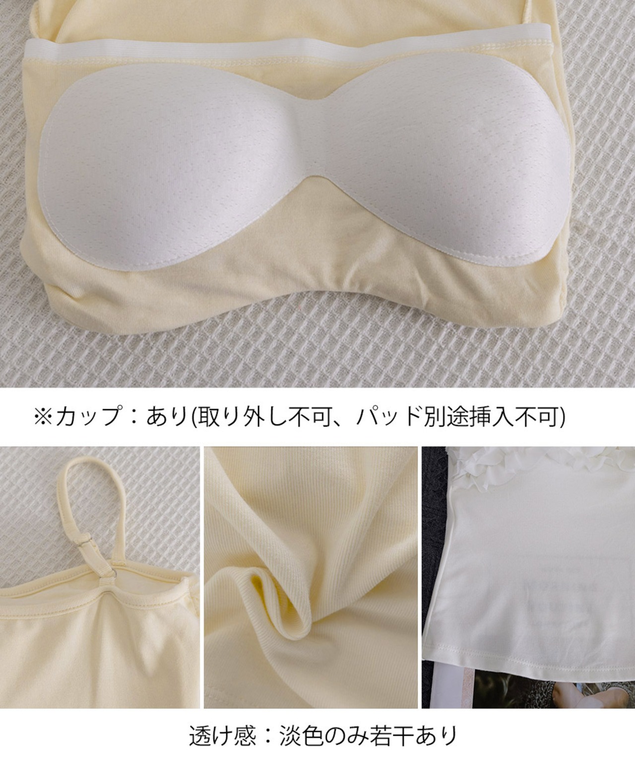 カップ:あり(取り外し不可、パッド別途挿入不可)