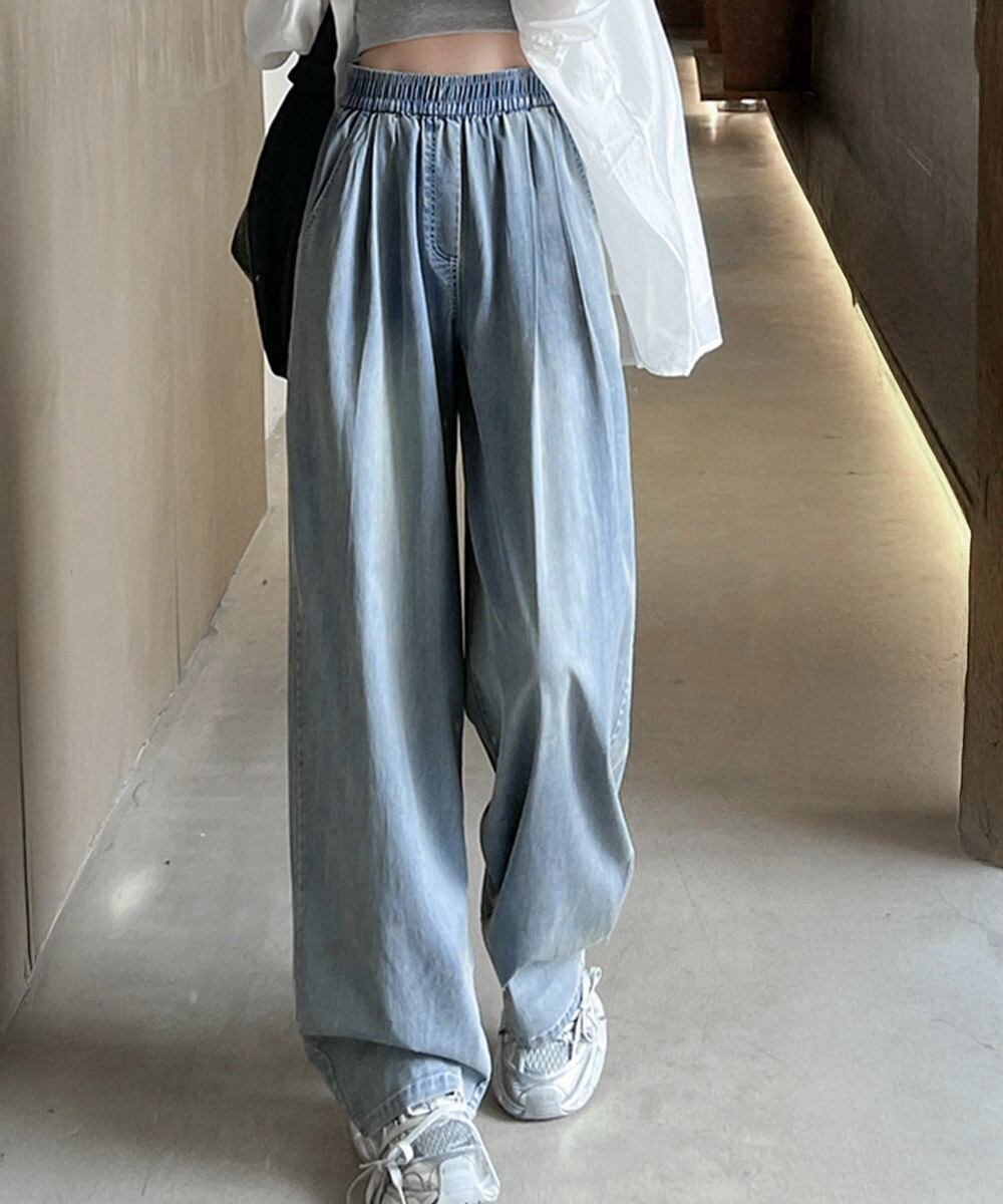 ドレープ感と軽やかさを兼ね備えた、夏にぴったりのデニム風ワイドパンツ。