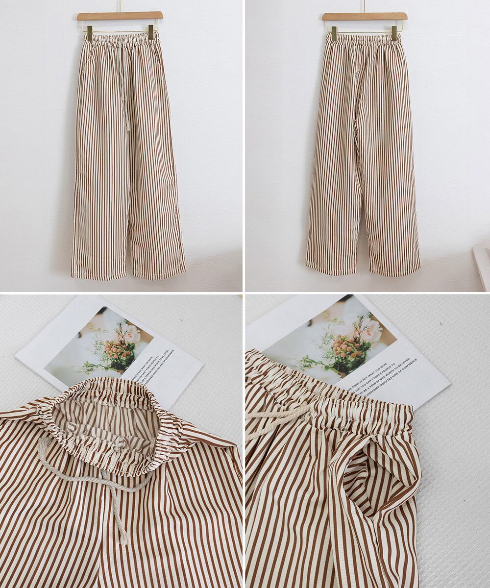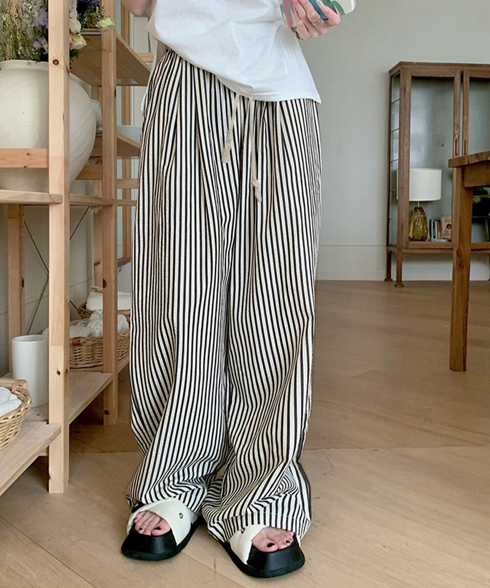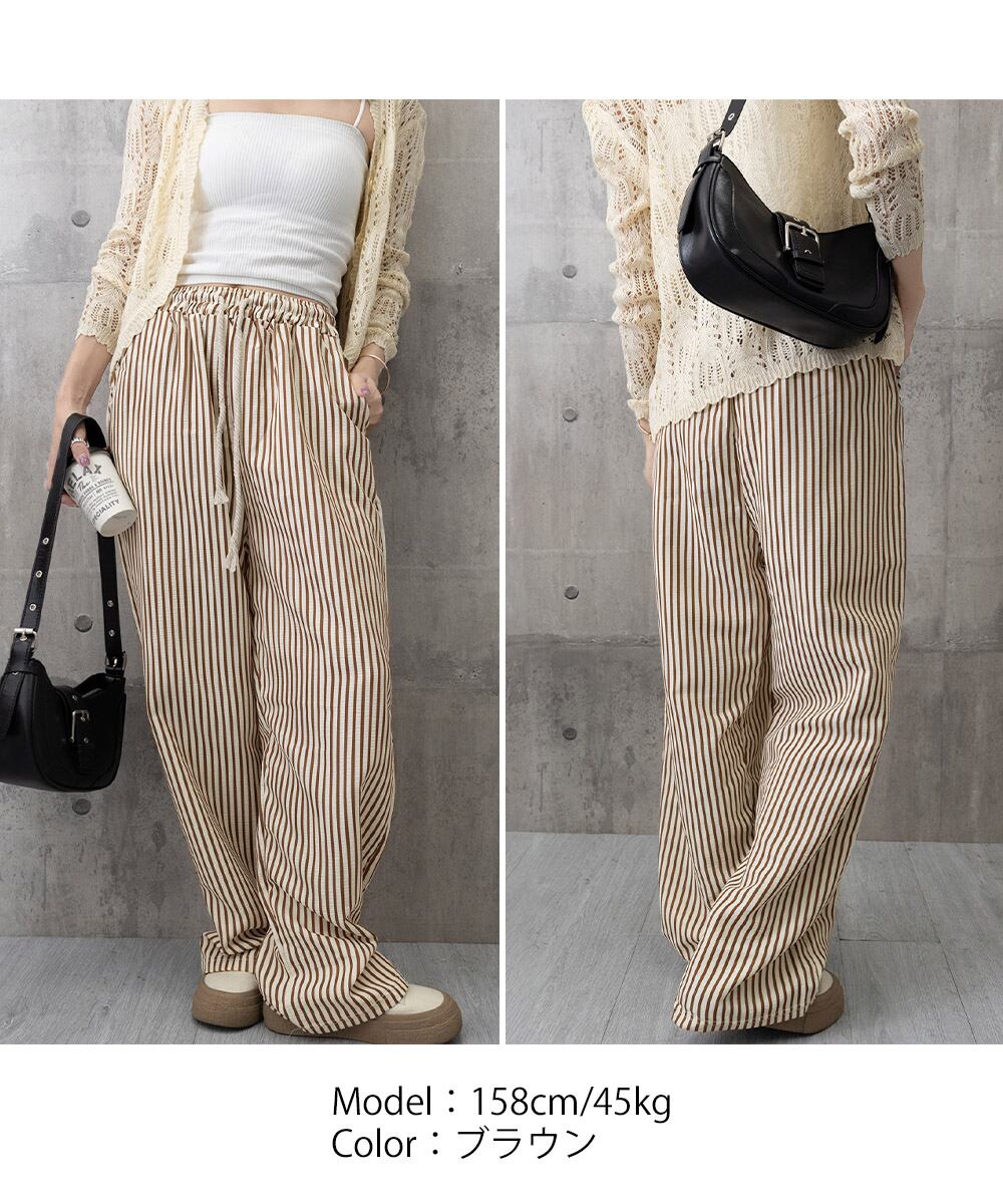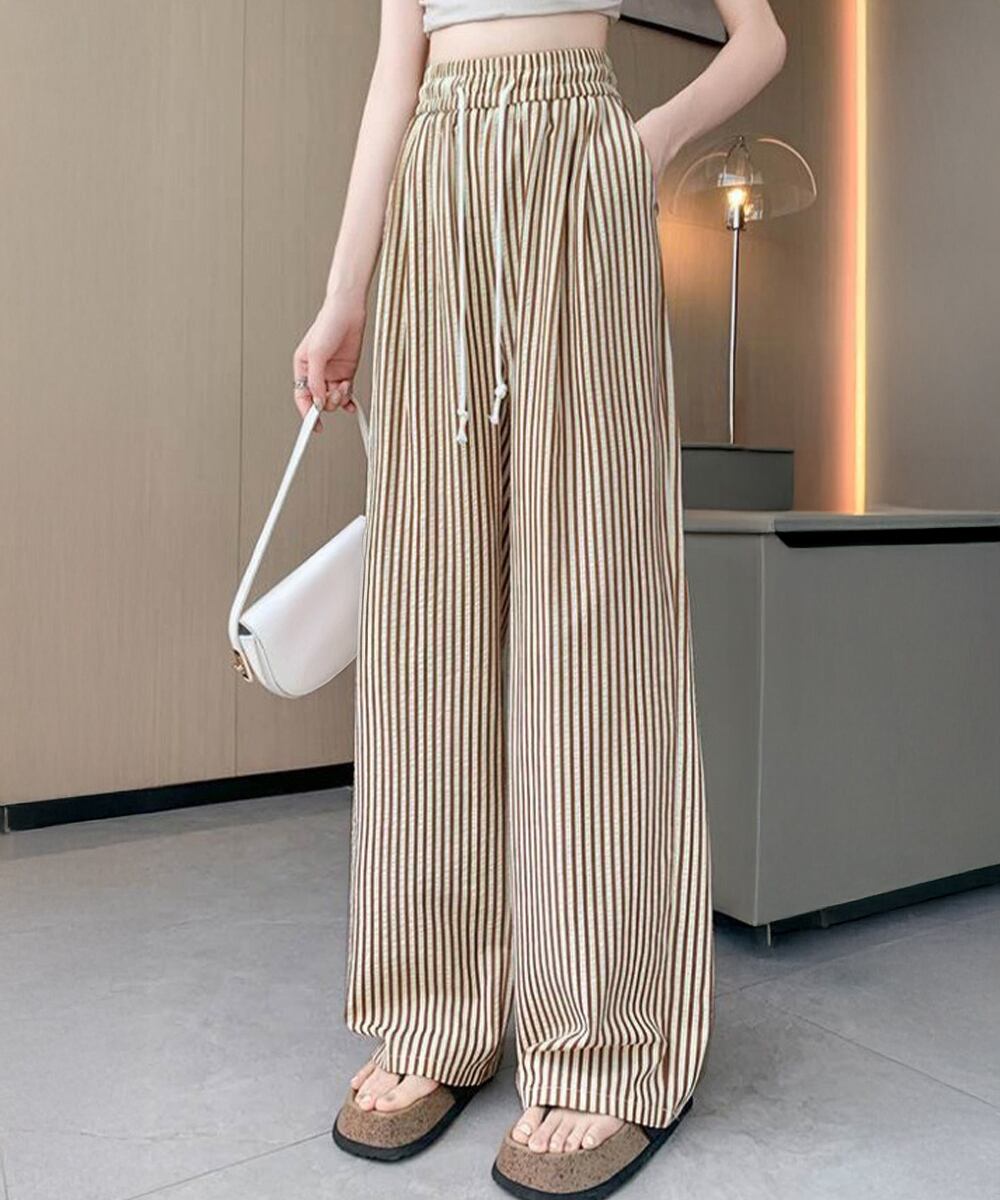 ストライプ柄が爽やかで、抜け感のあるセミワイドパンツ。