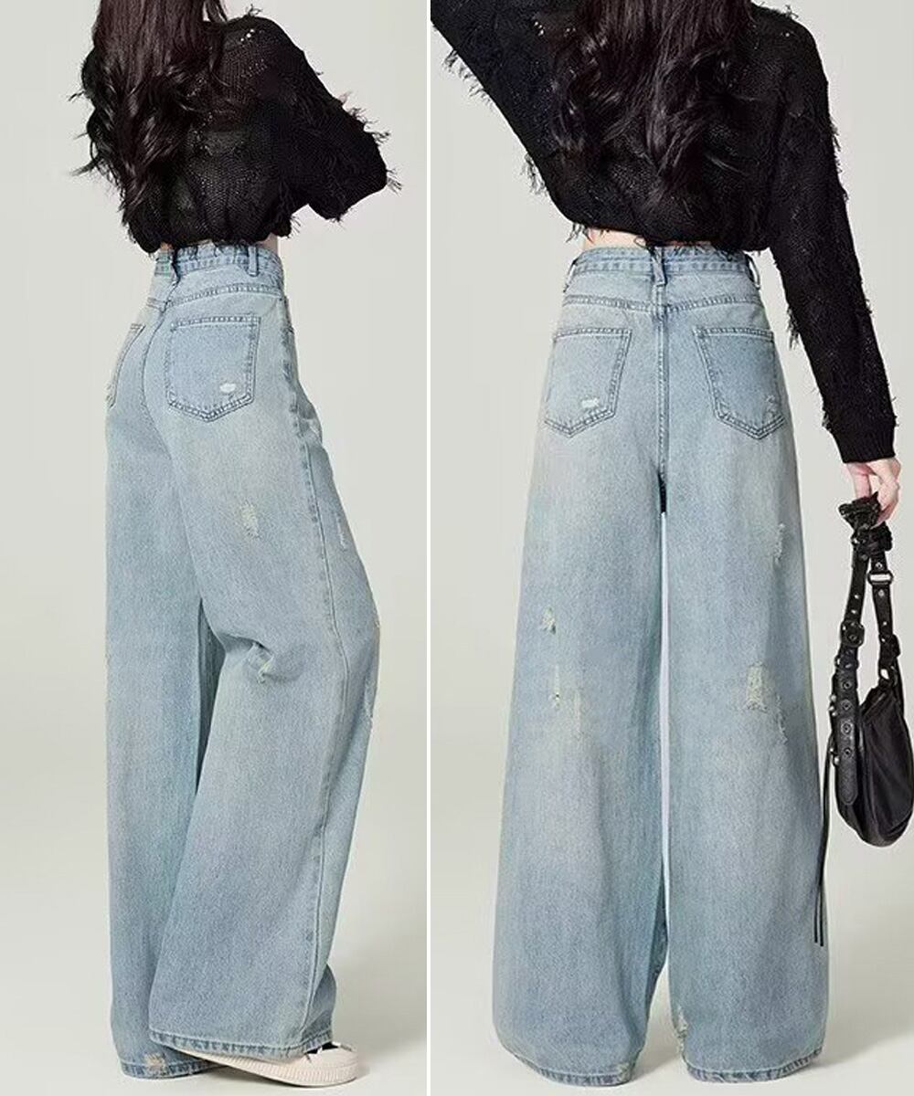 レディース ハイウエスト ロングパンツ ウォッシュ加工 ストレートパンツ 着やせ 韓国風ジーパン ゆったり ボトムス脚長