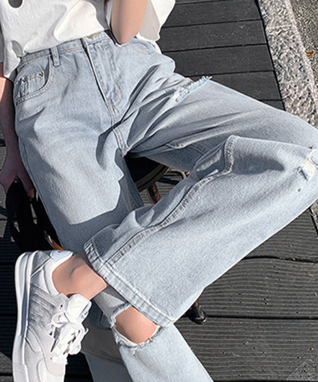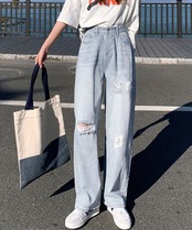 トレンド感満載のハイウエスト・ダメージデニムパンツ。