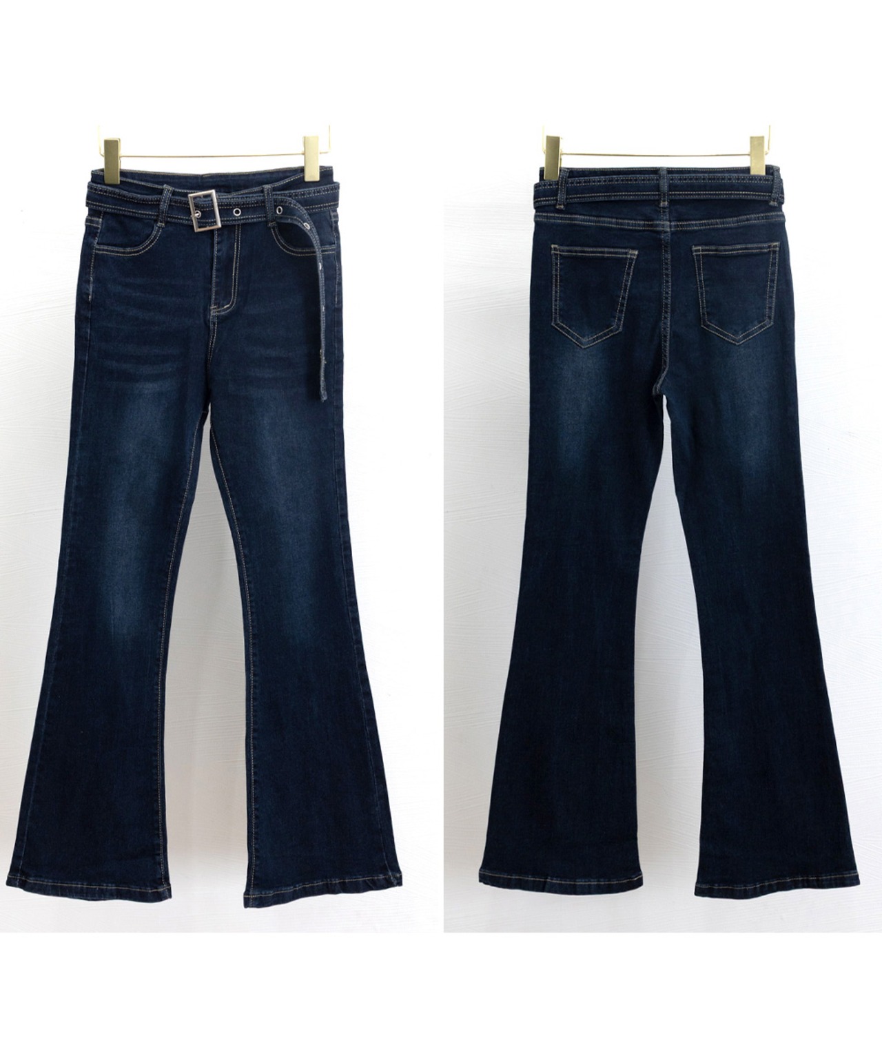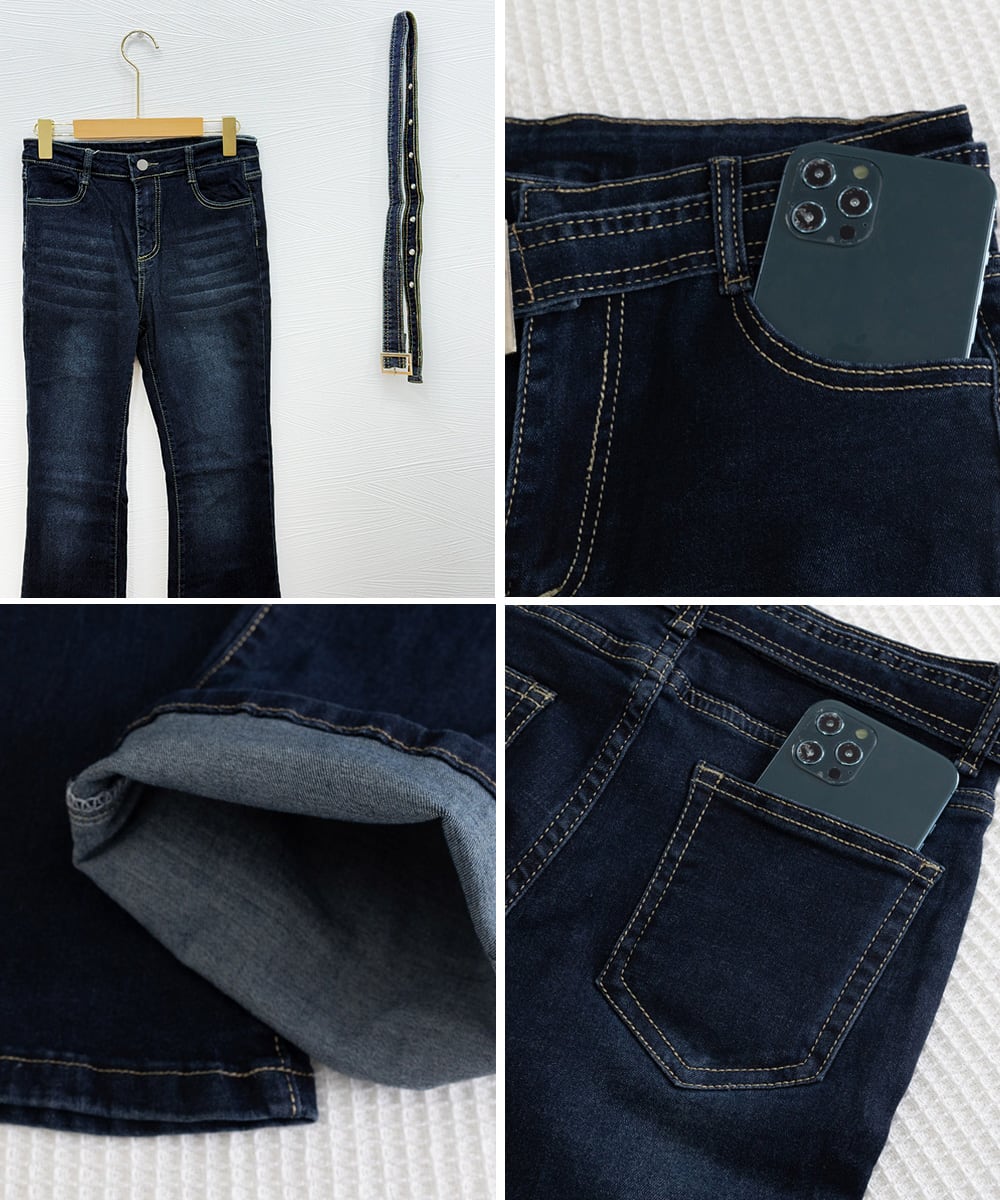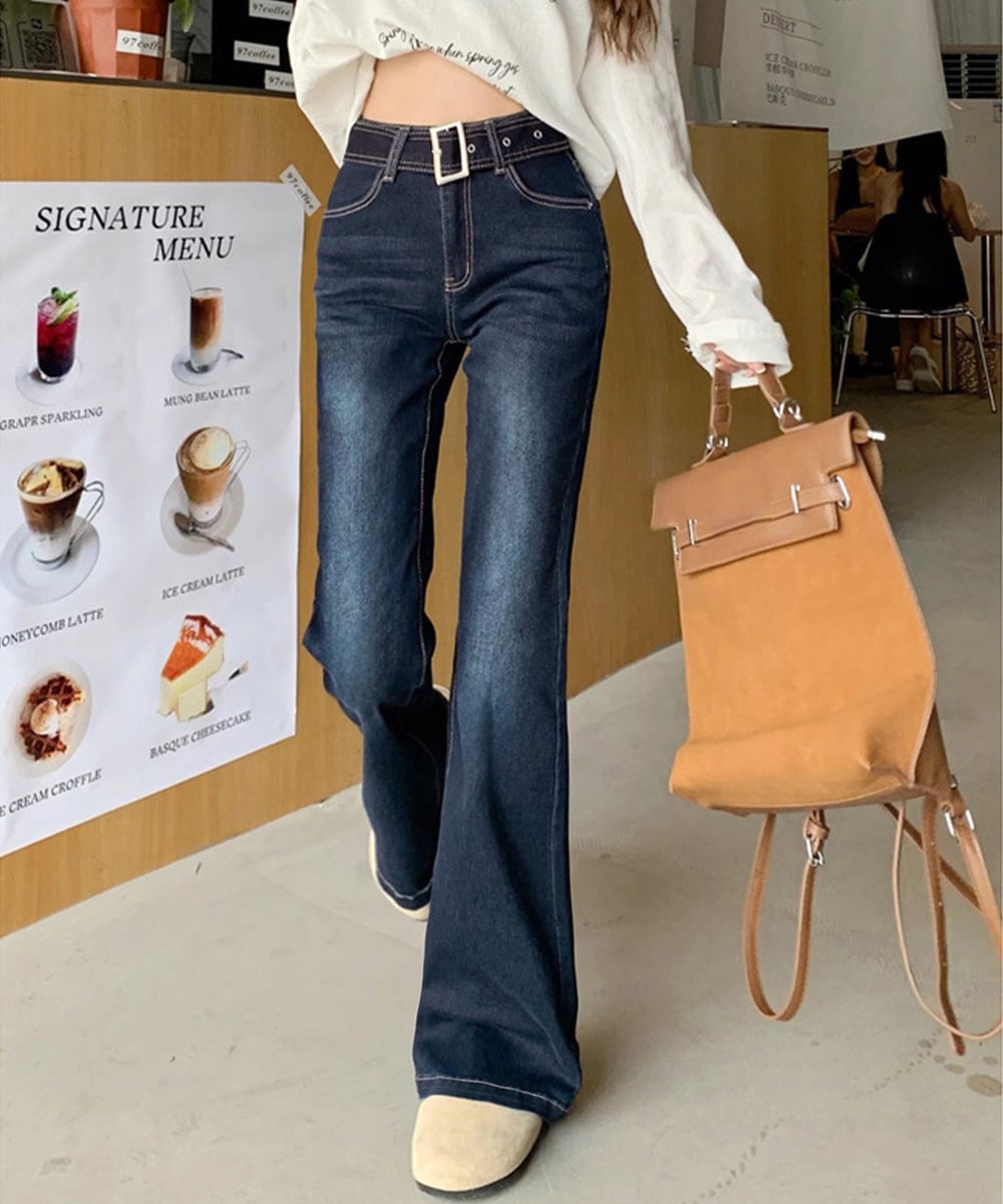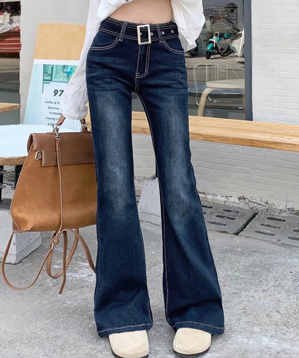 ベルト付き デニムスキニー 韓国風 フィット感 着やせ脚長 カジュアル レトロ ロングパンツ 細身 ブーツカットデニム