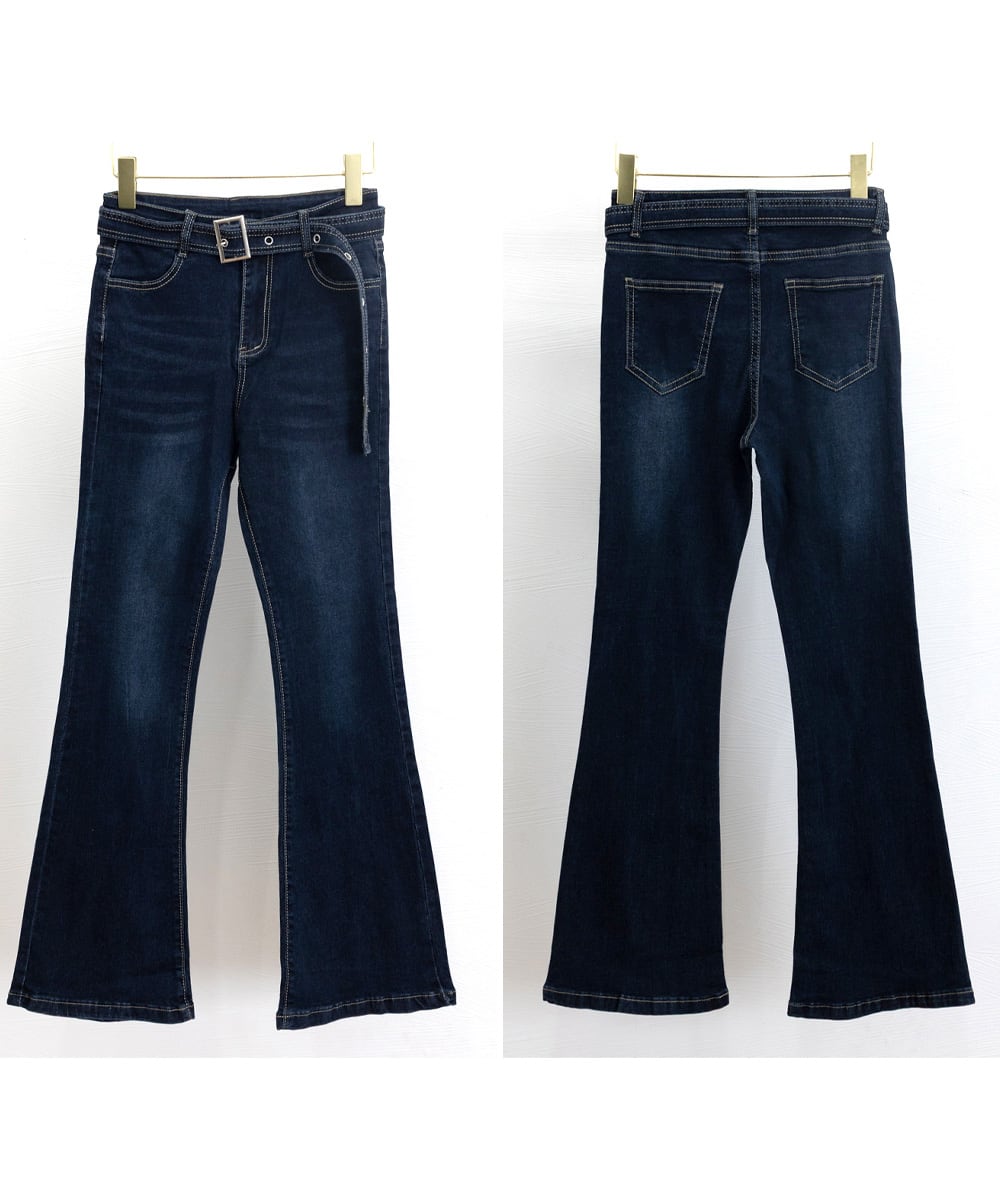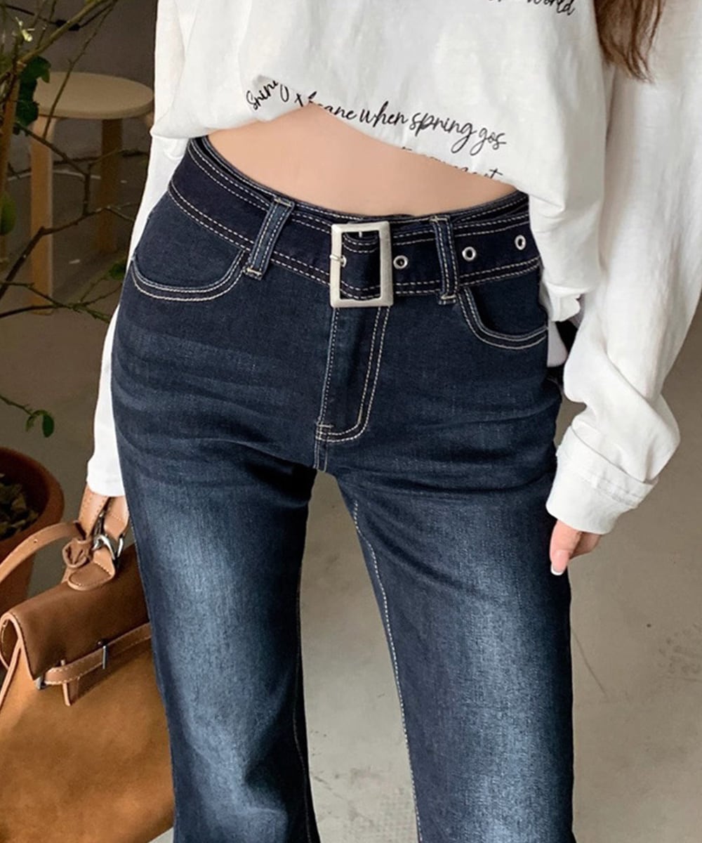 美脚を引き立てるベルト付きデニムパンツ。