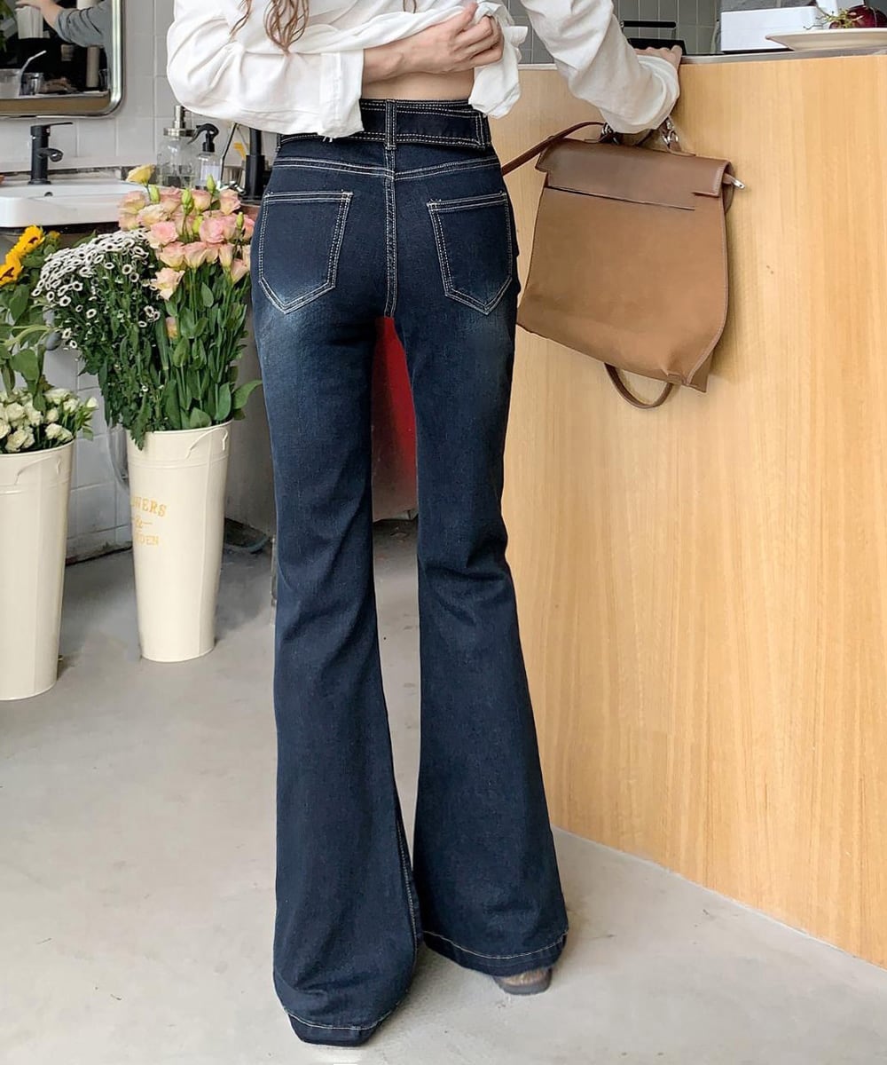 ハイウエスト仕様で脚を長く見せ、トレンド感のあるフレアシルエットが魅力。