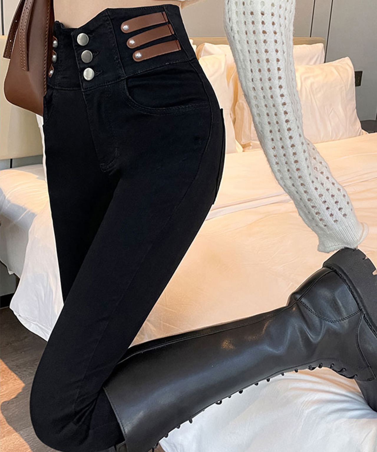 ハイウエスト×スキニーシルエットで脚長に見える。