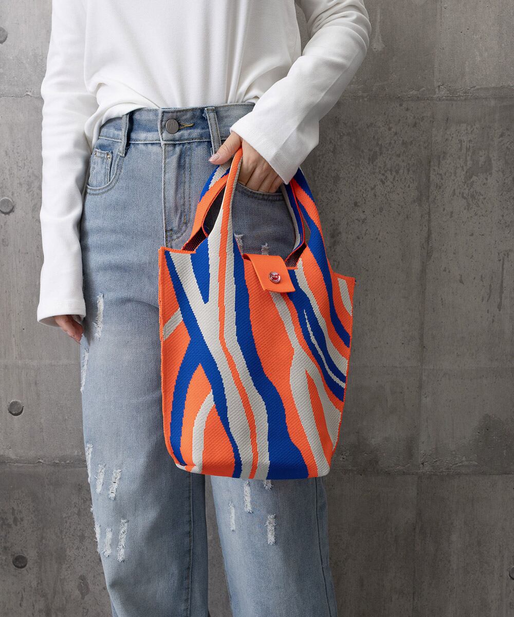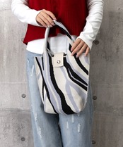 カラフルな幾何学模様が目を引く、ニット素材のトートバッグ。