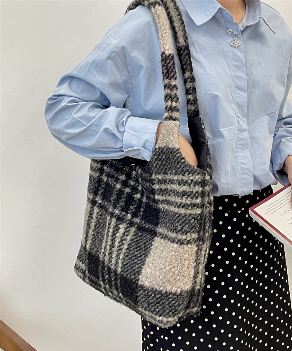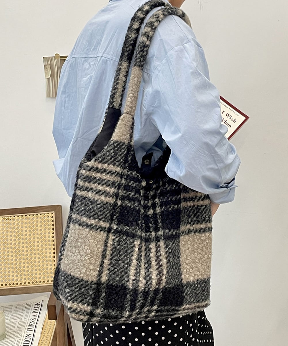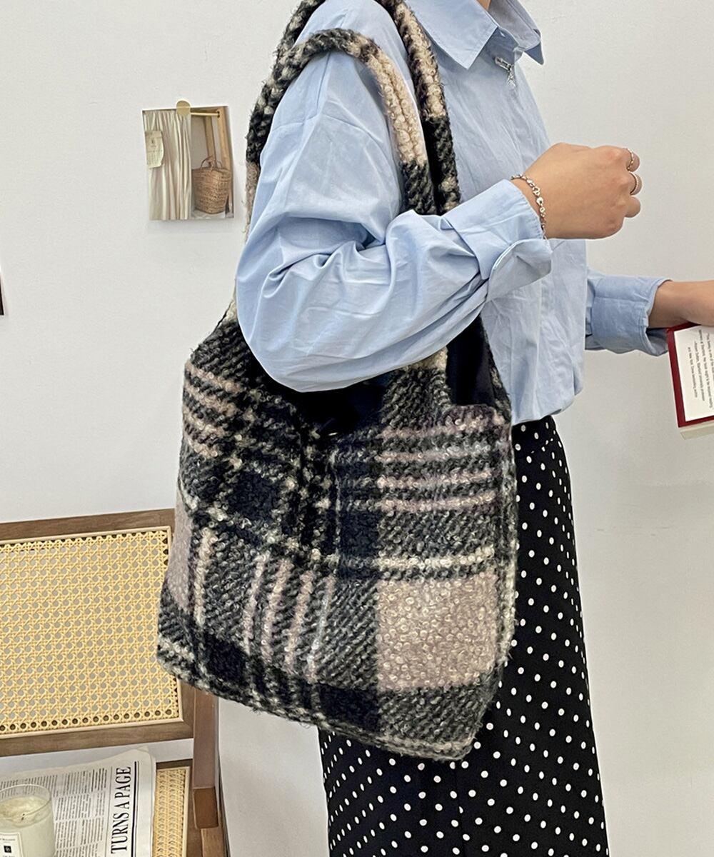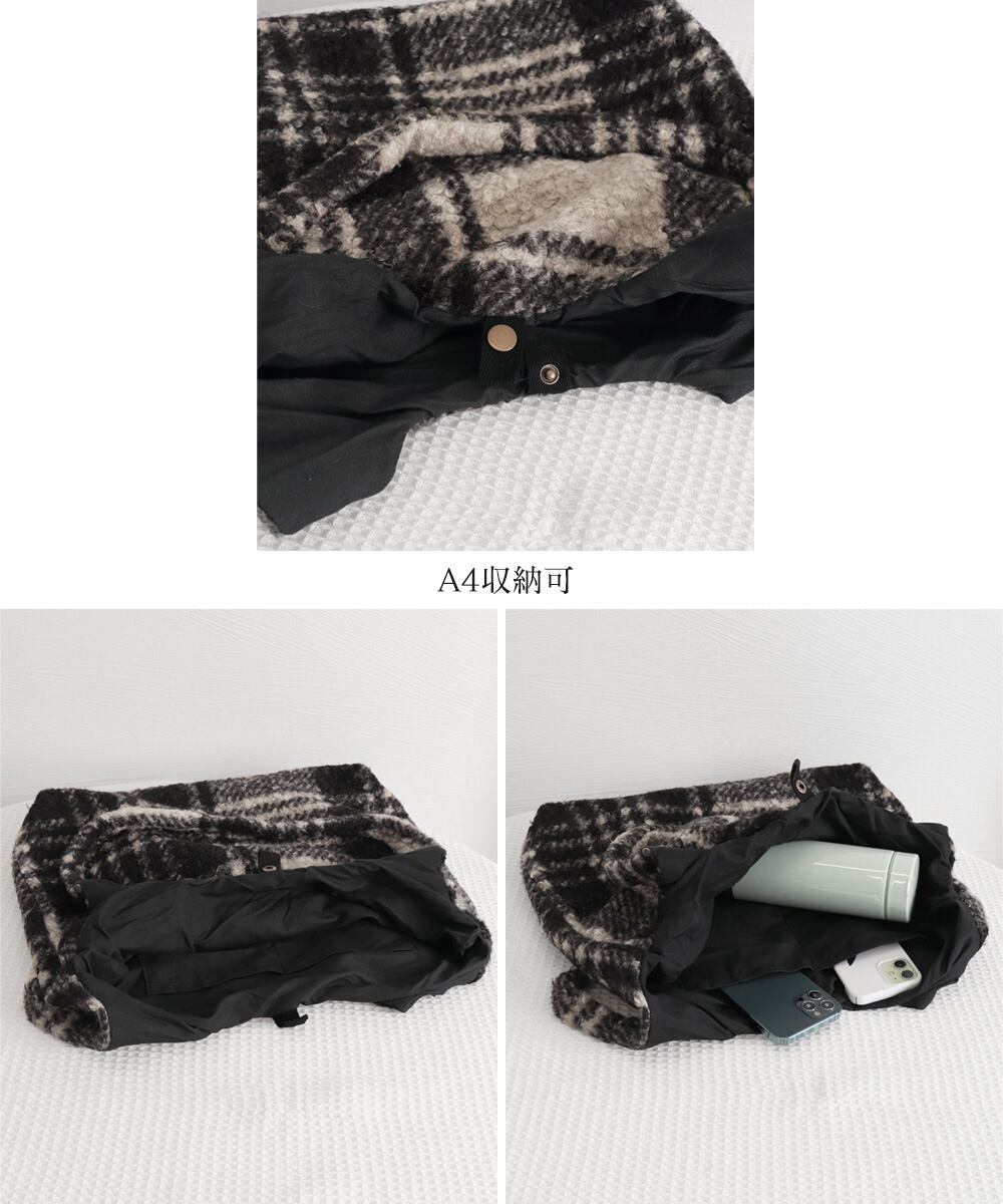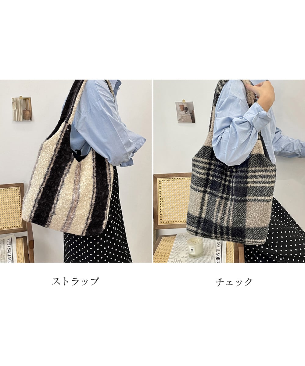 シンプルで使い勝手の良い、チェック柄とストラップ柄のボアトートバッグ。