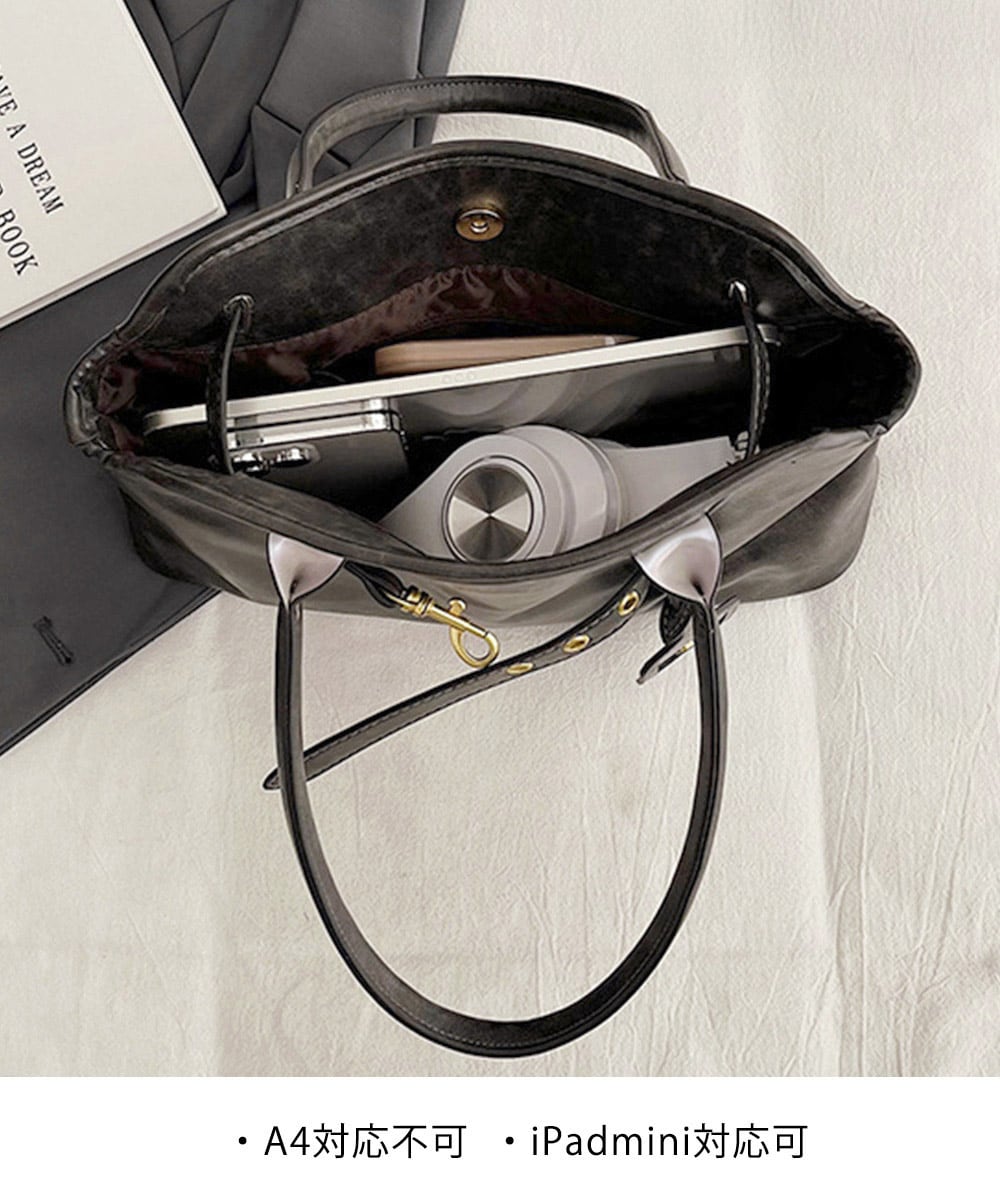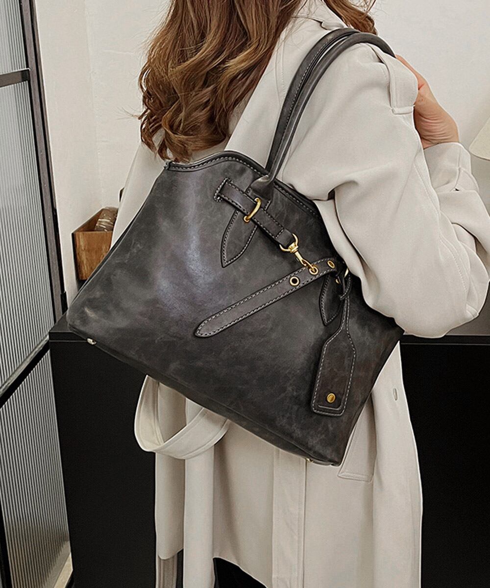 しっとりとした質感のフェイクレザー素材で仕立てた、ヴィンテージ感漂うトートバッグ。