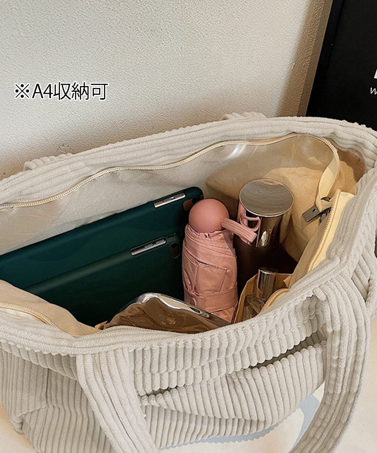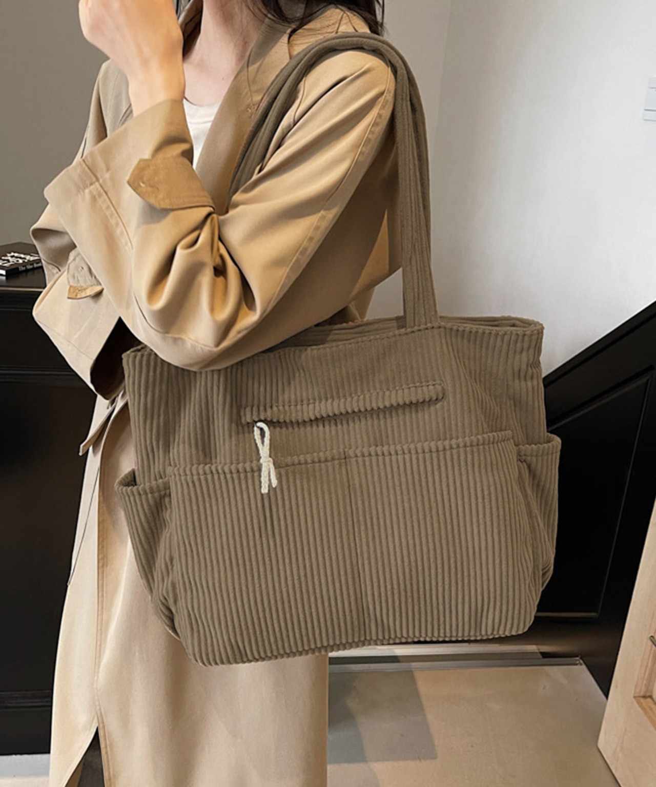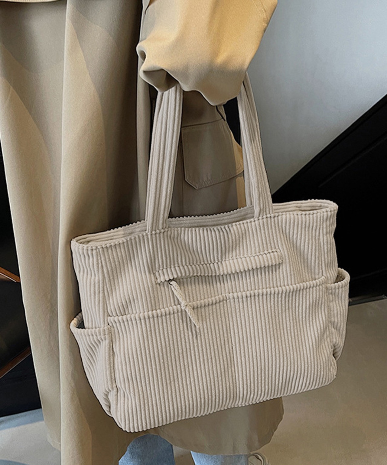 柔らかなコーデュロイ素材で仕上げた、大容量のトートバッグ。