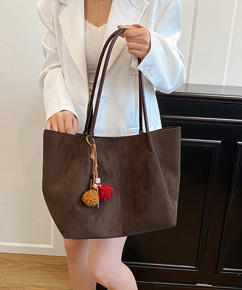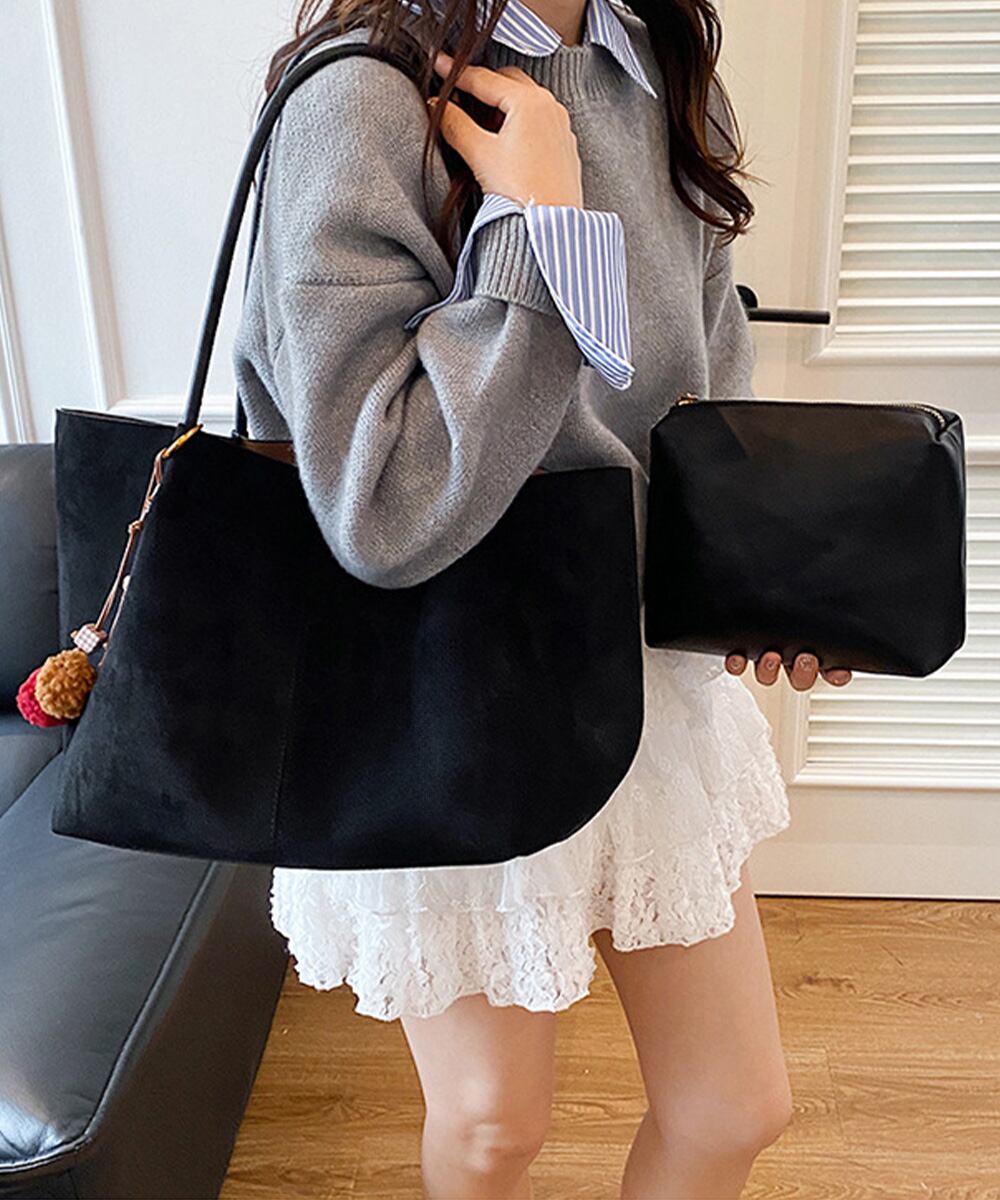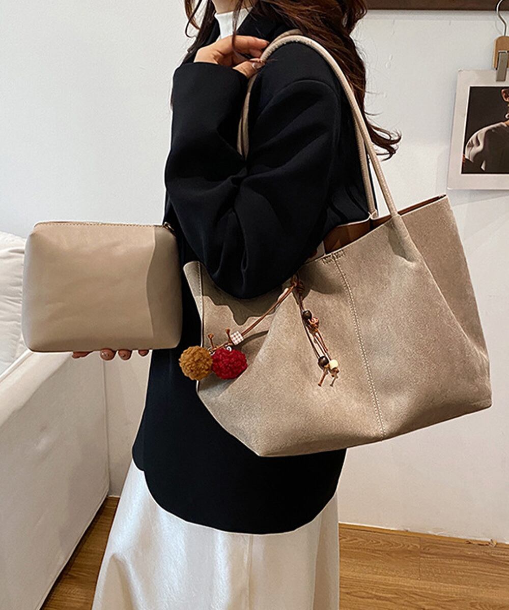 落ち着いたスエード調素材を使用した、大容量で使い勝手の良いトートバッグ2点セット。