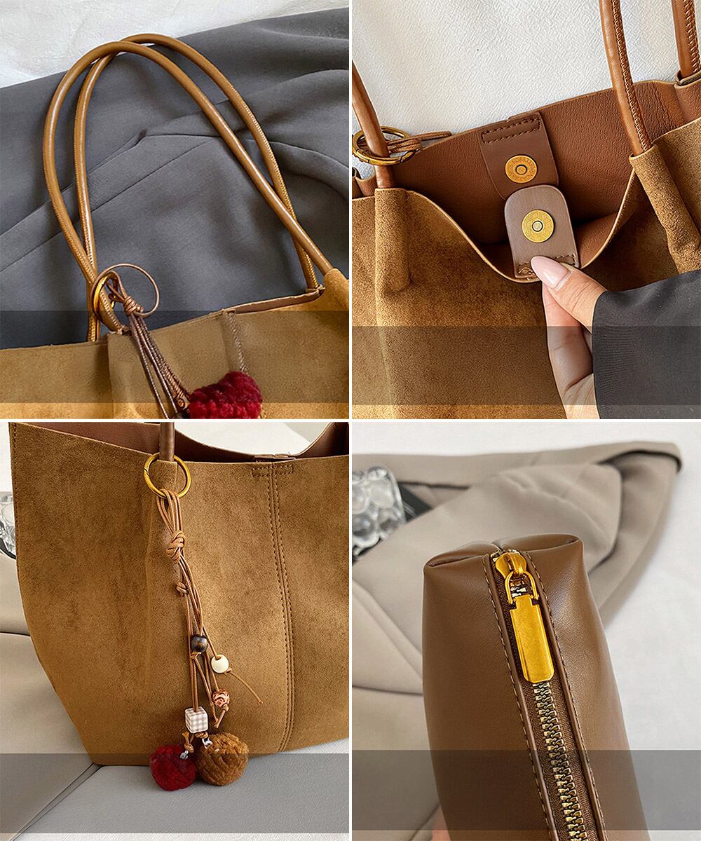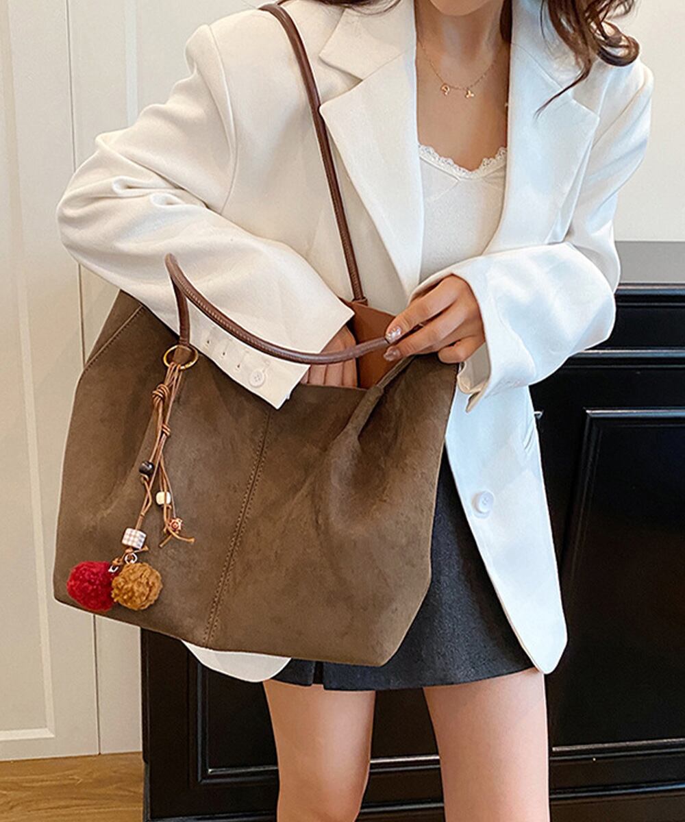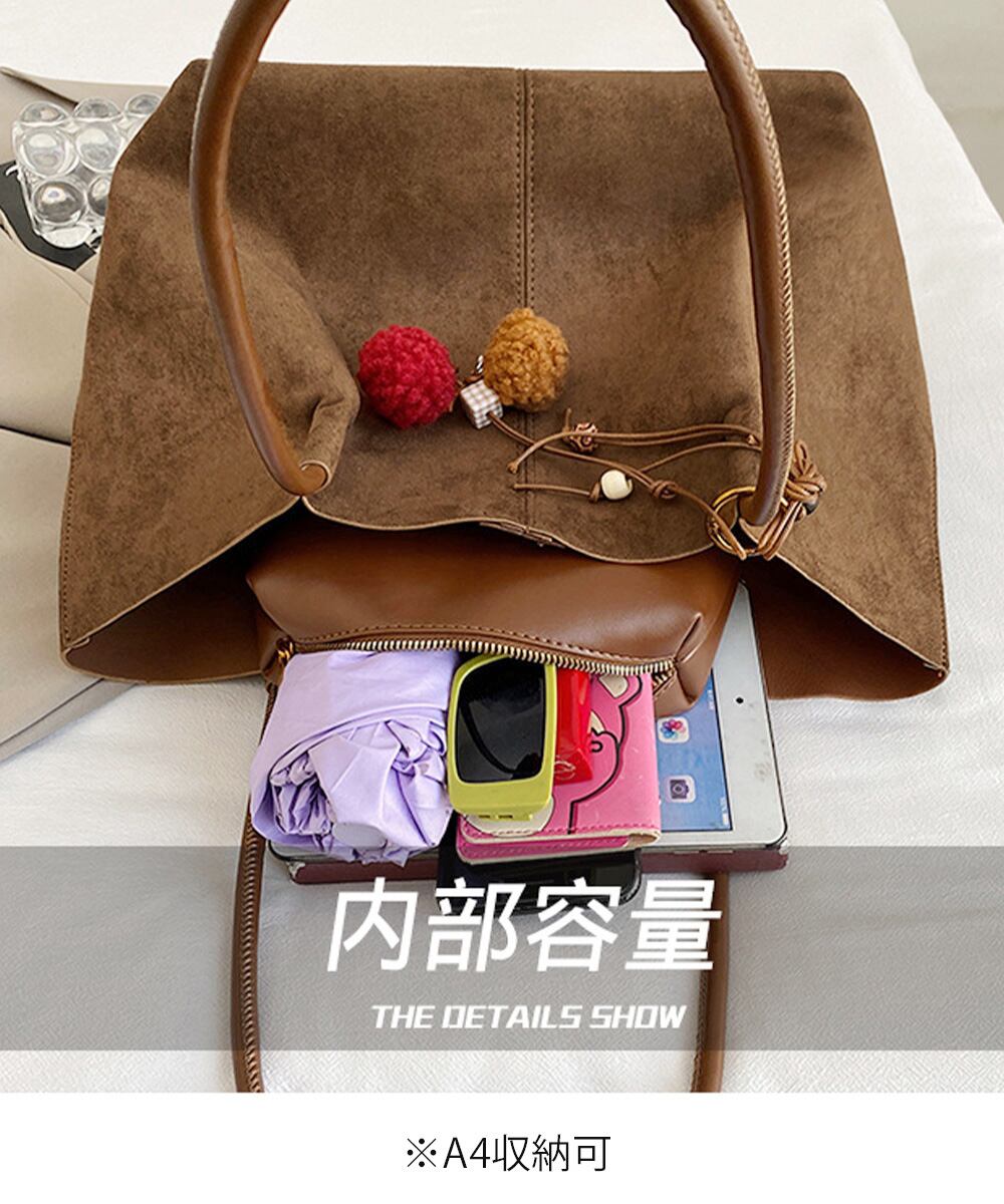 落ち着いたスエード調素材を使用した、大容量で使い勝手の良いトートバッグ2点セット。