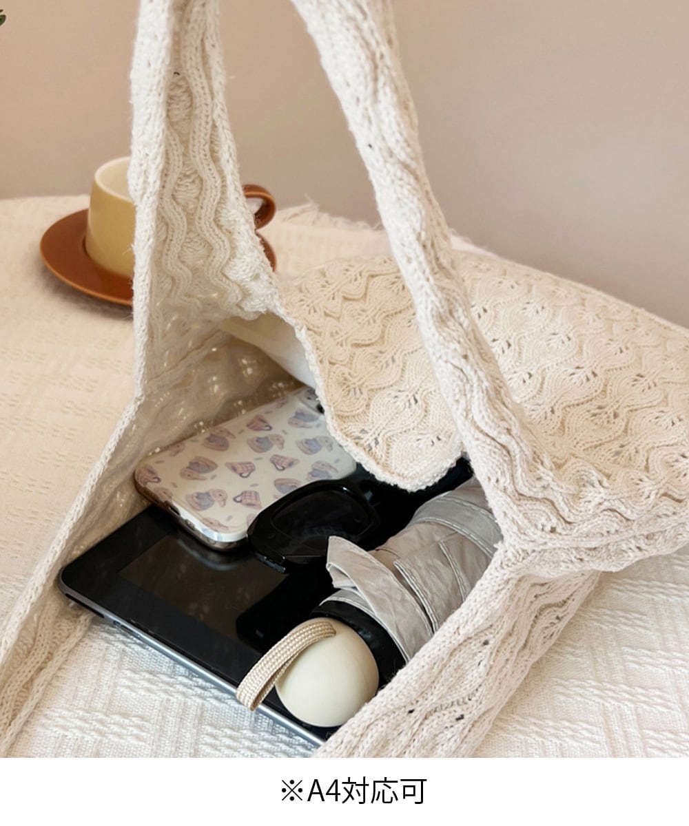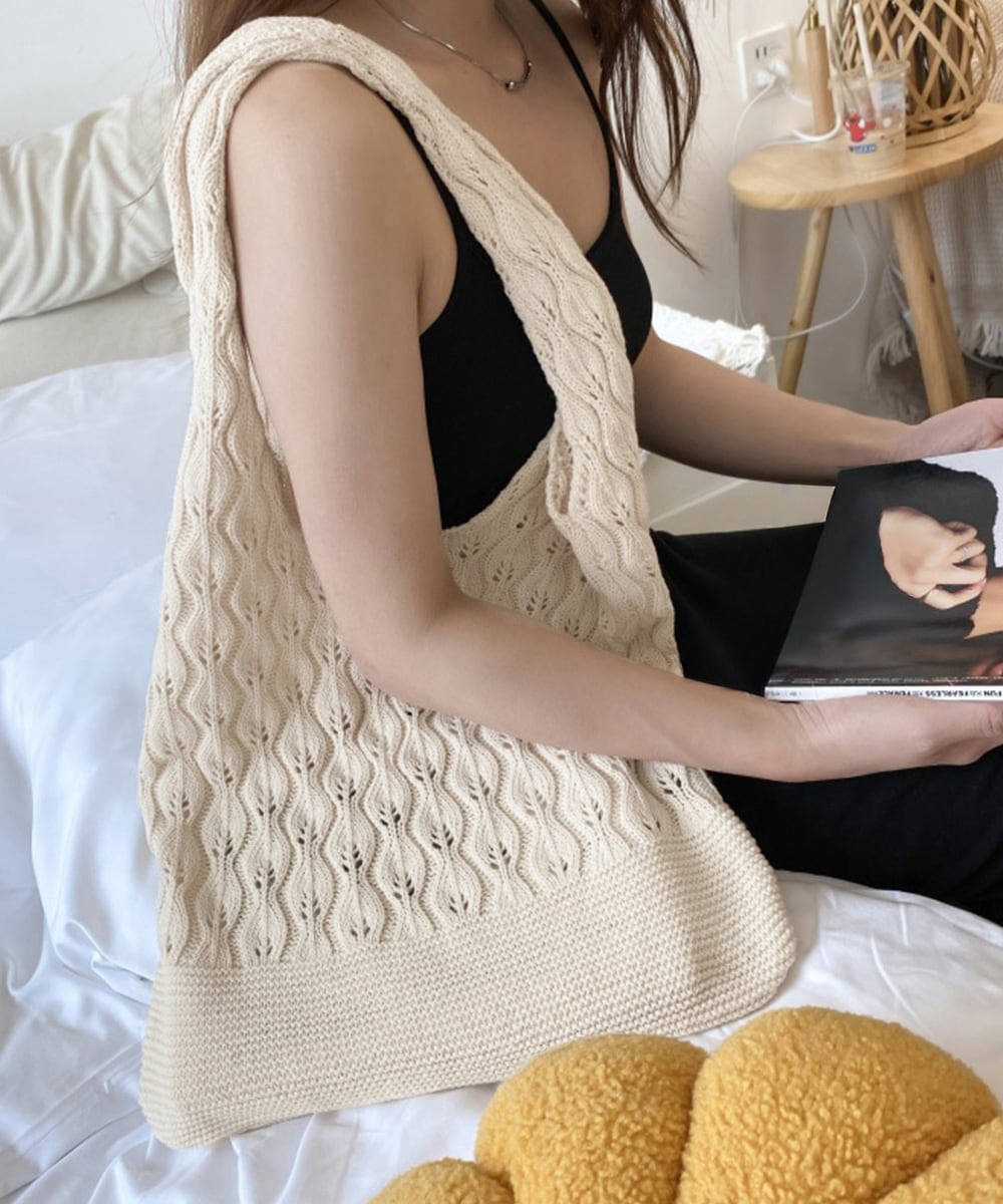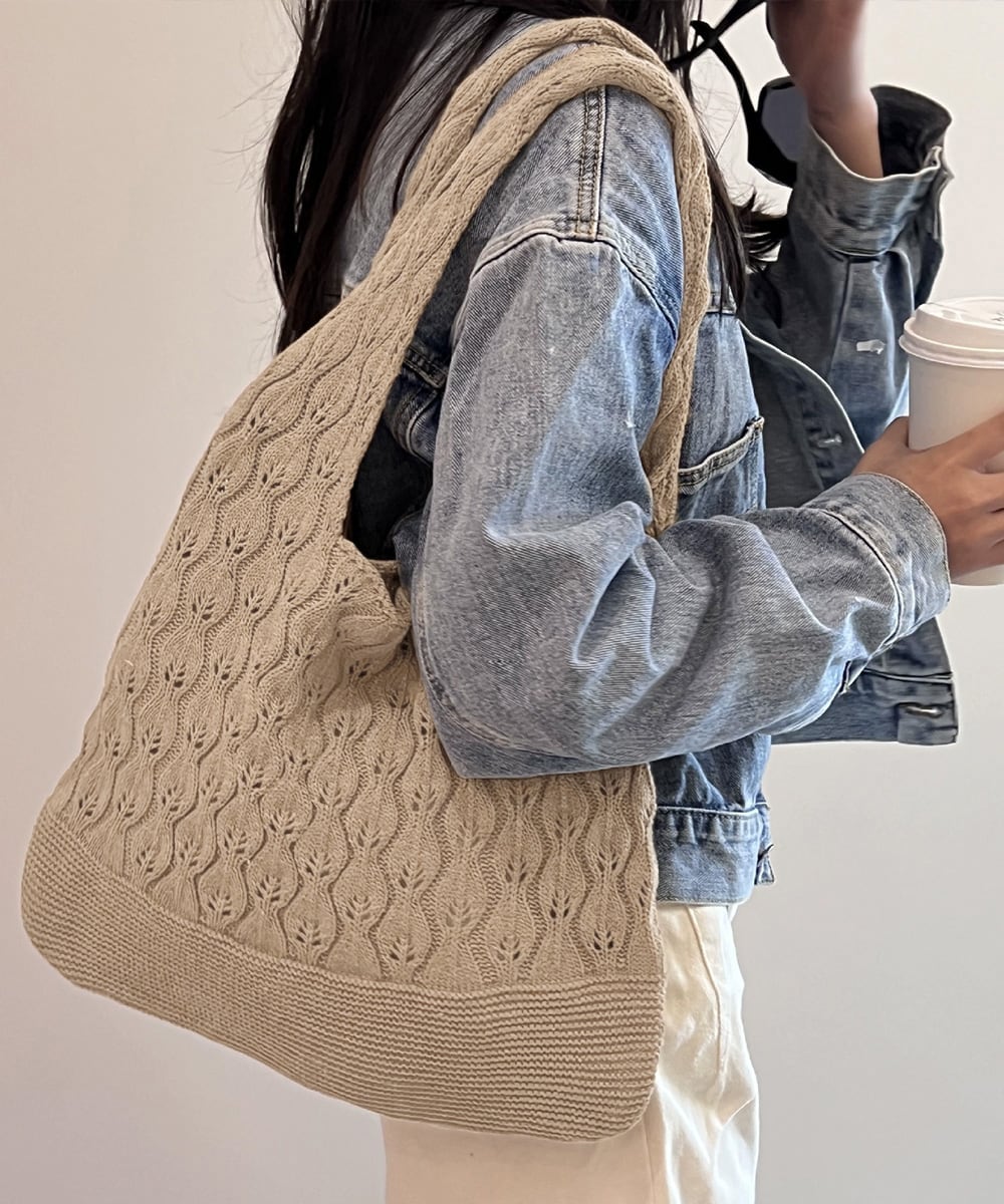 立体感のある編み柄とやわらかな風合いが上品な高級感を演出し、軽量で持ちやすく、コーデに自然になじむ。