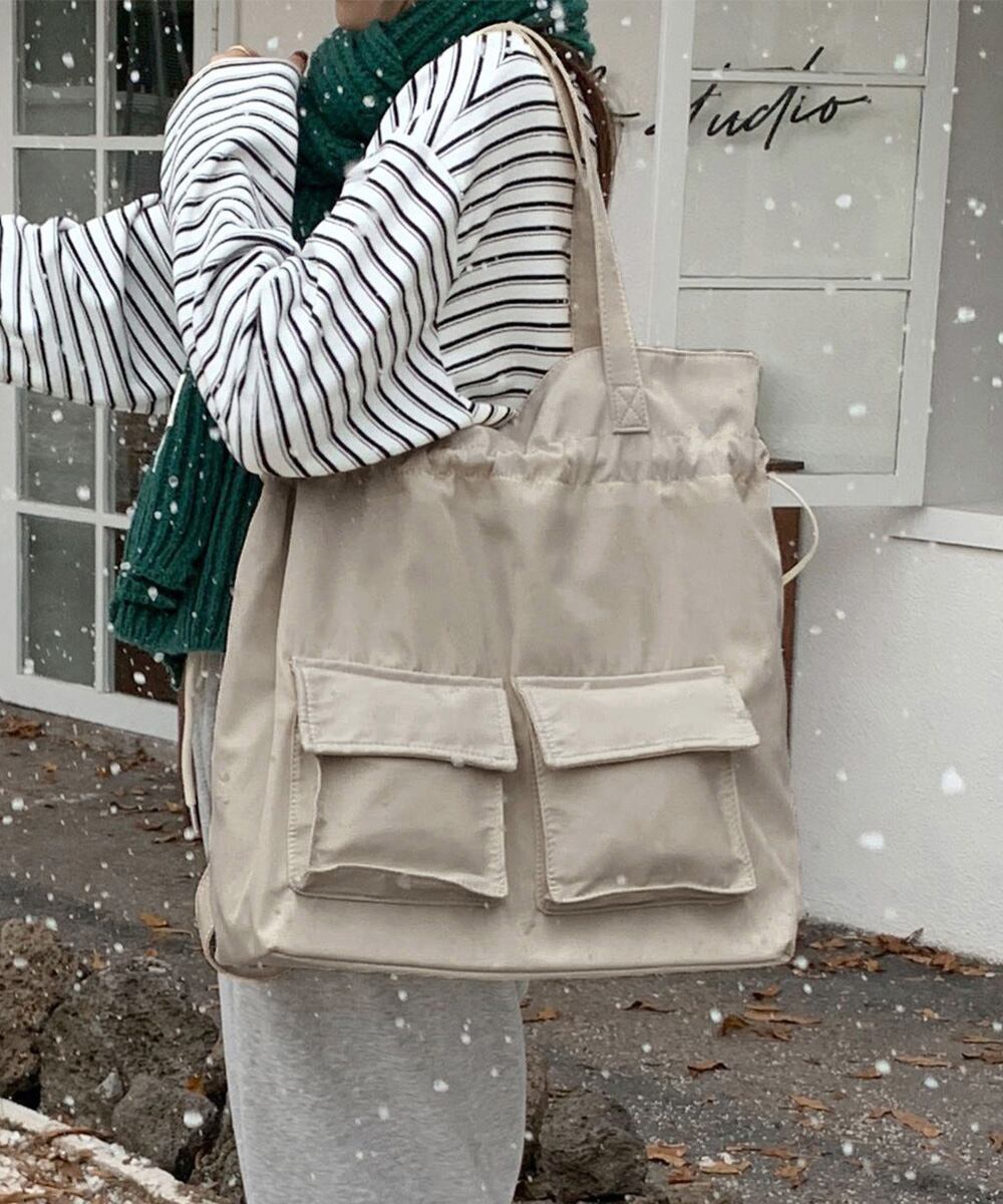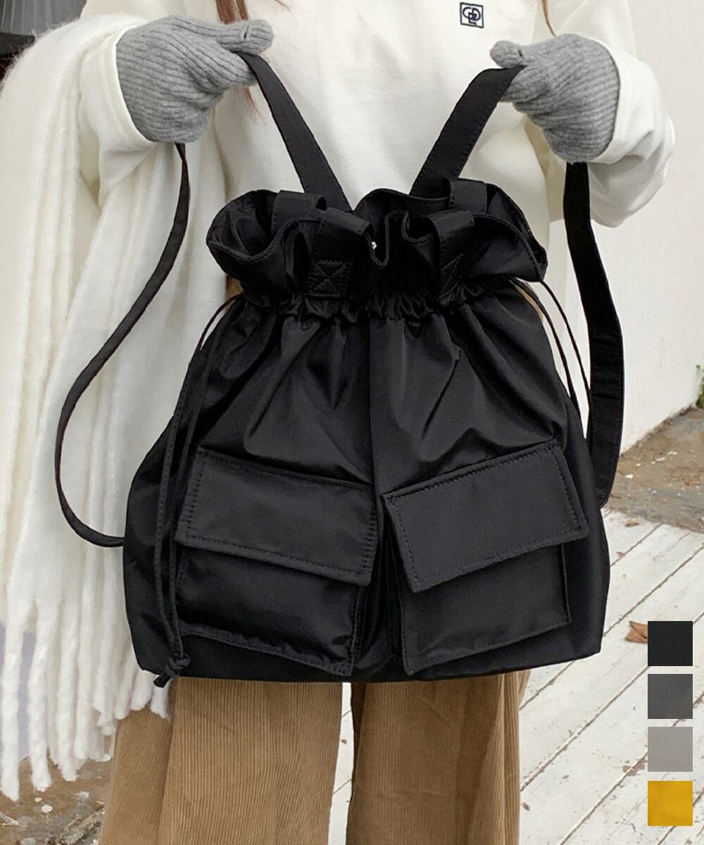 フロントのフラップポケットとドローストリングデザインがアクセントになり、実用性も抜群。