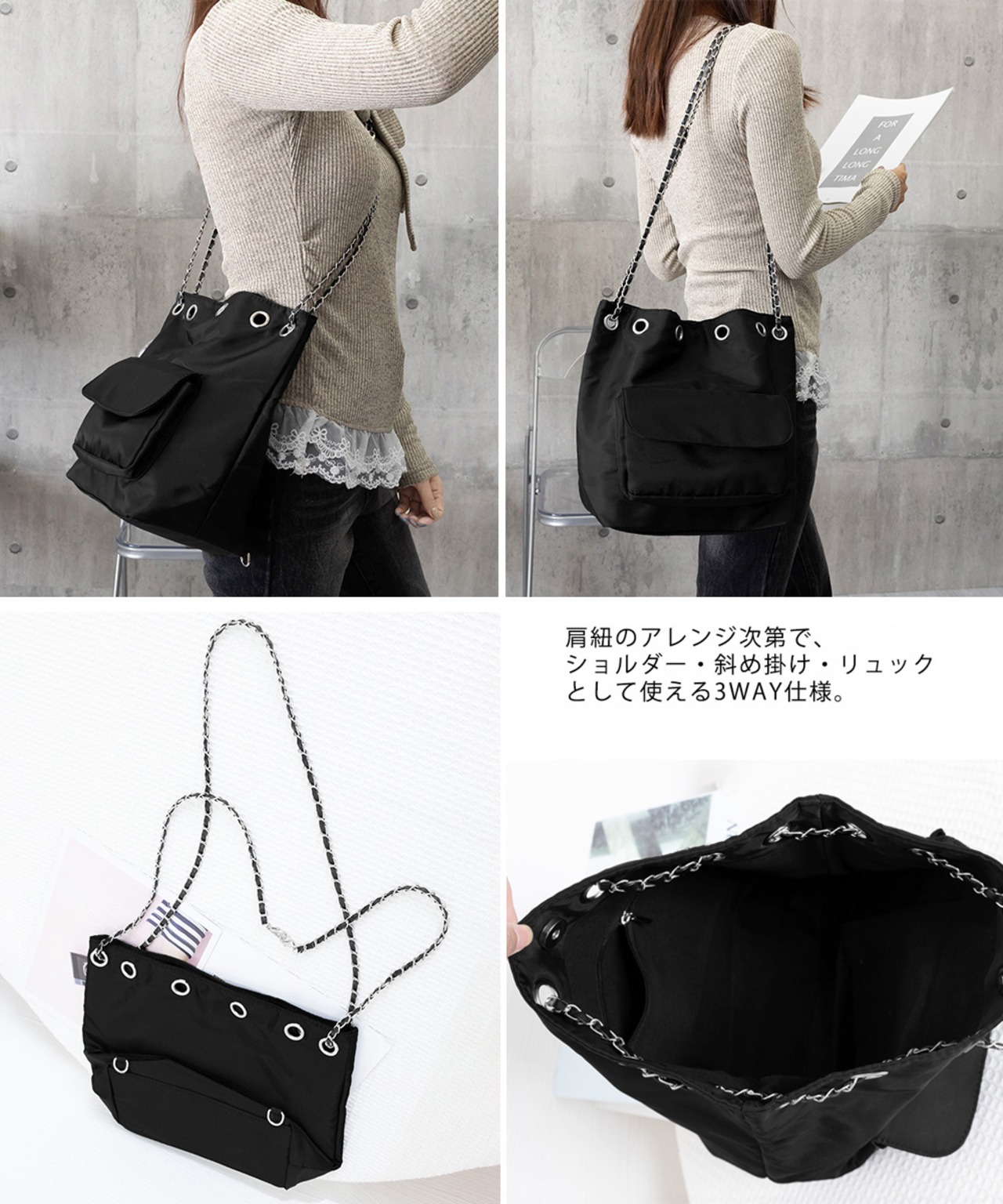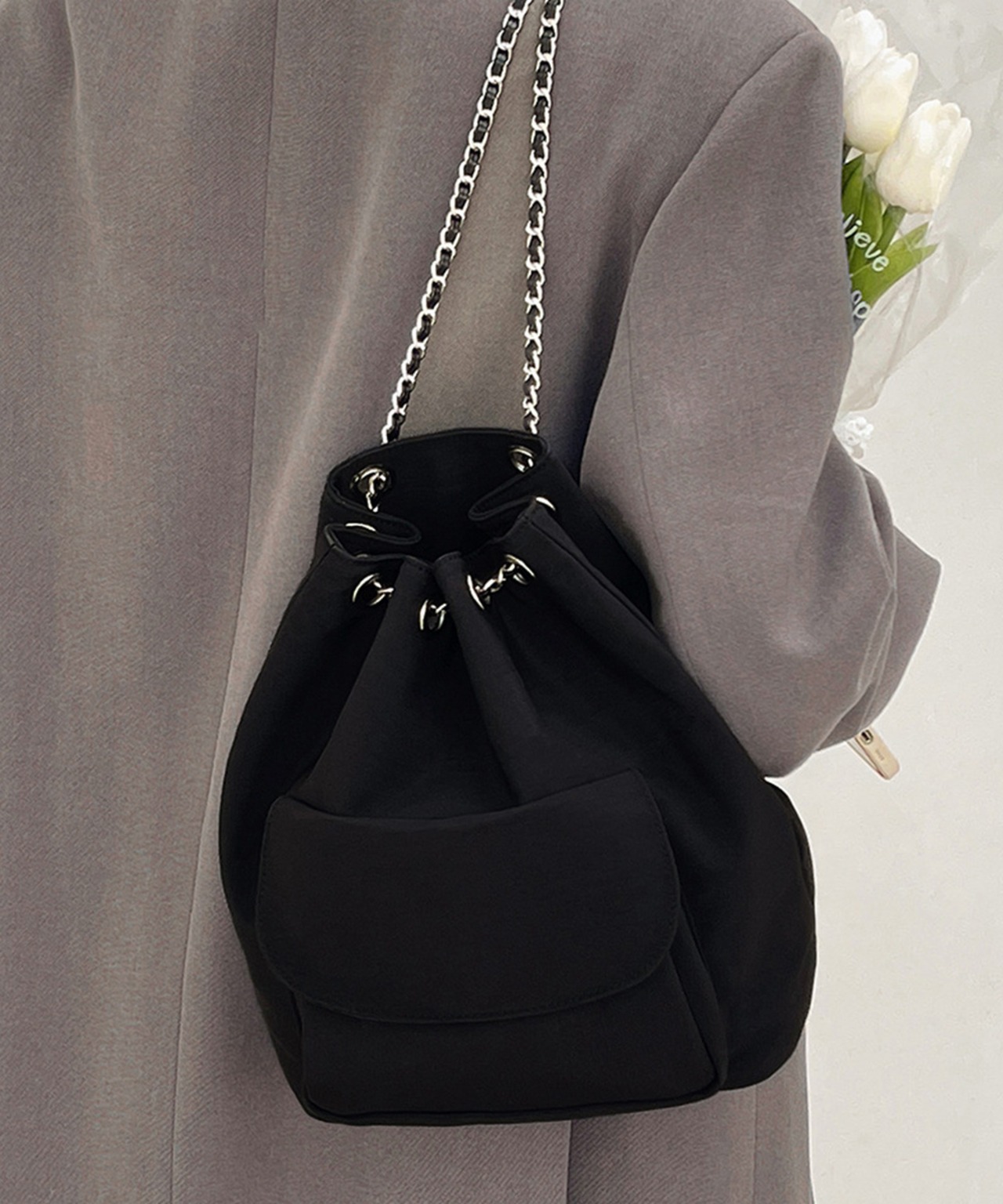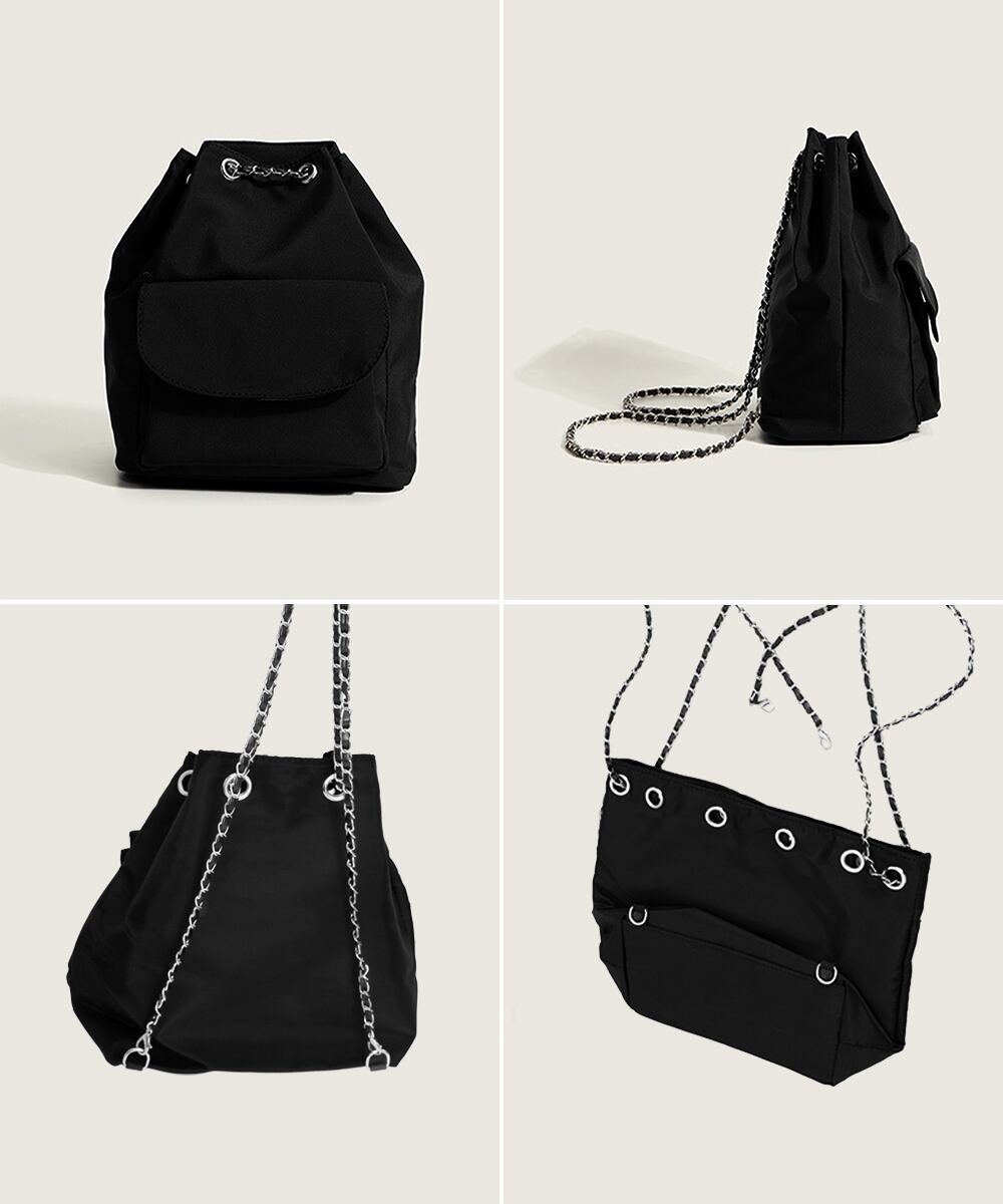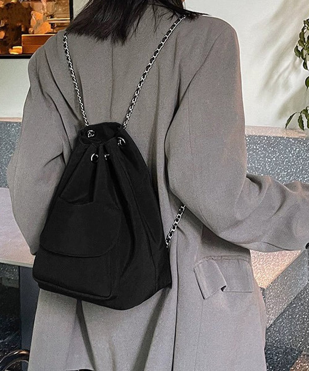 チェーンストラップがアクセントになったシックなドローストリング仕様の3WAYバッグ。
